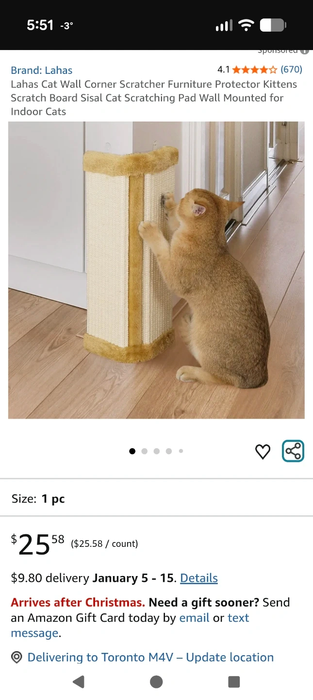 I'm selling a brand new Lahas cat wall corner scratcher! It's a furniture protector for kittens and cats. This sisal cat scratching pad can be wall mounted for indoor cats. It comes with all the necessary hardware for installation!