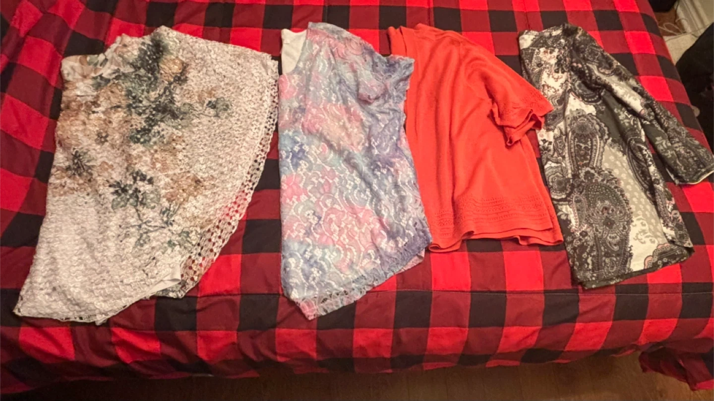 Selling a variety of women's tops. There's a floral print top, a lace top with pink and blue hues, a solid orange short sleeved cardigan and a paisley patterned blouse. All in good condition!