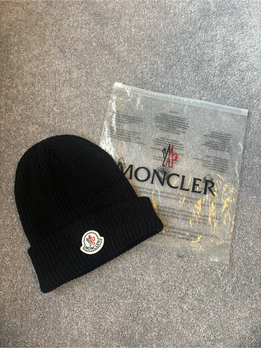 Selling a black knit beanie Moncler. It's in great condition and comes with the original packaging. Perfect for keeping warm and stylish during the colder months!
