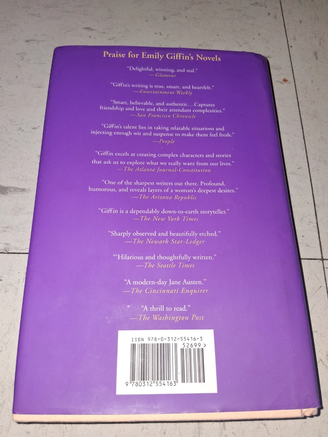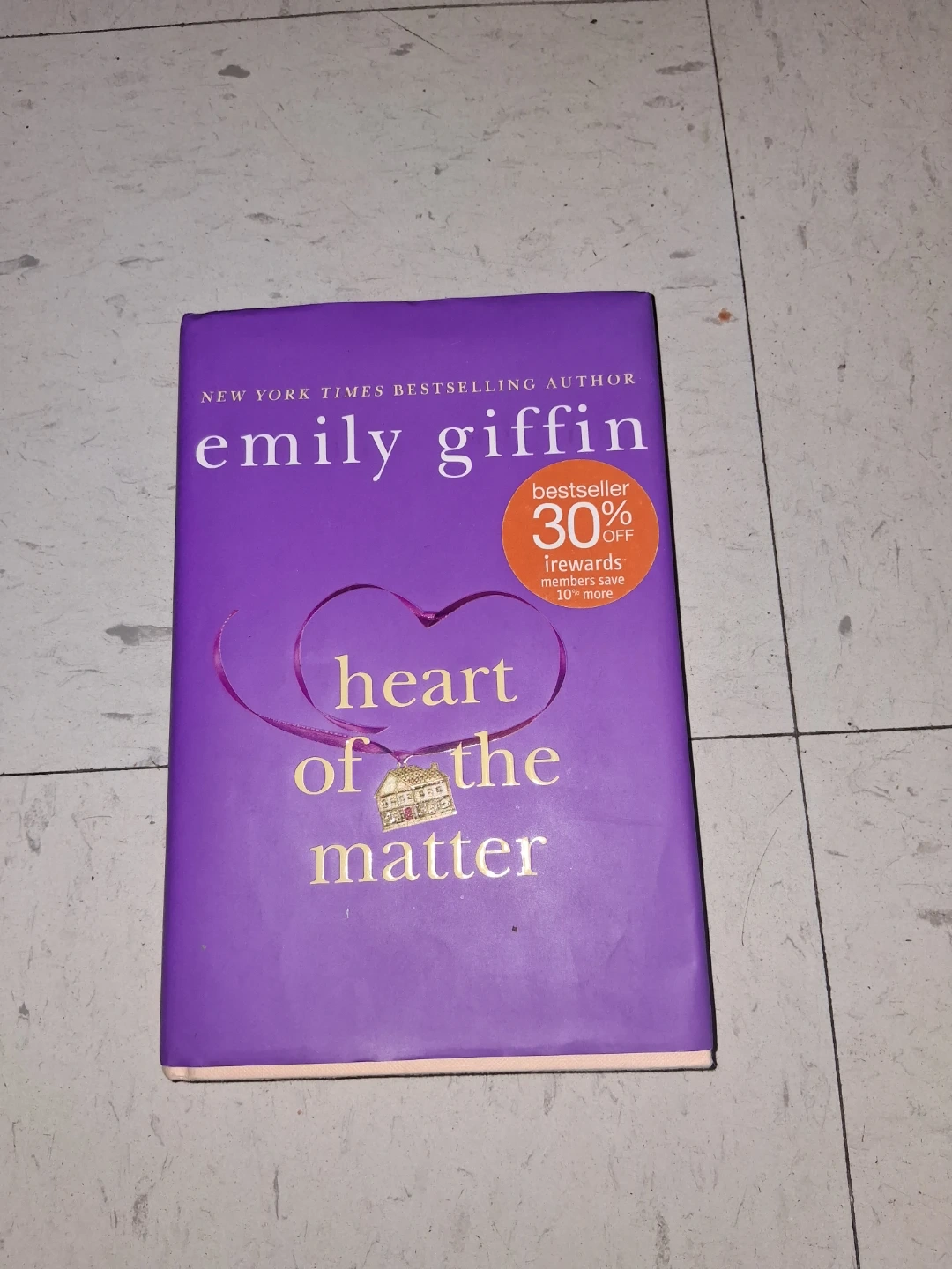 Selling the book "Heart of the Matter" by Emily Giffin. It's a New York Times Bestseller and has received praise from various publications such as "Glamour" and "The Arizona Republic". A great read for anyone who enjoys captivating stories!