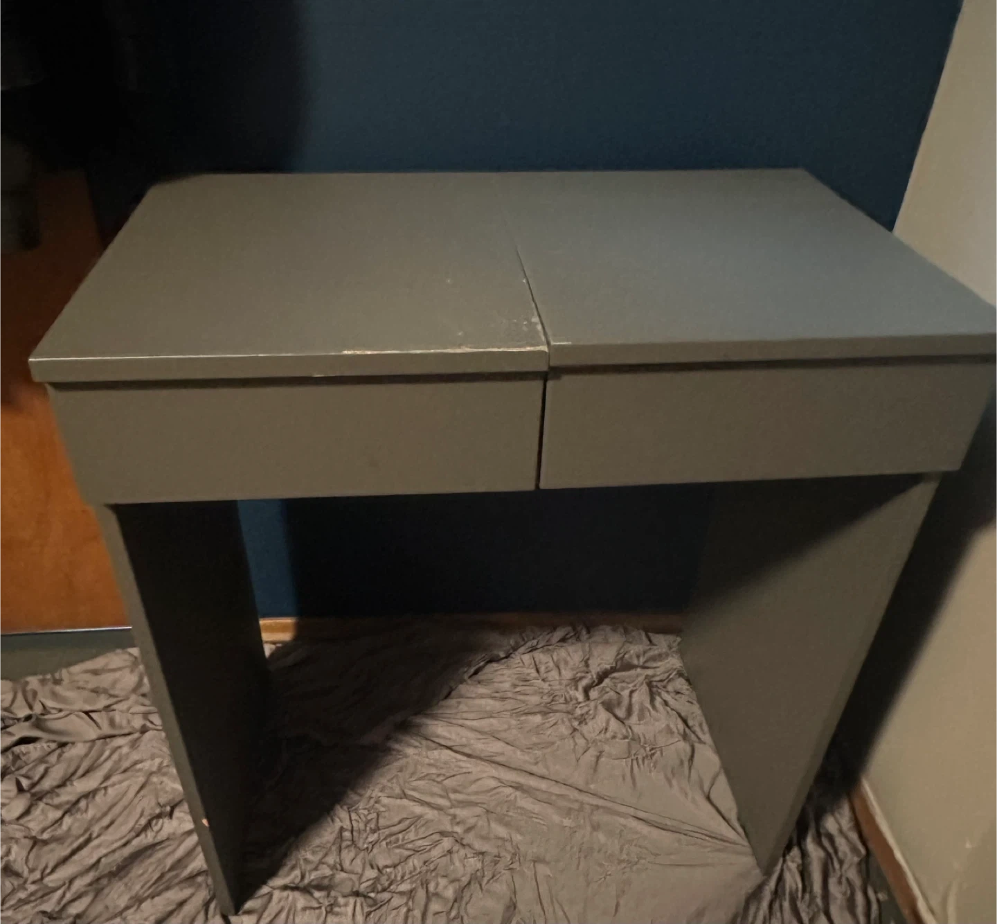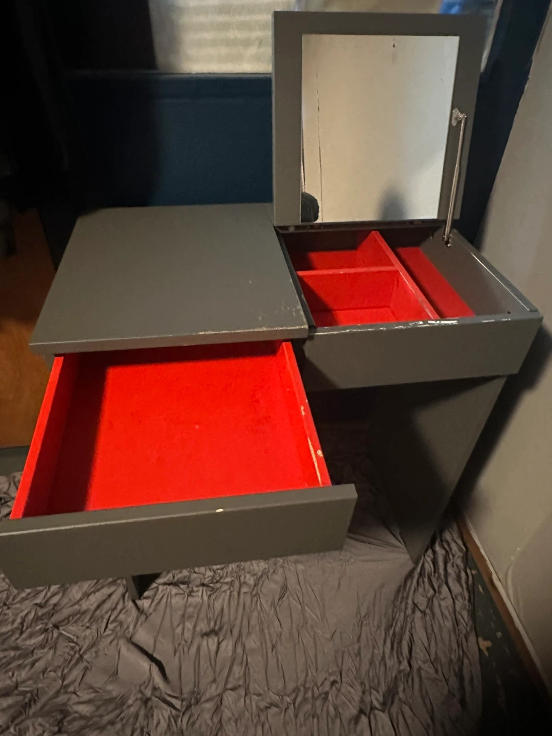 Selling a grey vanity desk that's perfect for getting ready! It features a flip-up mirror and a vibrant red interior in the drawers and compartments. A great addition to any bedroom or dressing area