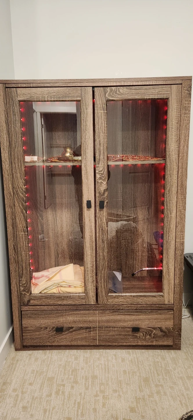 Selling a display cabinet with glass doors and built-in LED lighting! The cabinet has a wood-grain finish and features a drawer at the bottom for extra storage. It's perfect for showing off your favourite items!