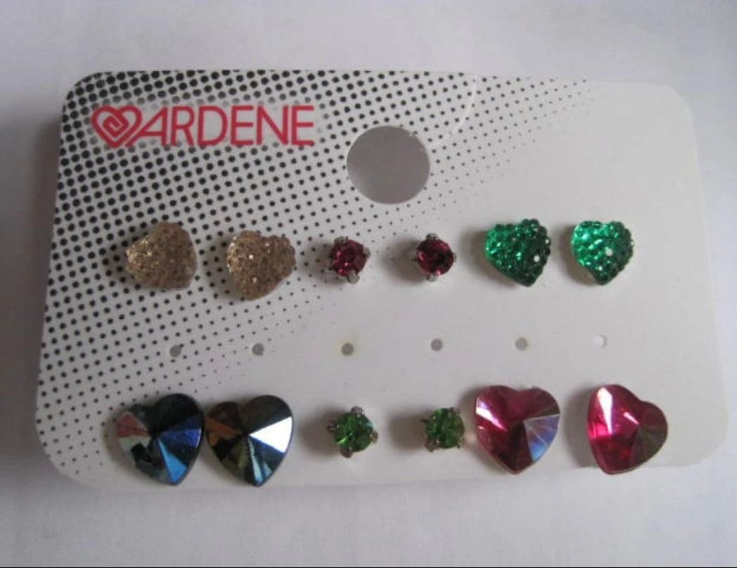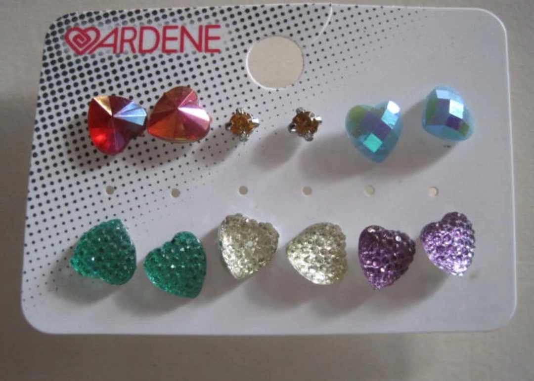 Here's a set of Ardene earrings! 2 cards of 6 pairs each. They come in a variety of colours and shapes. Perfect for adding a little sparkle to your day