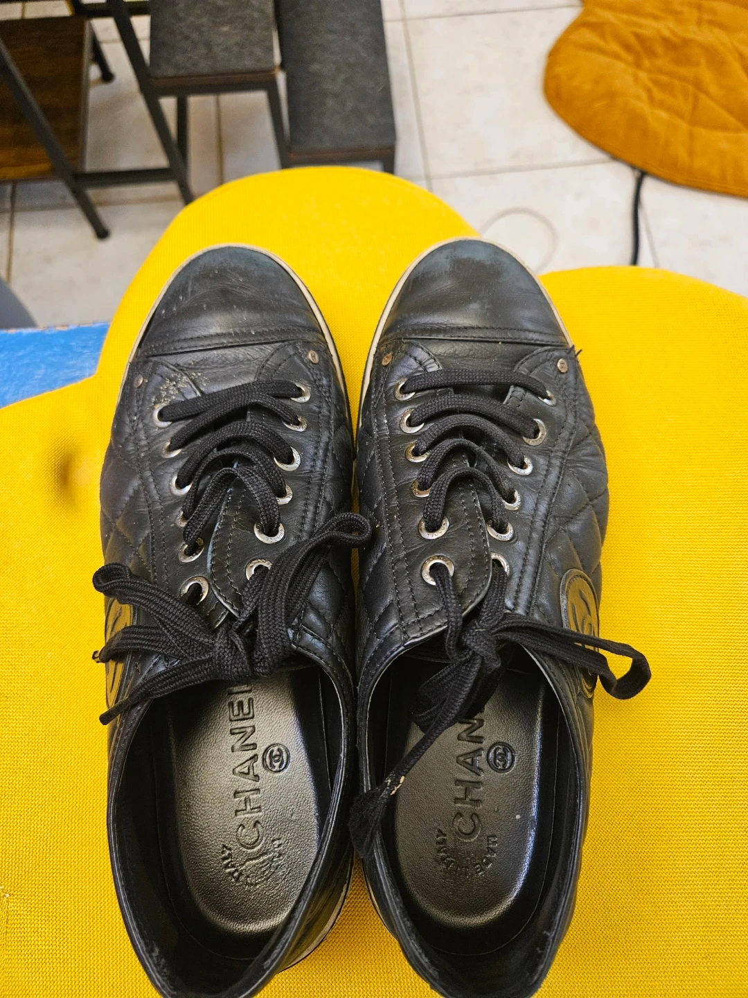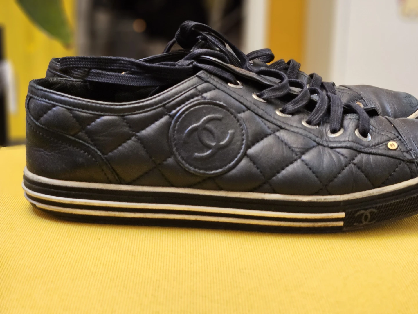 Selling a pair of Chanel black leather sneakers in size 38. They have a quilted design and the Chanel logo on the side. Please take a look at the photos for signs of wear.