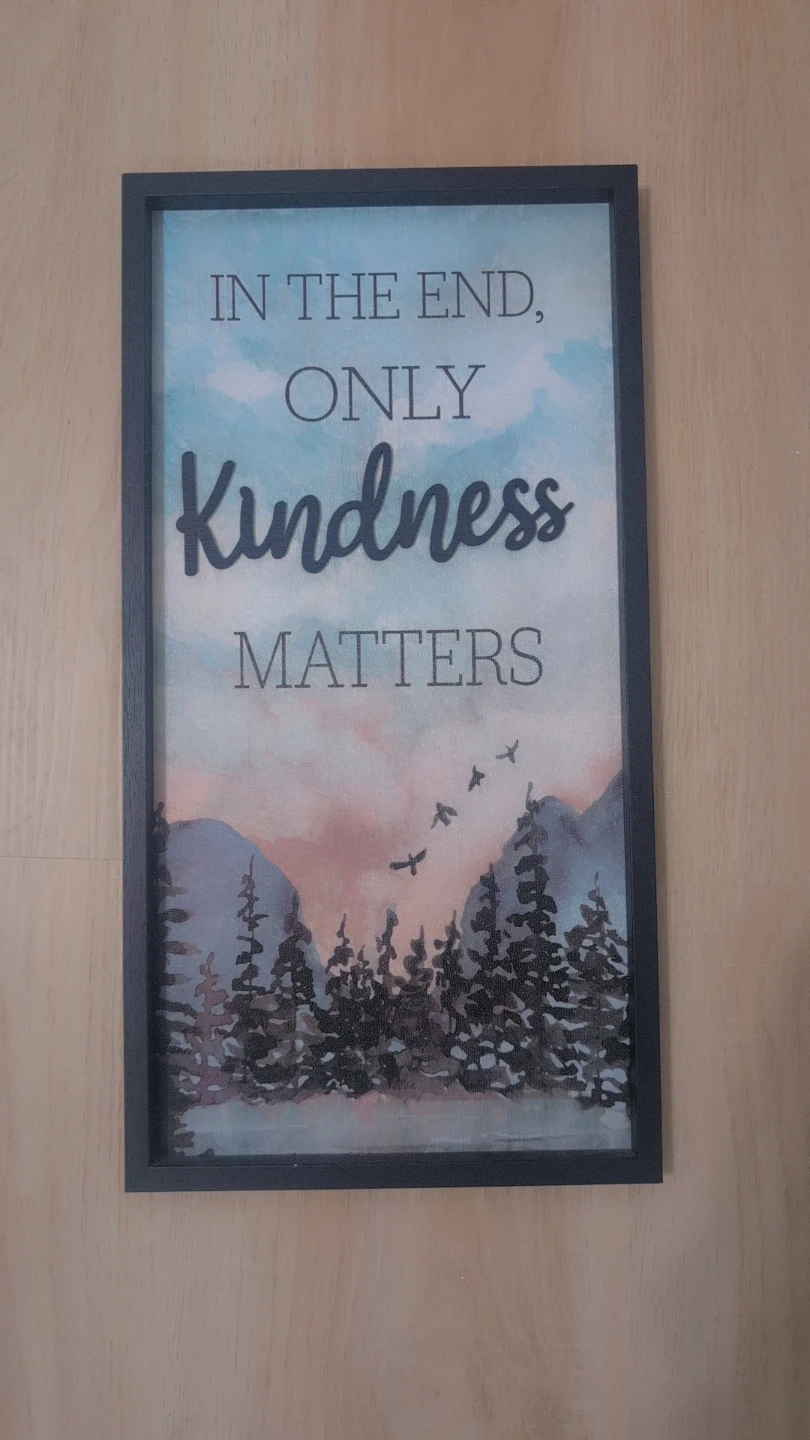 A framed piece of wall art featuring the phrase "In the end, only Kindness matters." It has a lovely landscape design with mountains and trees. Perfect for adding a thoughtful touch to any room!