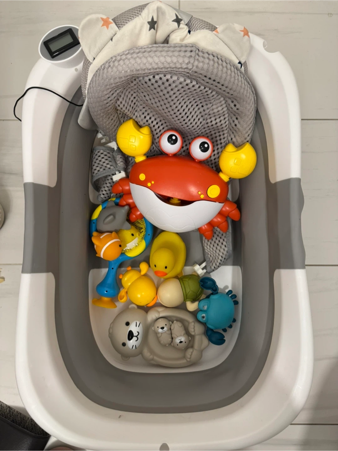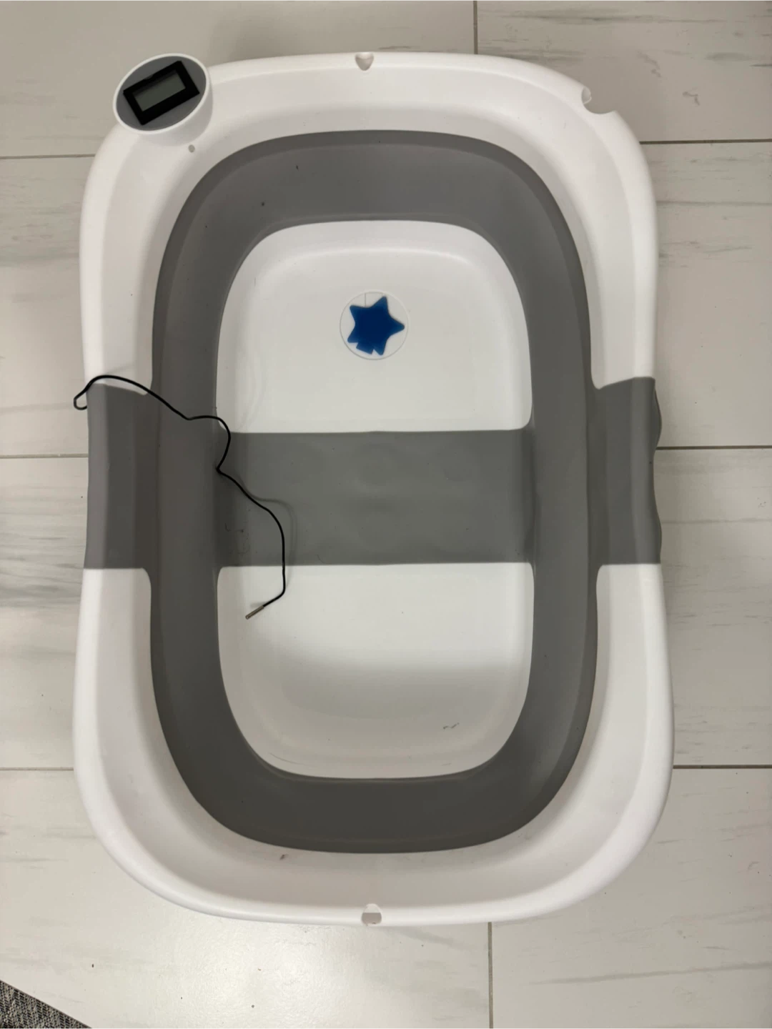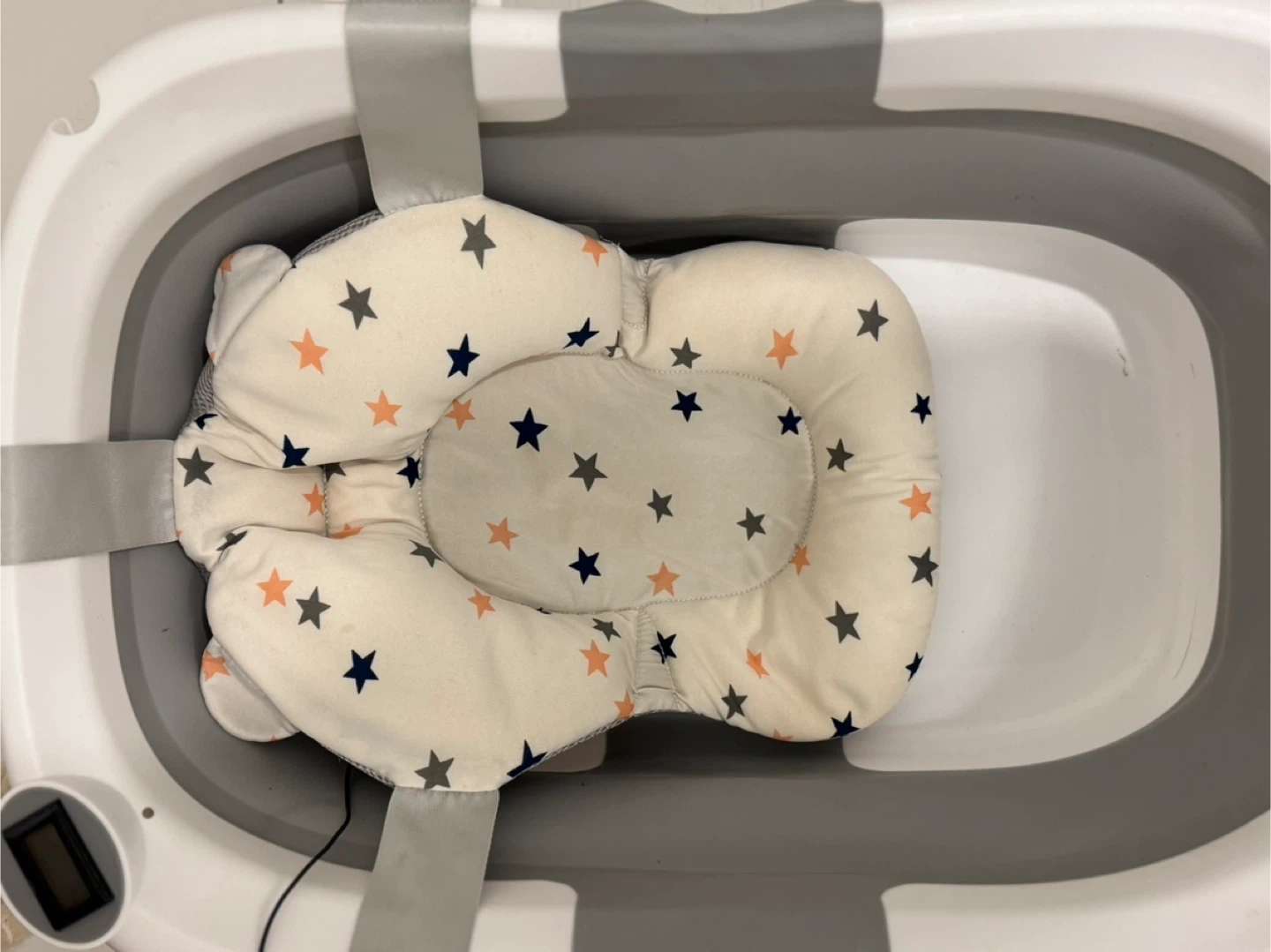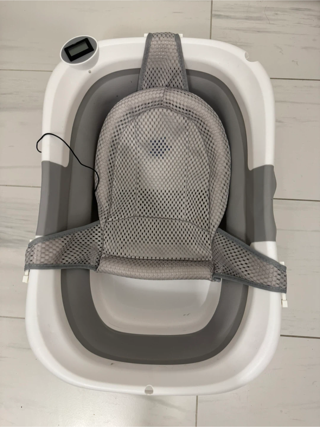 Selling a gently used collapsible baby bathtub. It comes with two different inserts to make bath time easier and safer for your little one. The tub is white and grey, and it's super easy to store since it folds down. Great for saving space!
