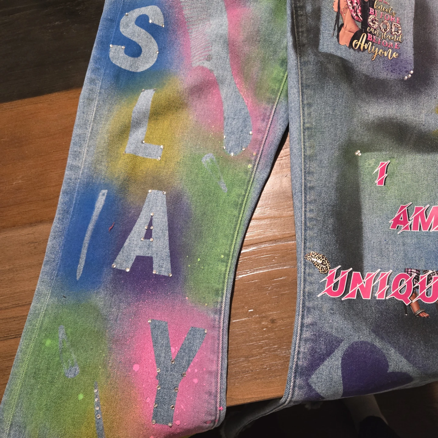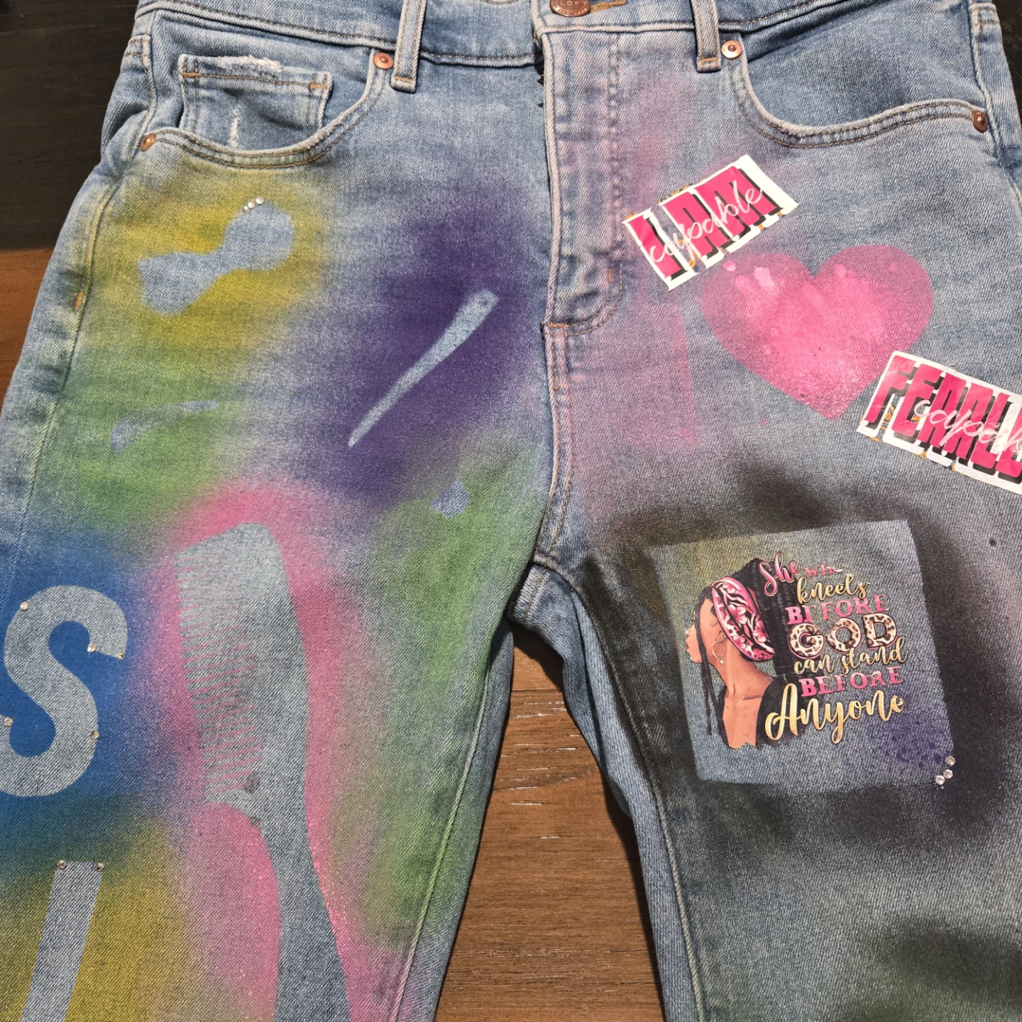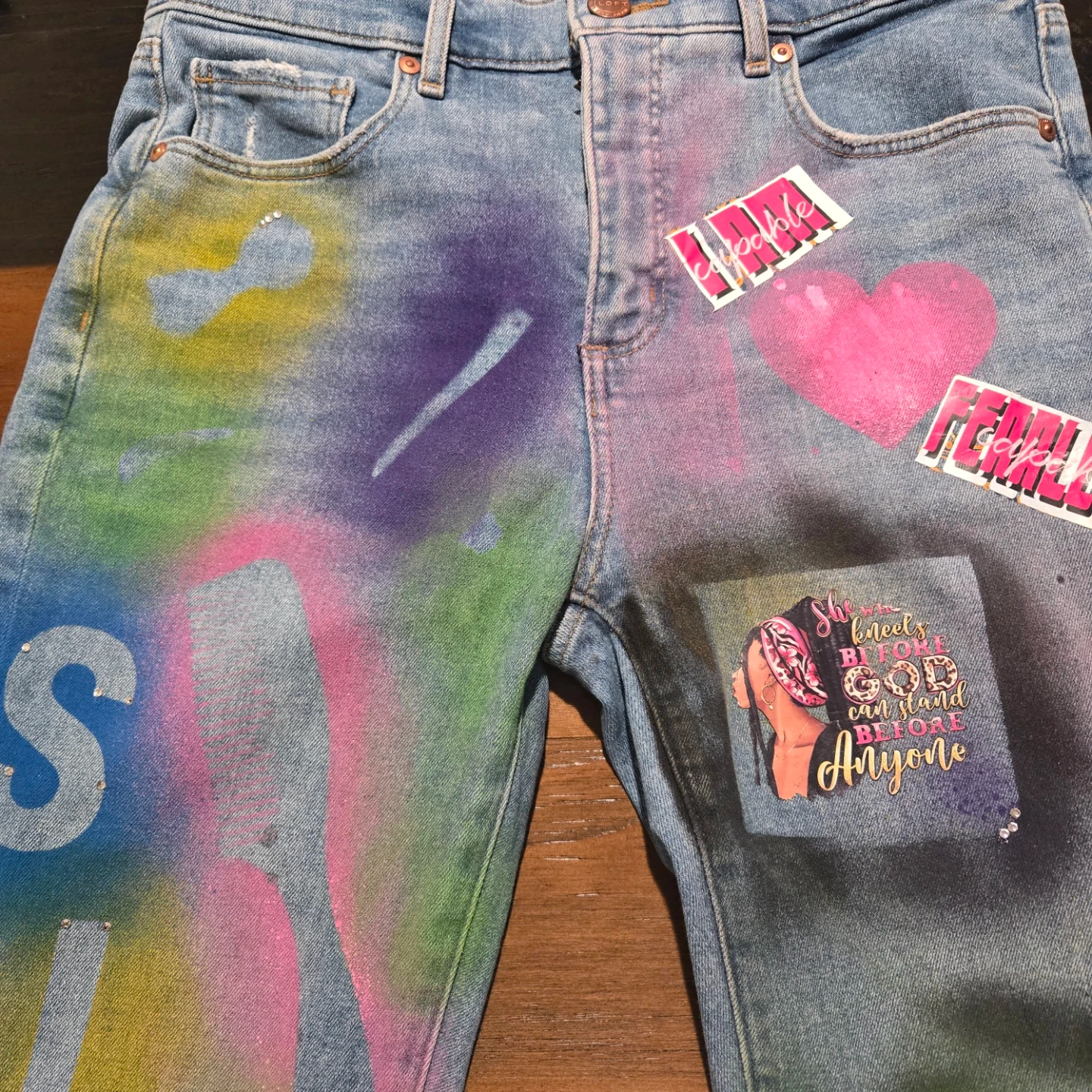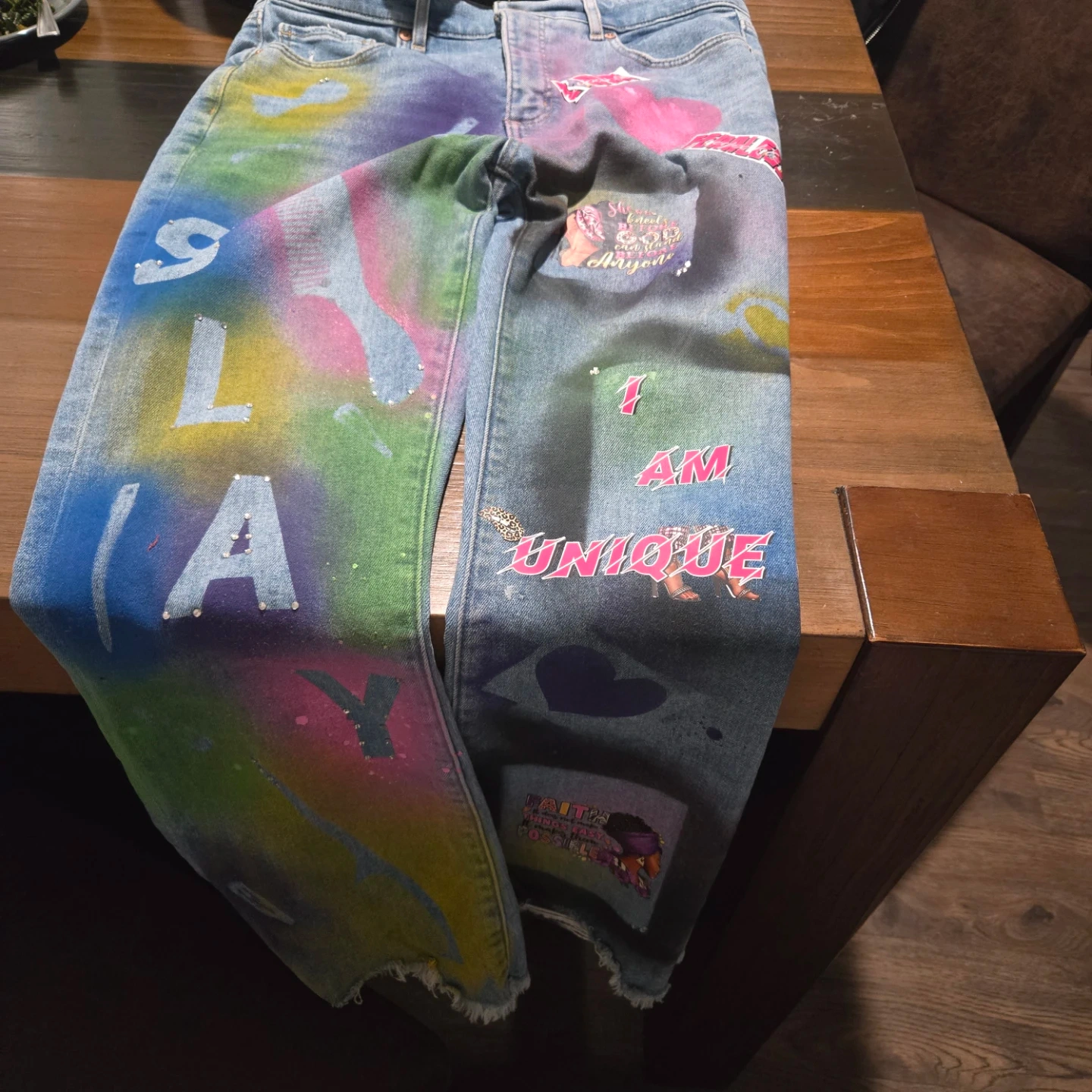 These are a pair of denim jeans that have been custom painted and adorned with various stickers and designs. They feature a unique, colorful aesthetic. Perfect for someone looking to make a statement!