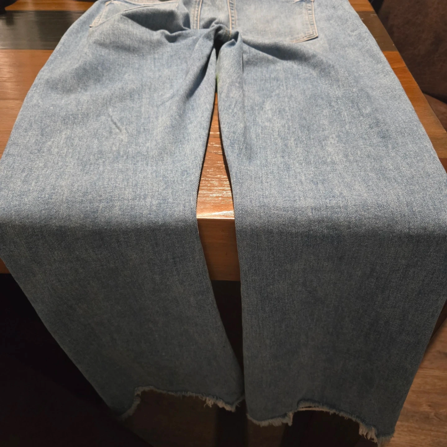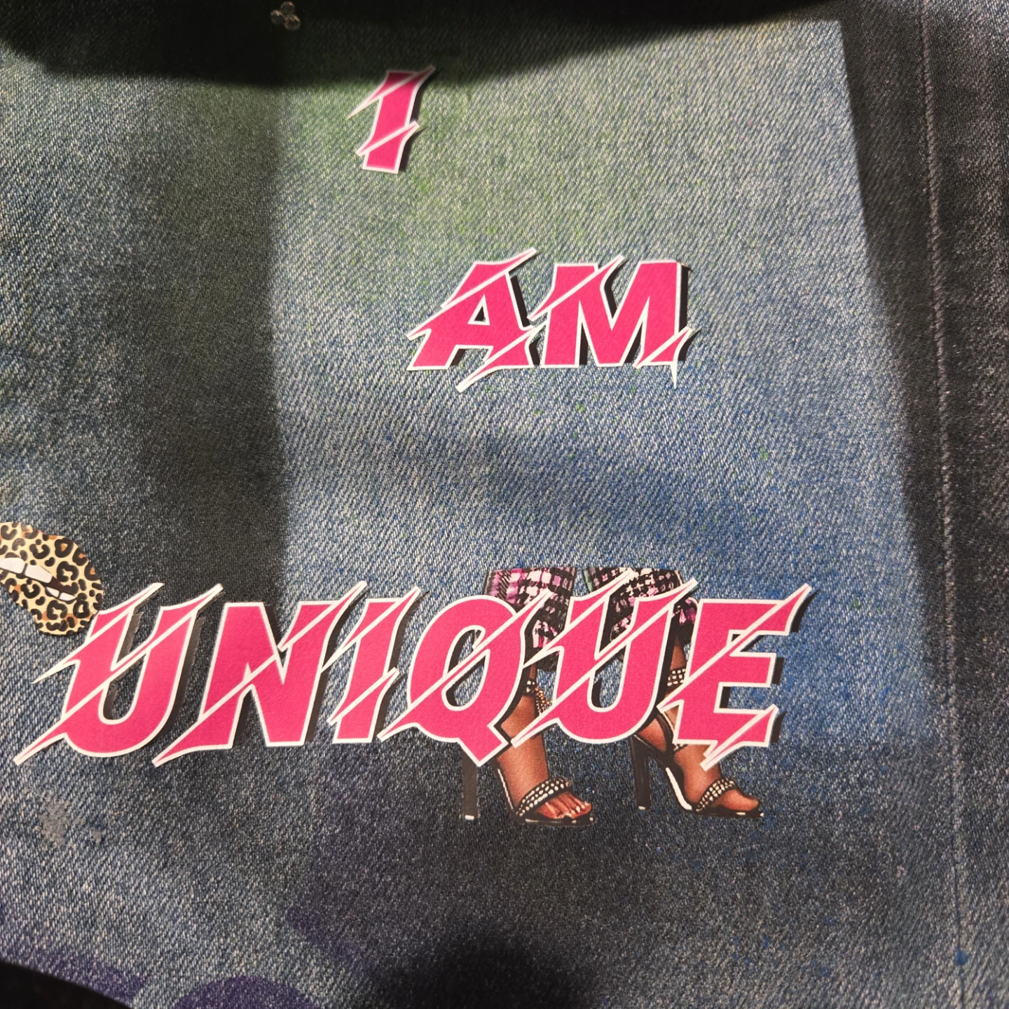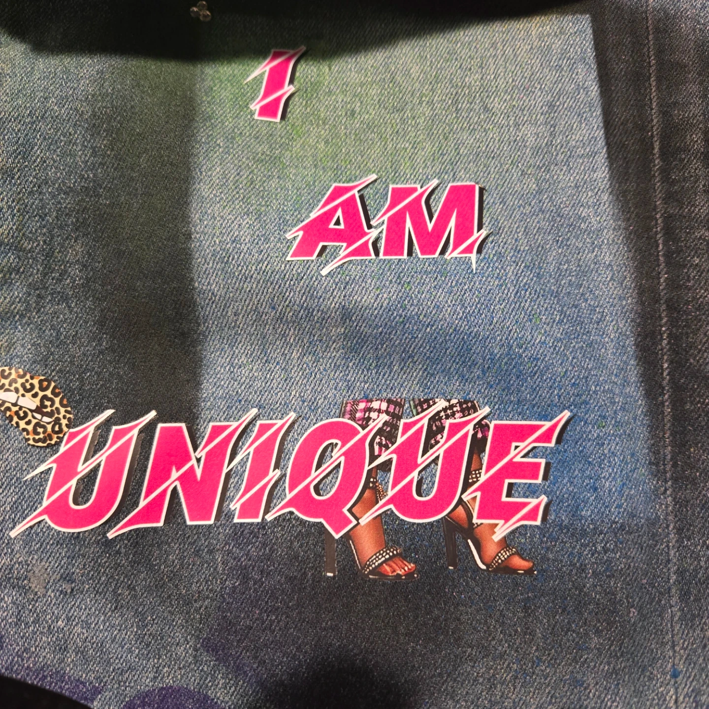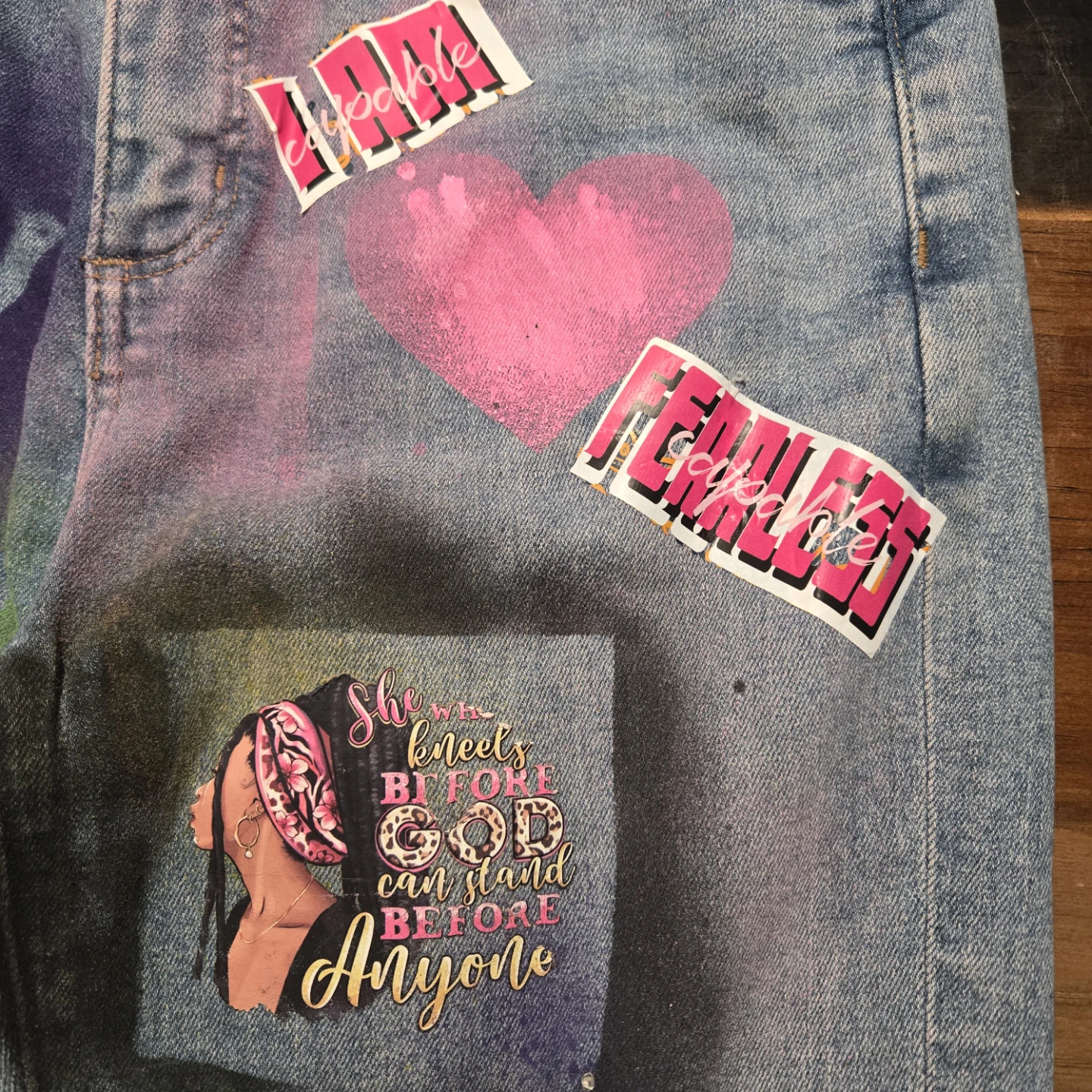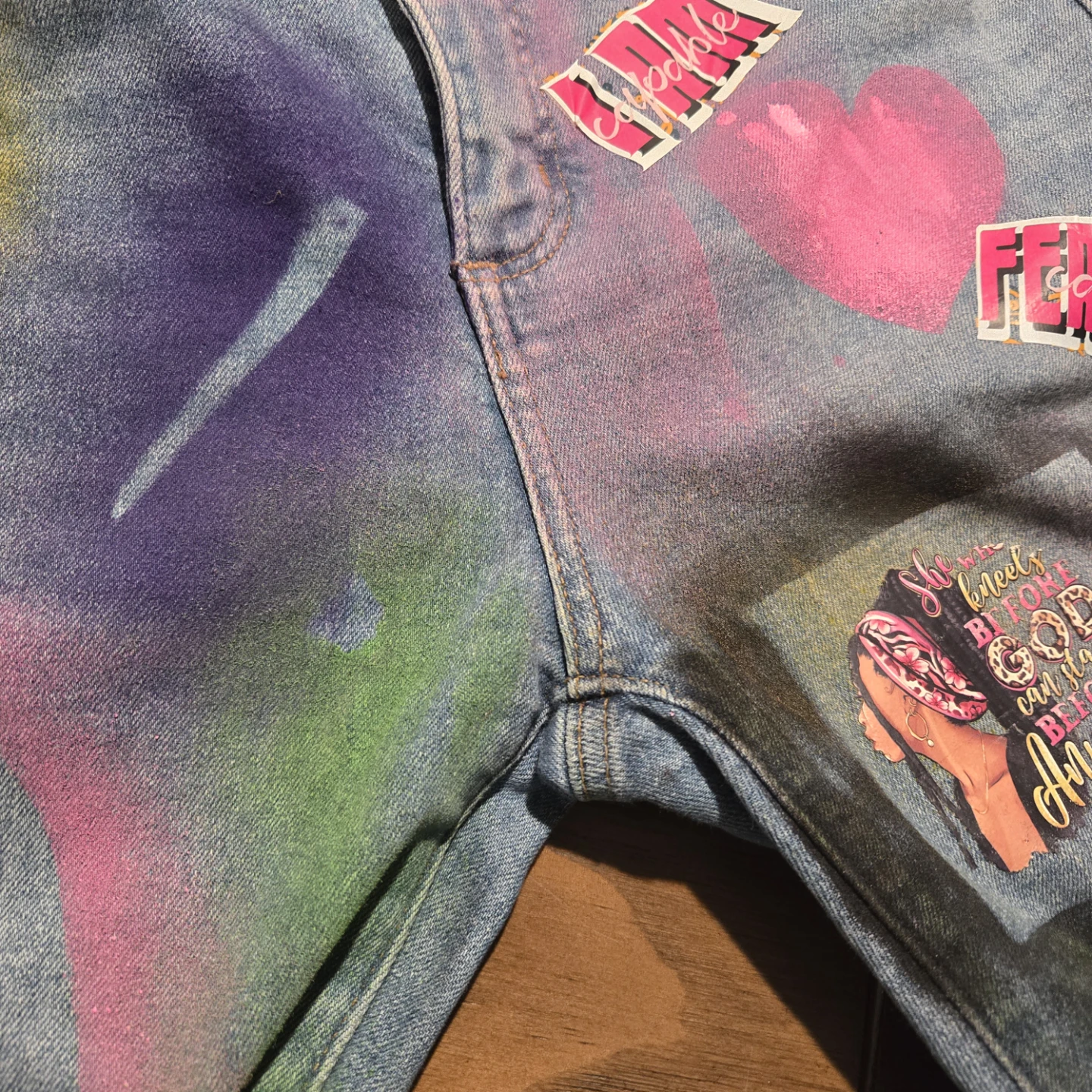 These are a pair of denim jeans that have been custom painted and adorned with various stickers and designs. They feature a unique, colorful aesthetic. Perfect for someone looking to make a statement!