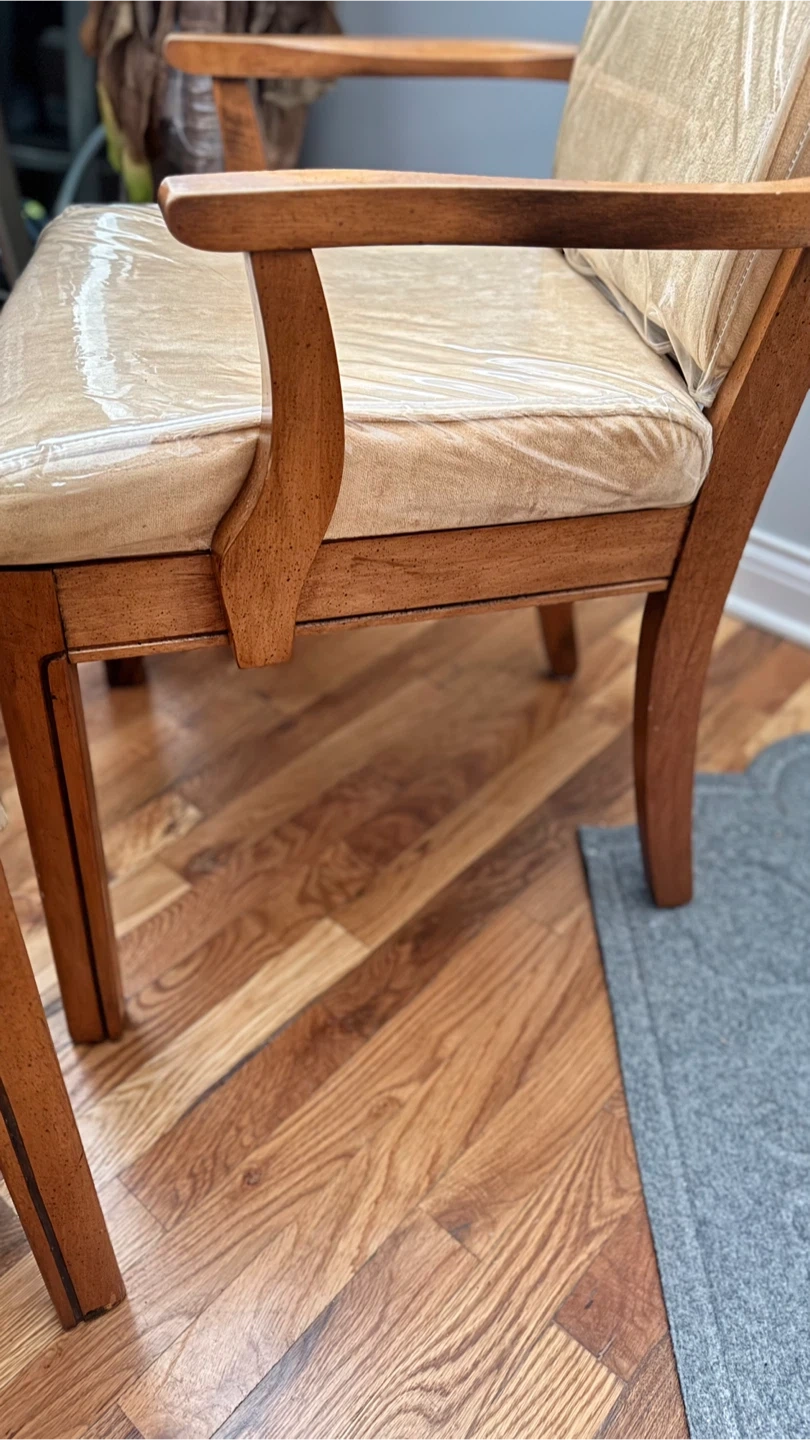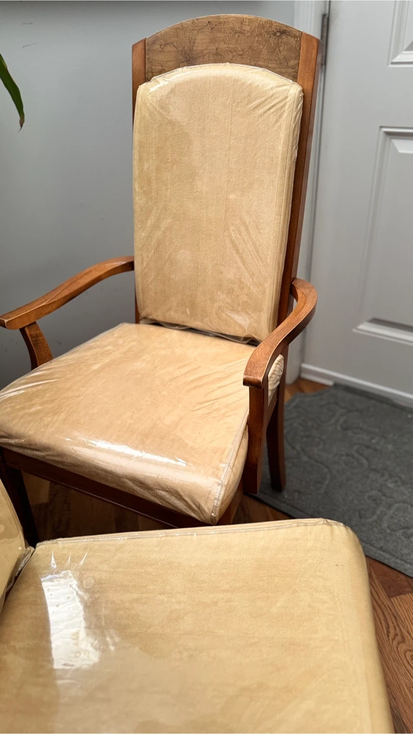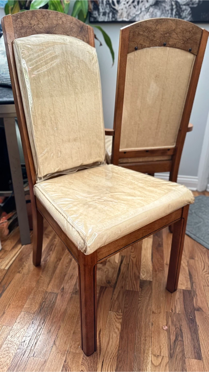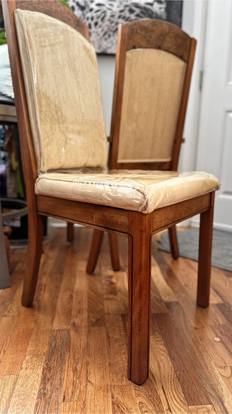 2-vintage singer dining chairs. The chairs have a wooden frame and cushioned seats, still wrapped in plastic. They have a classic design and would look great in any dining room. The chairs are in good condition and ready for a new home!