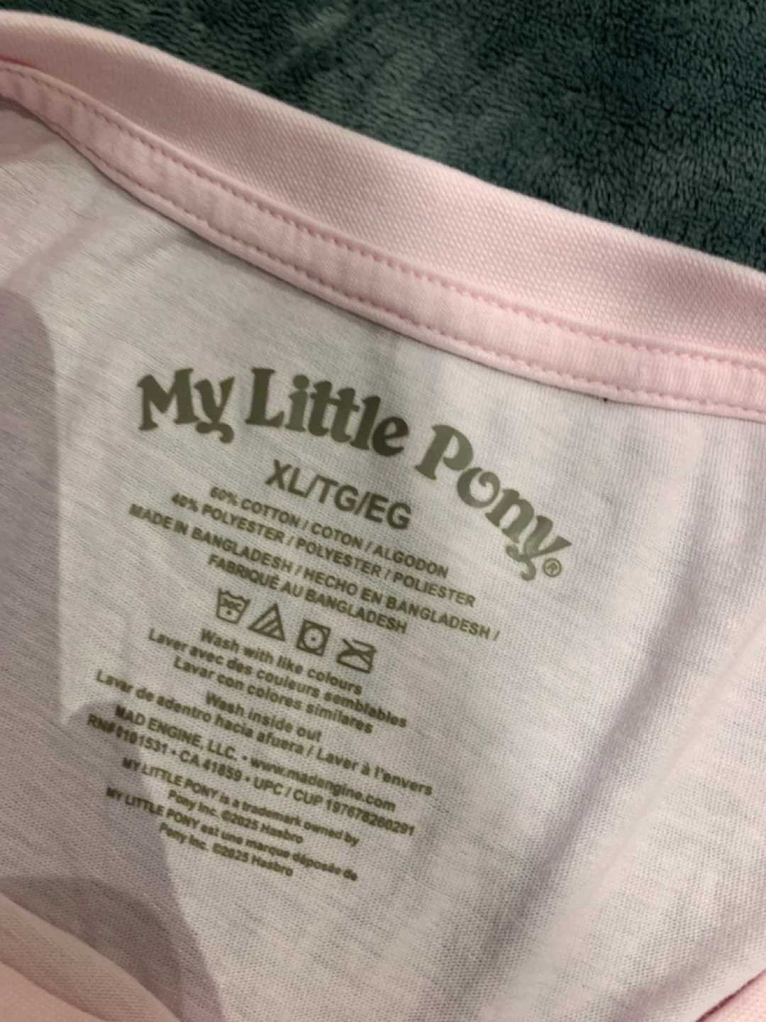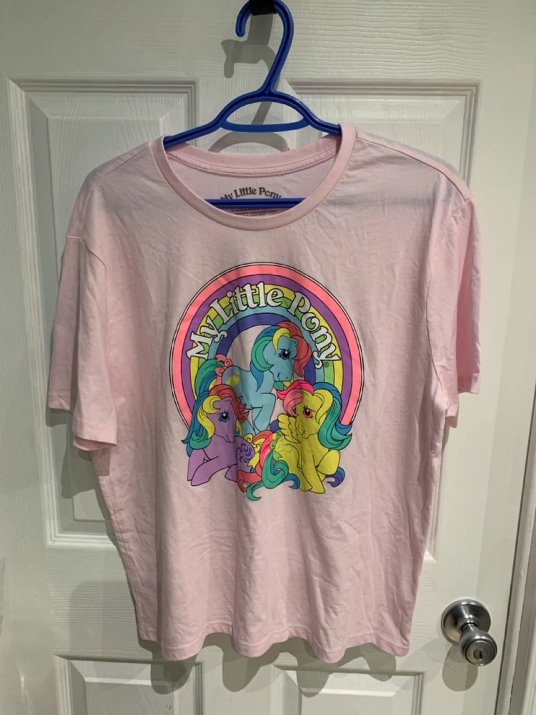 Selling a cute My Little Pony t-shirt in pink! It's a size XL and made of 60% cotton and 40% polyester. The shirt features a colourful graphic of classic My Little Pony characters. It's in great condition and ready for a new home!