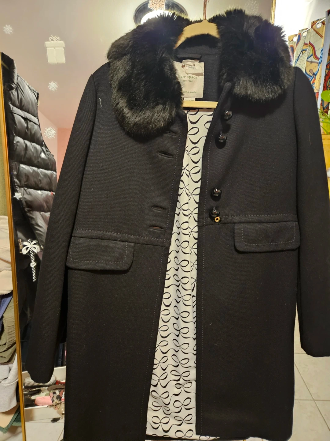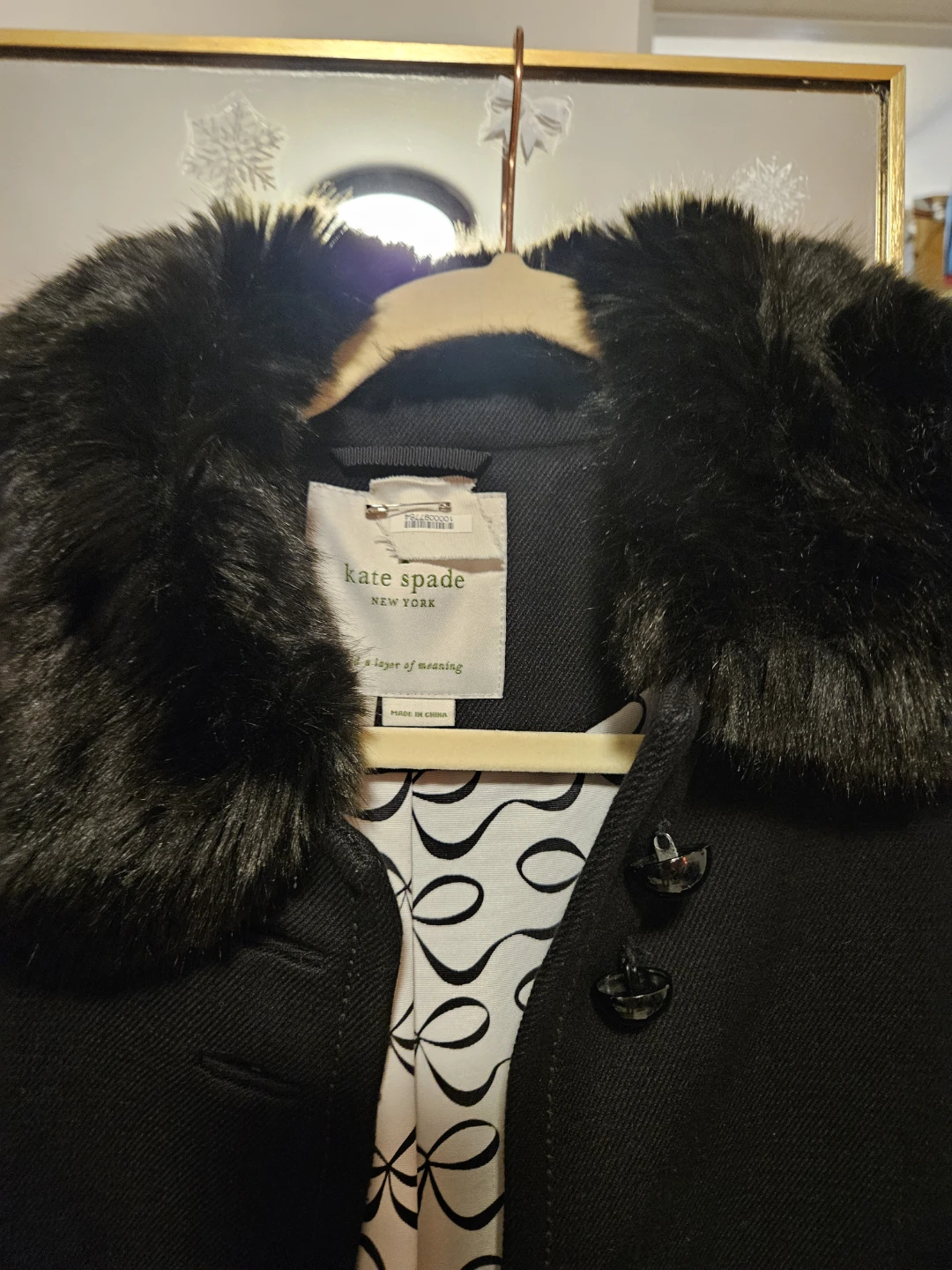 Selling a stylish Kate Spade black coat! It features a chic faux fur collar that adds a touch of elegance. Perfect for staying warm and fashionable during the colder months. The coat is in great condition and ready for a new owner!