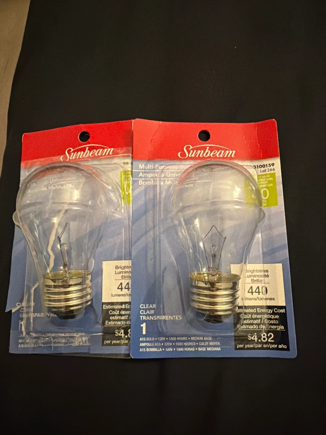 two brand new Sunbeam A15 clear light bulbs! These are multi-purpose bulbs, each with a medium base and estimated energy cost of $4.82 per year. They provide 440 lumens of brightness and last for 1500 hours. Ready to brighten up your space!