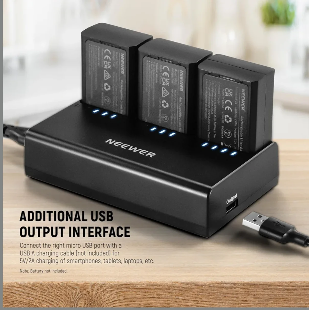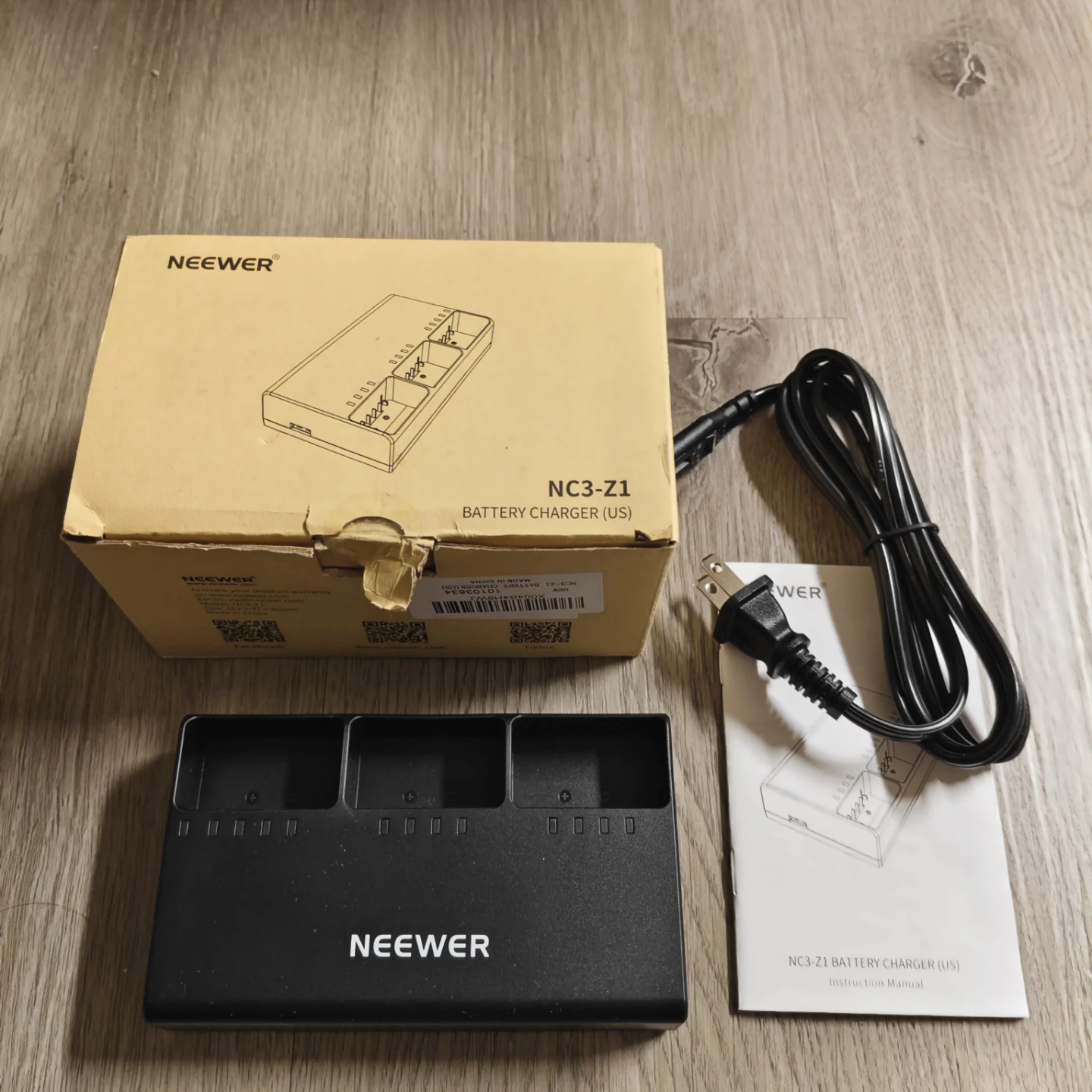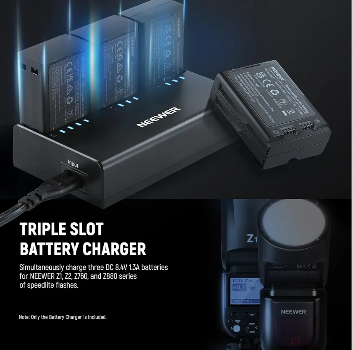 Selling a Neewer NC3-Z1 battery charger! It's designed for simultaneous charging of three DC 8.4V 1.3A batteries, compatible with Neewer Z1, Z2, Z760, and Z880 series speedlite flashes. Included is the charger itself, the original box, and the instruction manual
