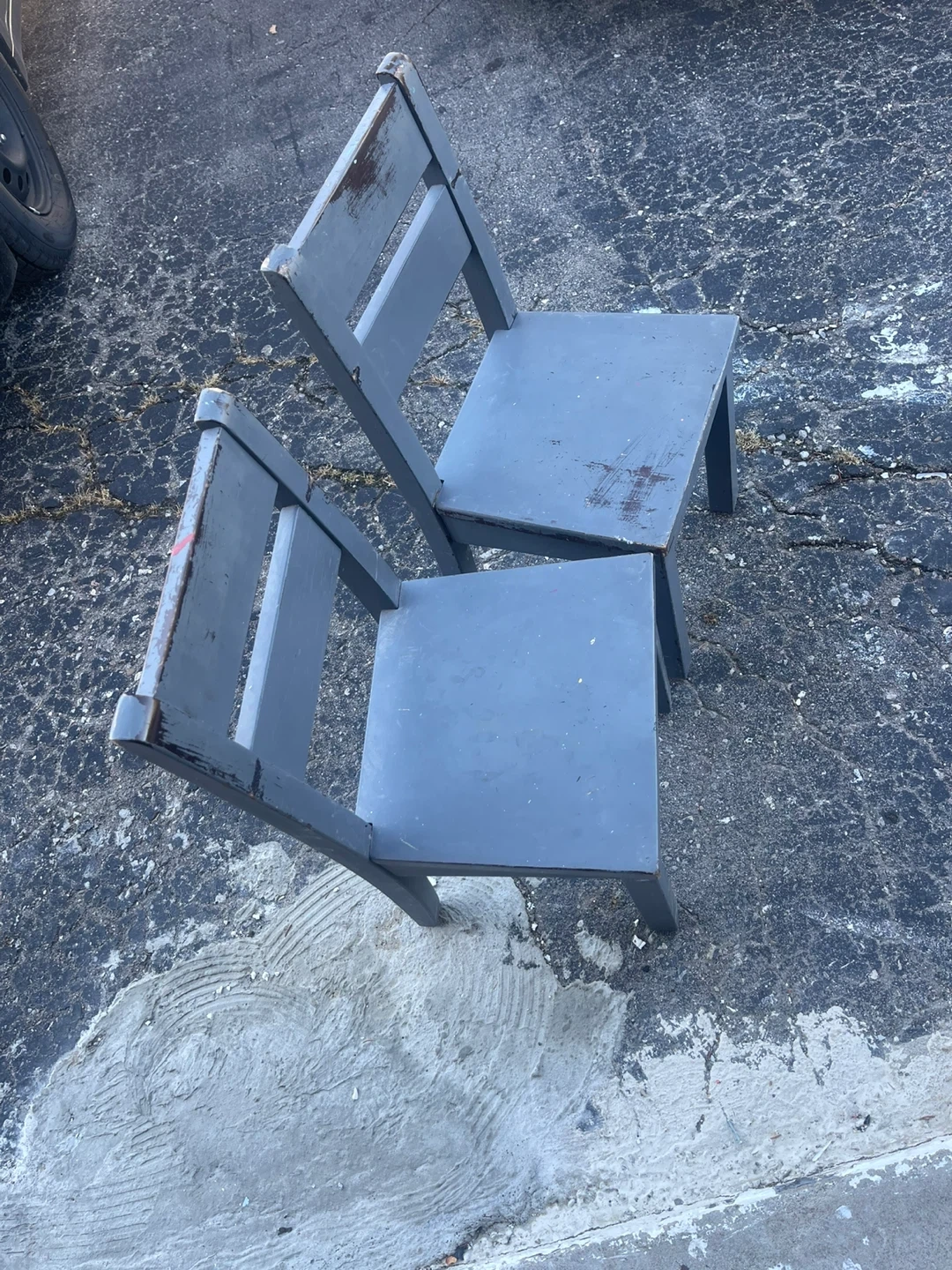 Selling a set of two wooden chairs! They're painted in a nice grey colour. Perfect for adding some extra seating to your dining area or kitchen. They have some wear and tear, as shown in the pictures, but they're still sturdy and ready to use