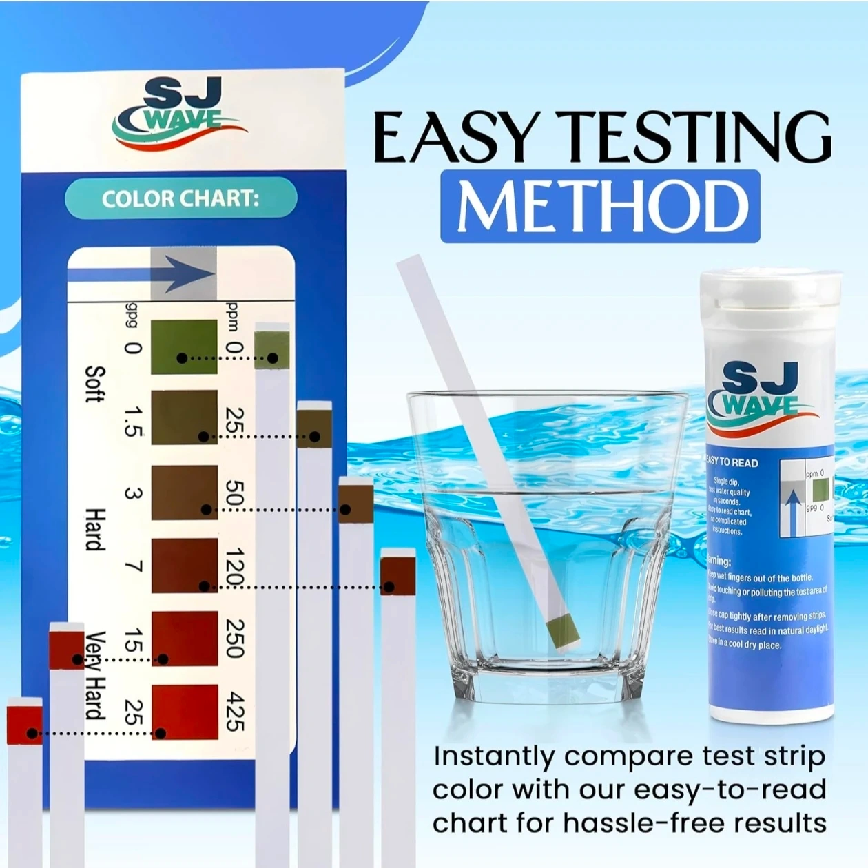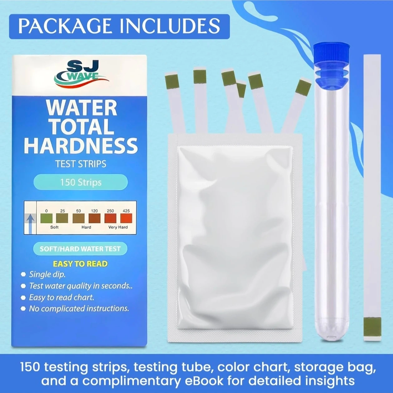 I'm selling SJ Wave Water Total Hardness Test Strips. It comes with 150 strips, a testing tube, colour chart, and storage bag. It also includes a complimentary eBook for detailed insights. These strips are easy to read and provide quick, accurate results in just 30 seconds