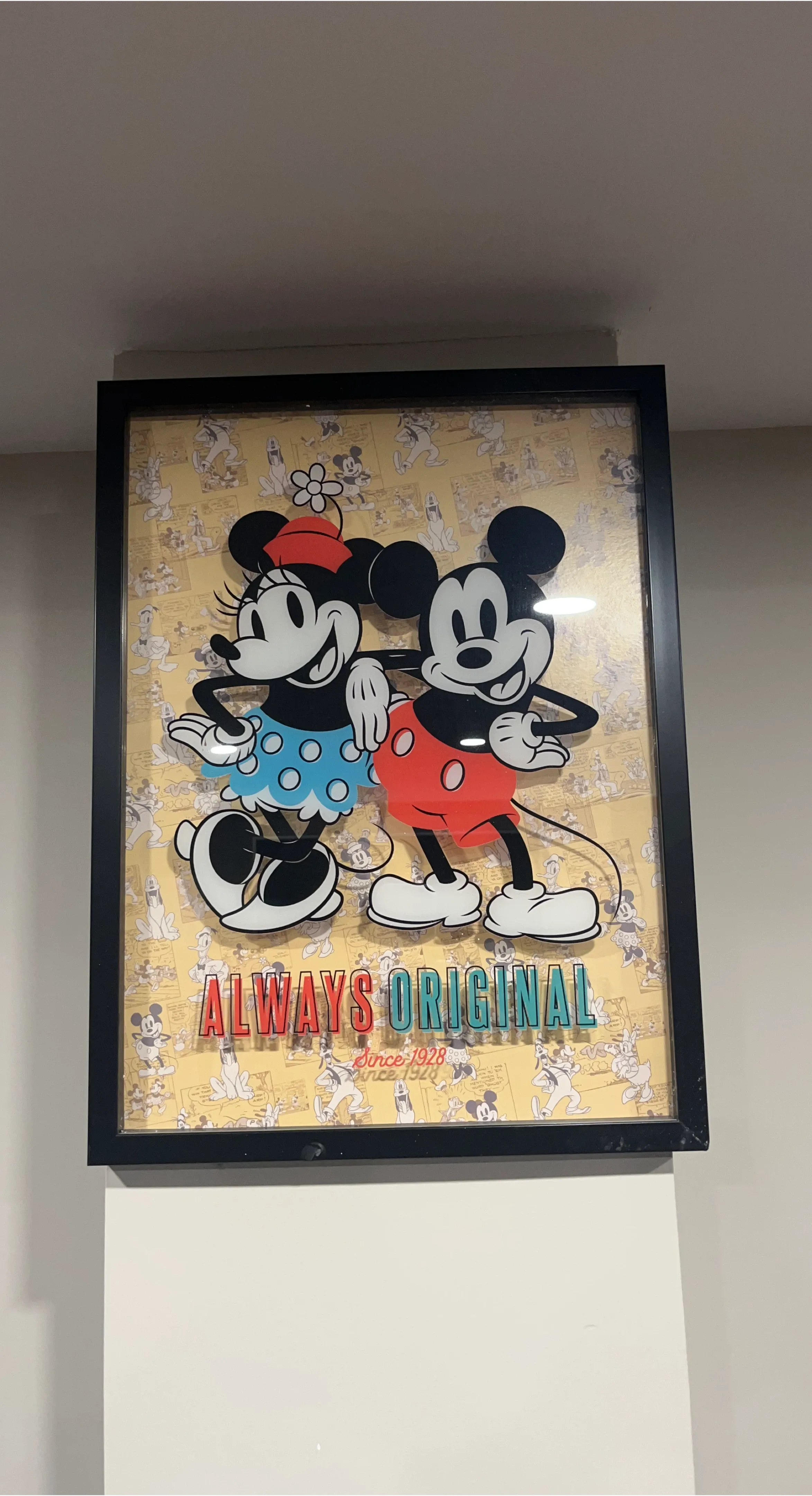 This framed art features Mickey and Minnie Mouse in a classic design! The artwork has a fun, vintage feel with the words "Always Original Since 1928". Perfect for a Disney fan or to add a touch of nostalgia to your space