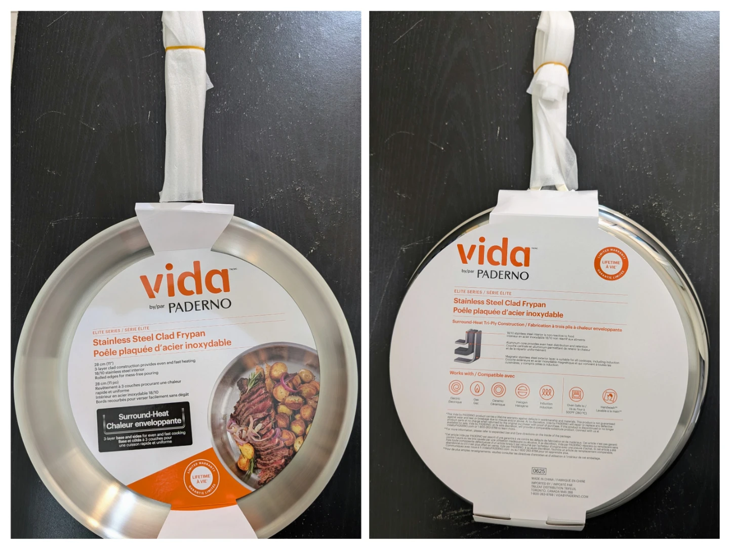 Selling a brand new Vida by Paderno Stainless Steel Clad Frypan! It's an elite series frypan with a 28 cm (11") diameter. It features a 3-layer clad construction for even and fast heating, and an 18/10 stainless steel interior. The rolled edges are designed for mess-free pouring. Works with electric, gas, ceramic, halogen, and induction cooktops, and is oven safe to 500°F (260°C). It also has a lifetime warranty!