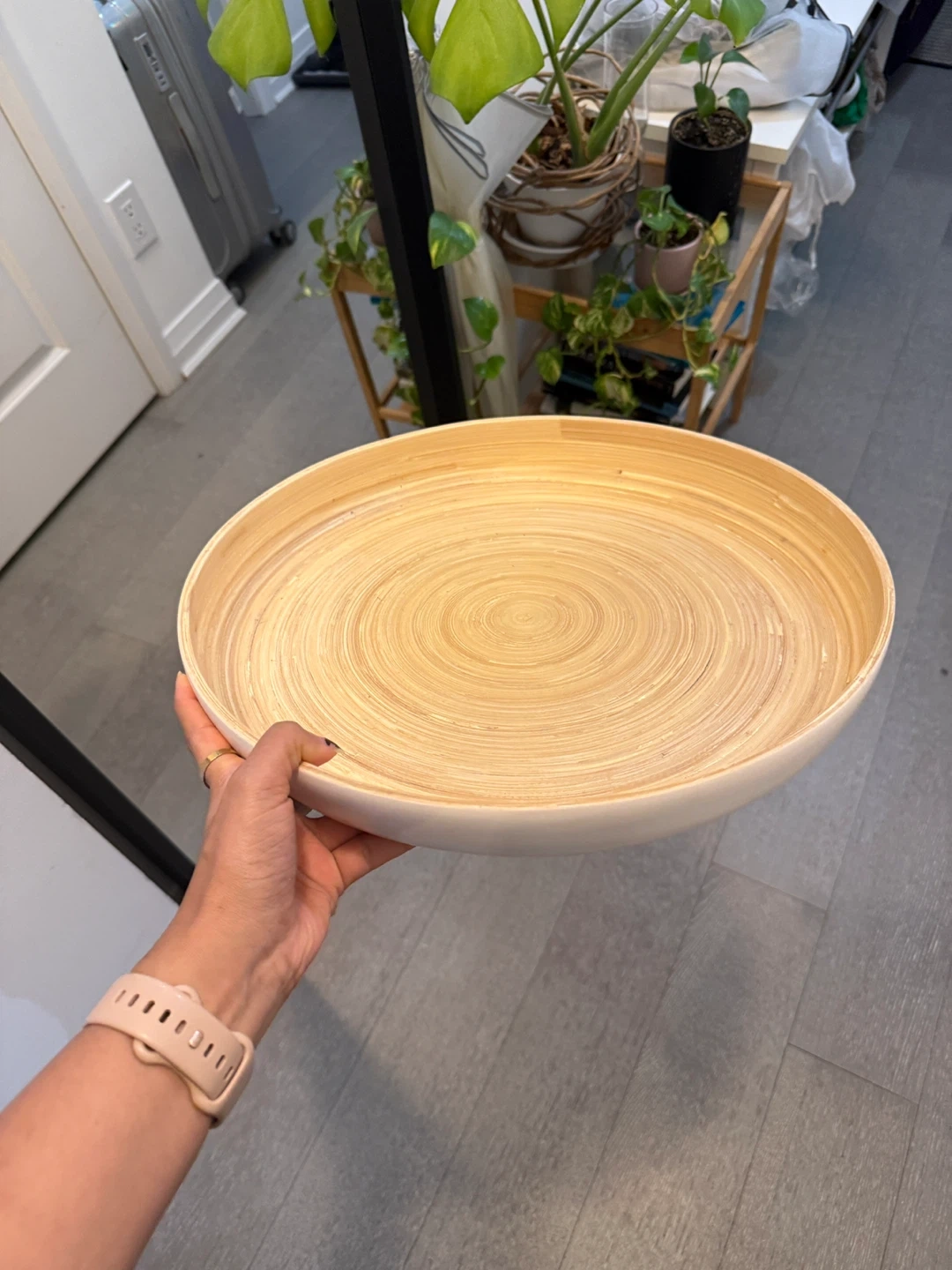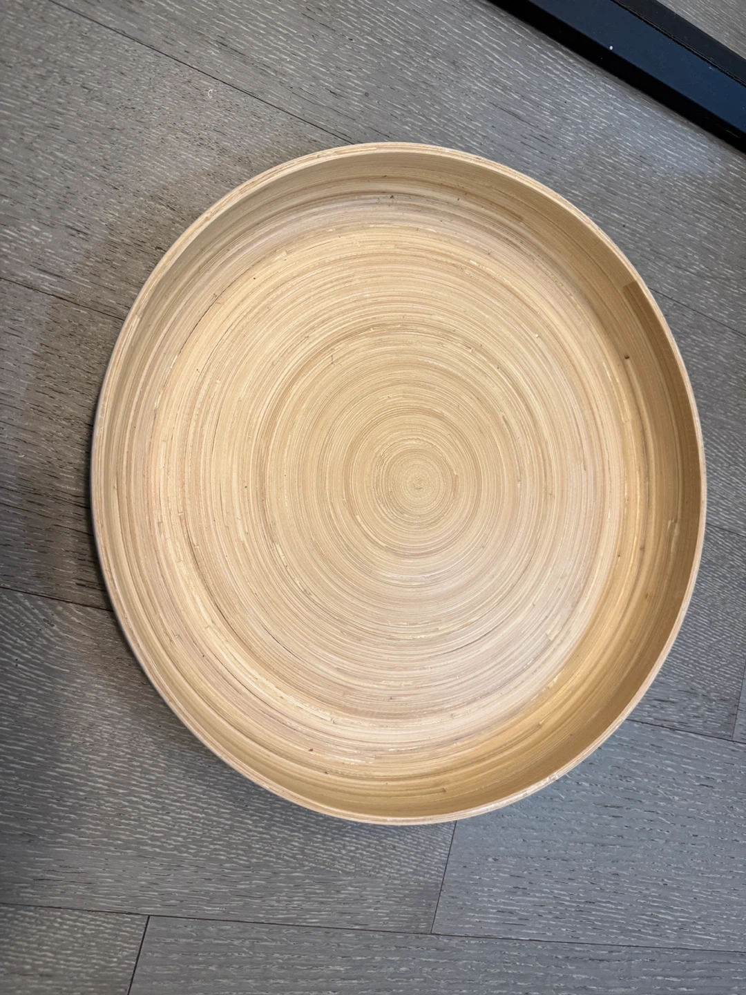Selling a HomeSense bamboo serving tray! It's in great condition and ready to use for your next gathering or as a decorative piece. The tray has a beautiful natural bamboo pattern on the top and a white finish on the bottom. Perfect for serving snacks, drinks, or displaying items around your home