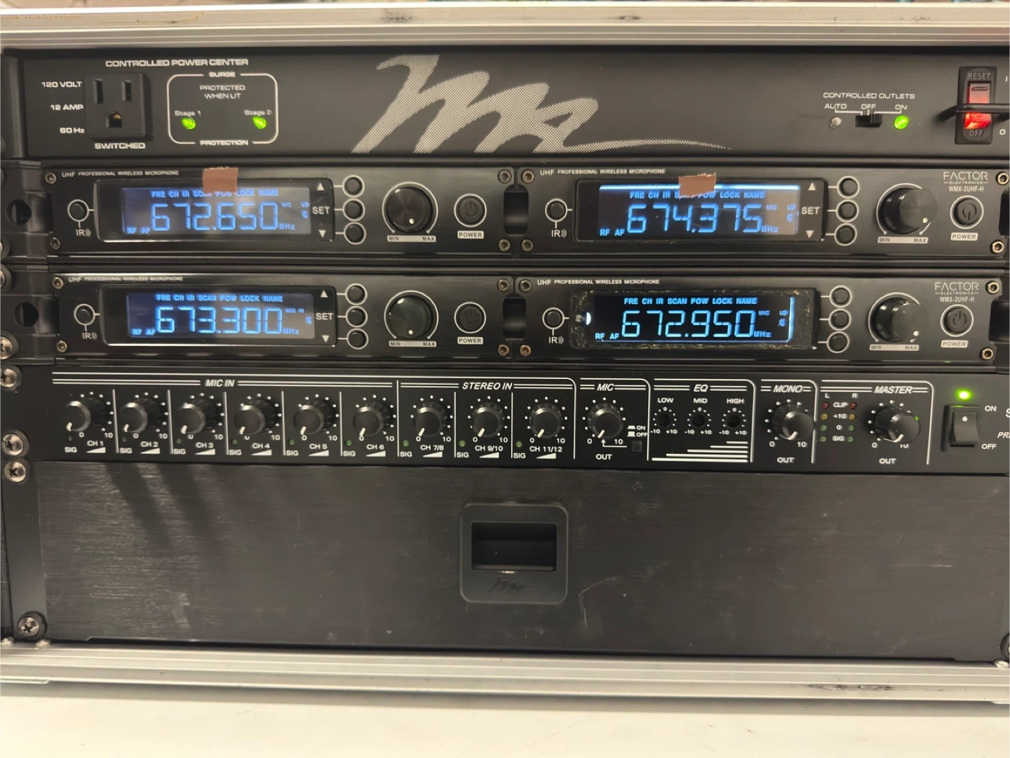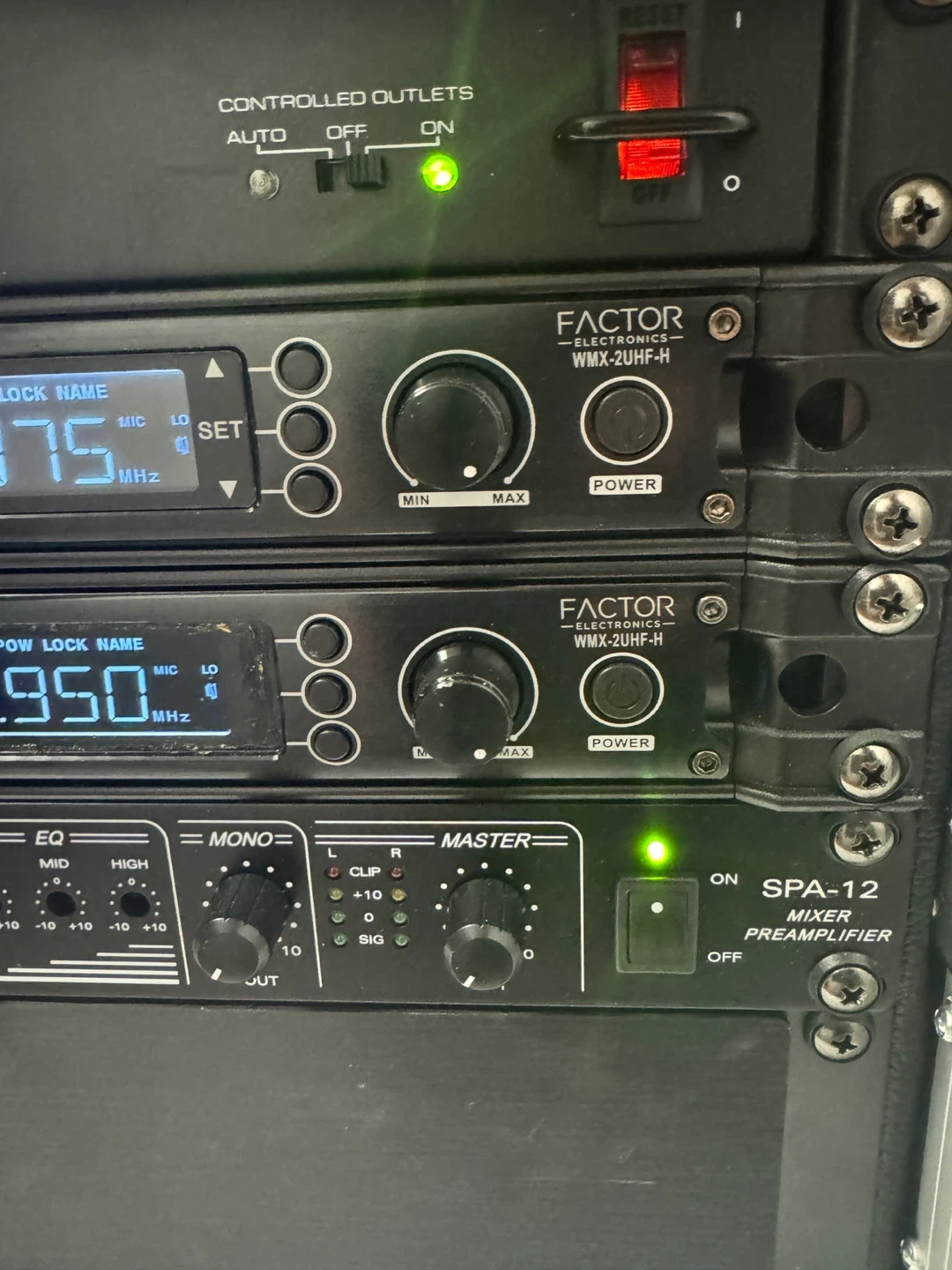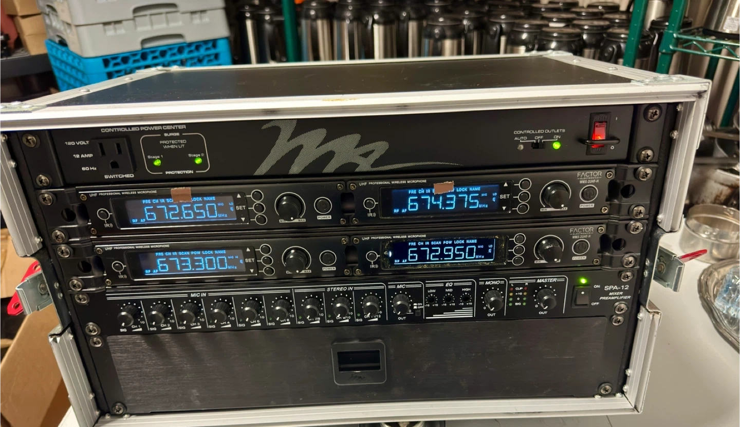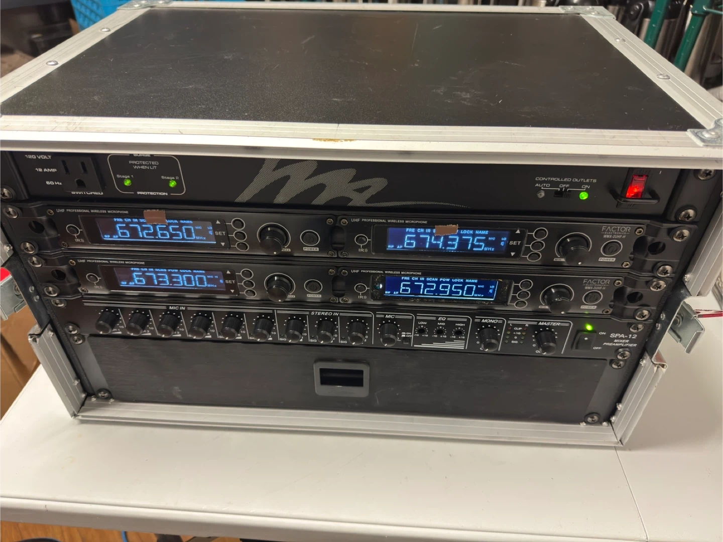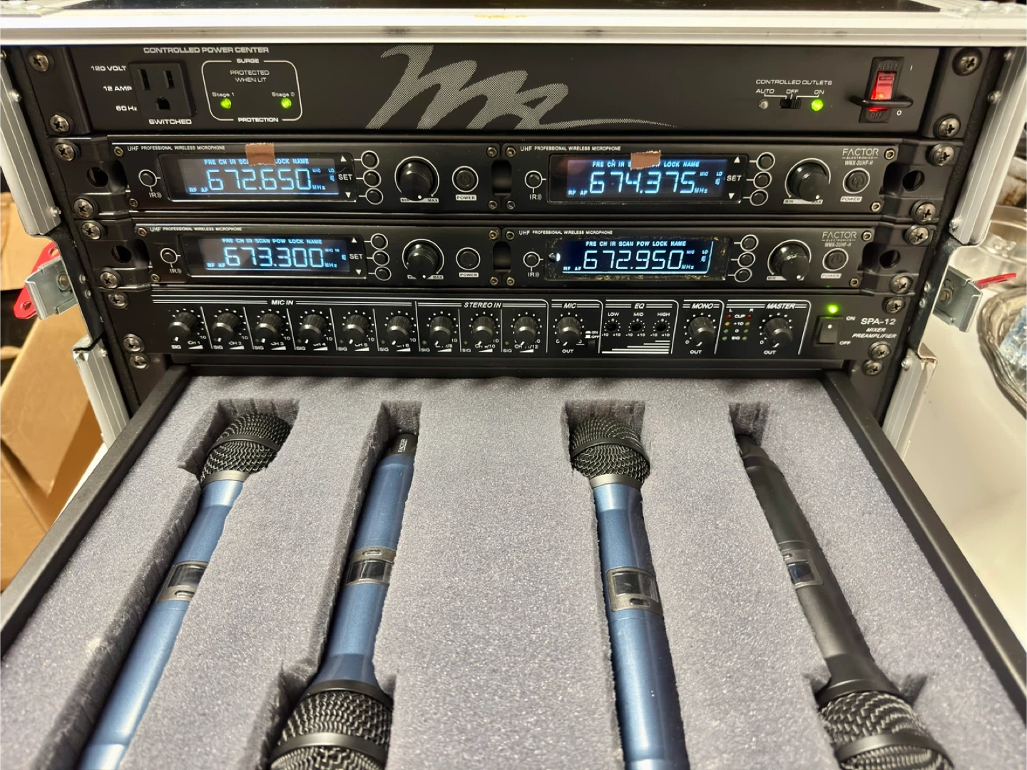 Selling a M&A Factor Electronics wireless microphone system. It includes the SPA-12 mixer preamplifier and WMX-2UHF-H wireless microphones. Great for events or performances!