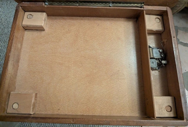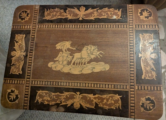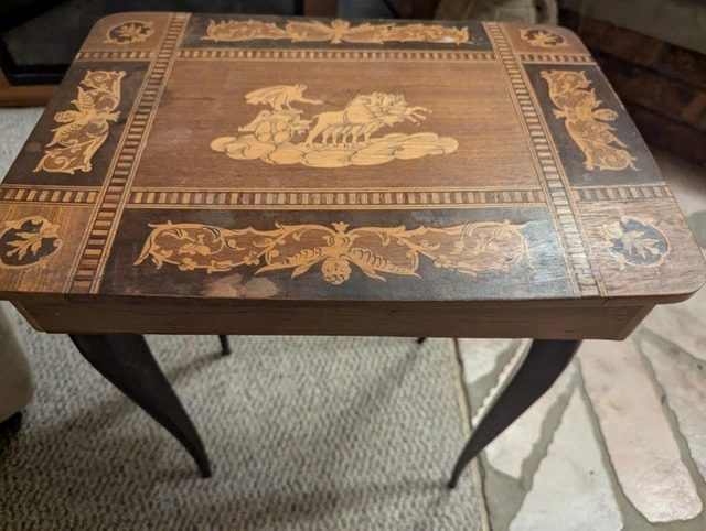 Country of Origin Italy. The table is typically used for decorative purposes or as jewelry storage, adding a touch of elegance to any space. The central scene of a charioteer with horses, surrounded by decorative borders with floral and geometric motifs. Features: Handmade inlaid table Built-in music box Italian craftsmanship Height: 52 cm (20.47 inches) Table top dimensions: 27cm x 37cm (10.63" x 14.57")