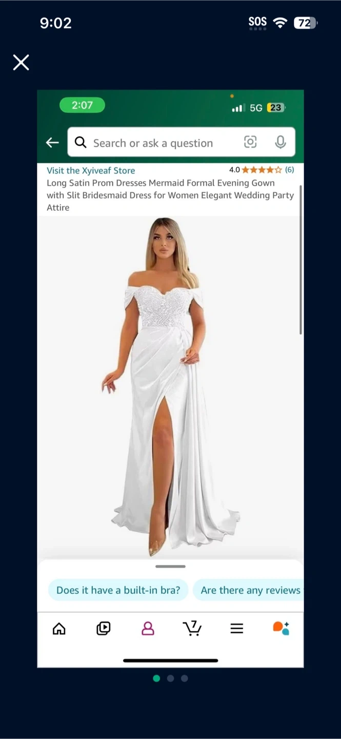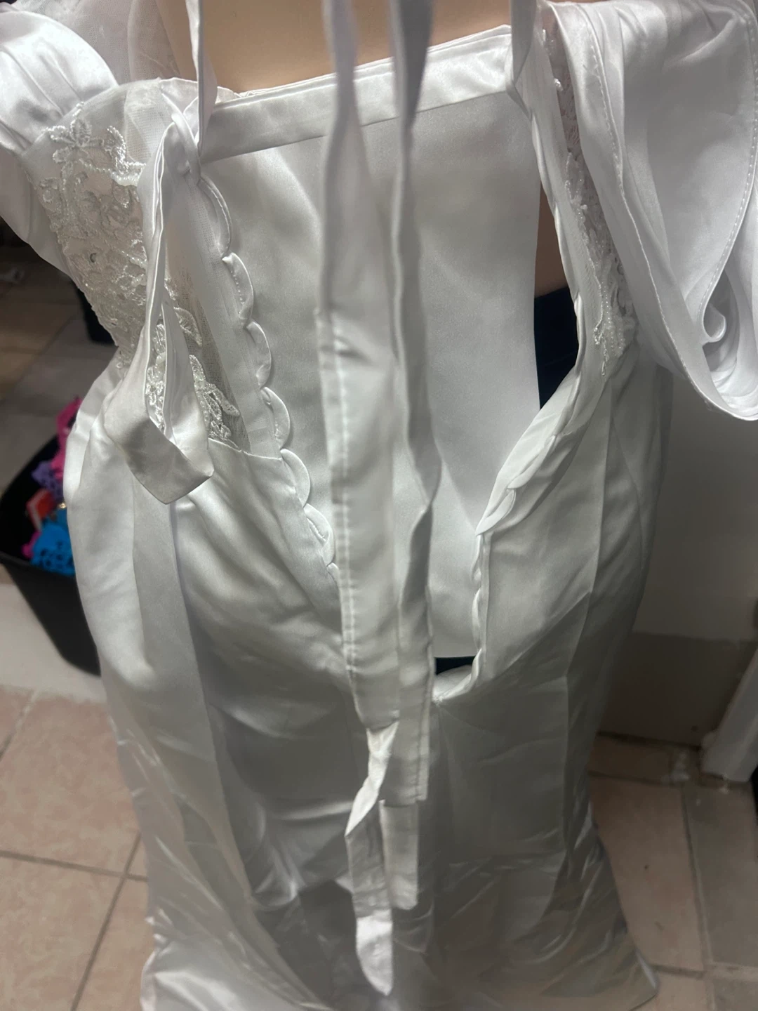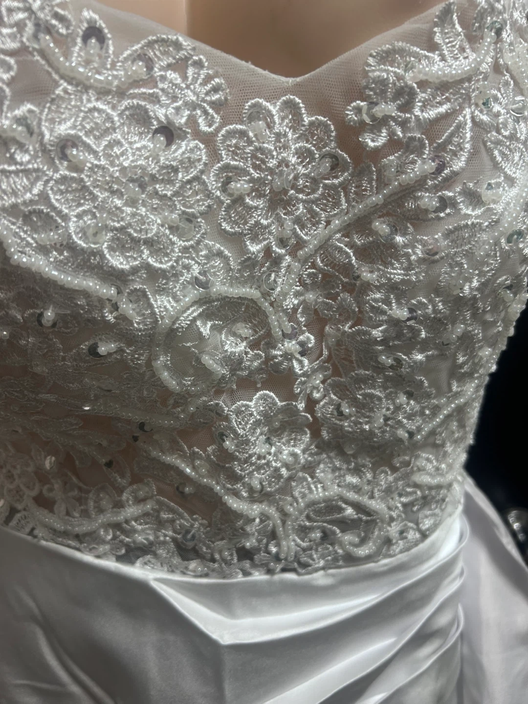 Selling a beautiful white Party Prom Dress, perfect for a formal evening event! The dress is a mermaid style with a slit. It has a lace bodice and satin skirt. It's an elegant wedding party attire.