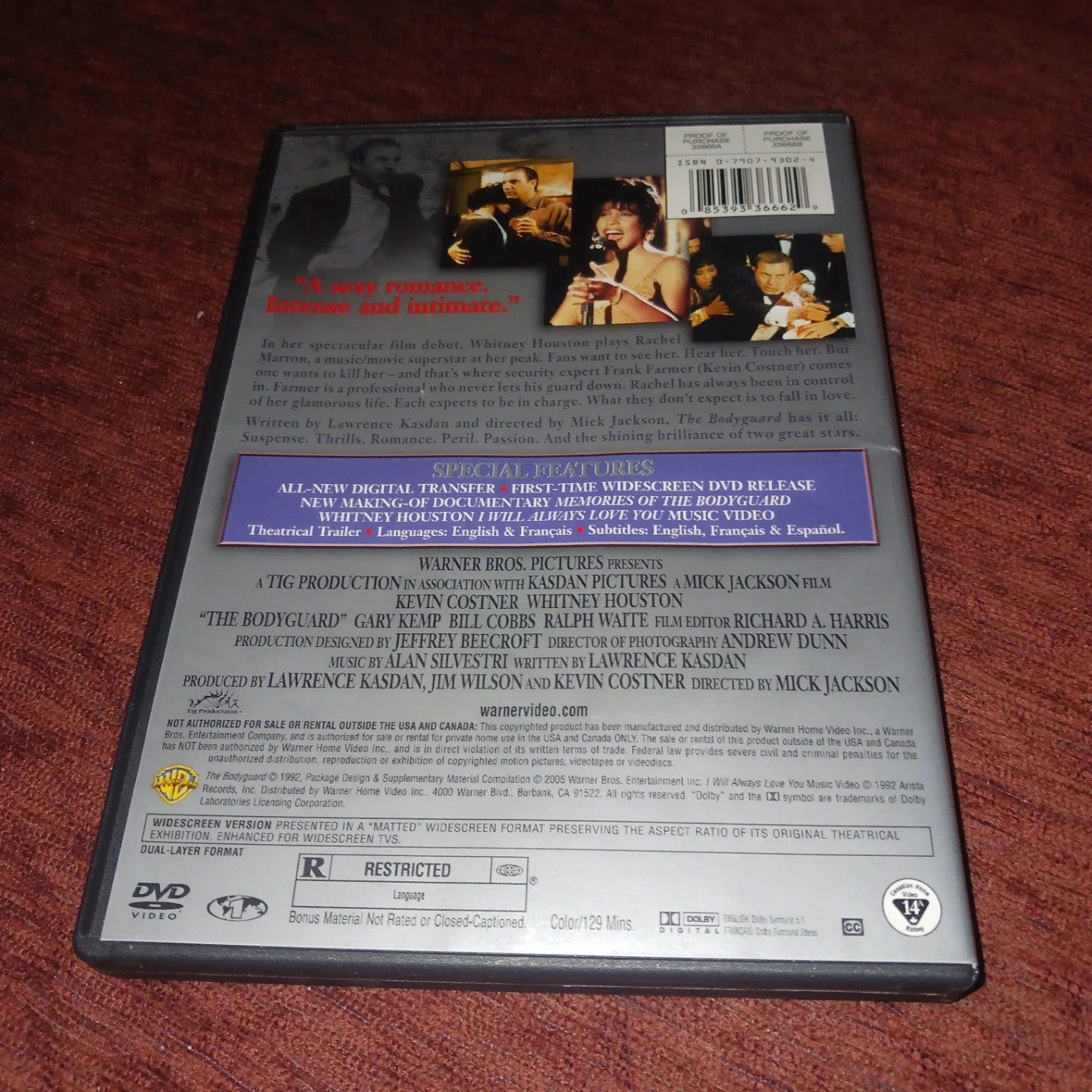 Selling The Bodyguard DVD Special Edition starring Kevin Costner and Whitney Houston! It's a classic romance movie directed by Mick Jackson. The DVD is widescreen version and has a running time of 129 mins. Languages: English & Français, Subtitles: English, Français & Español