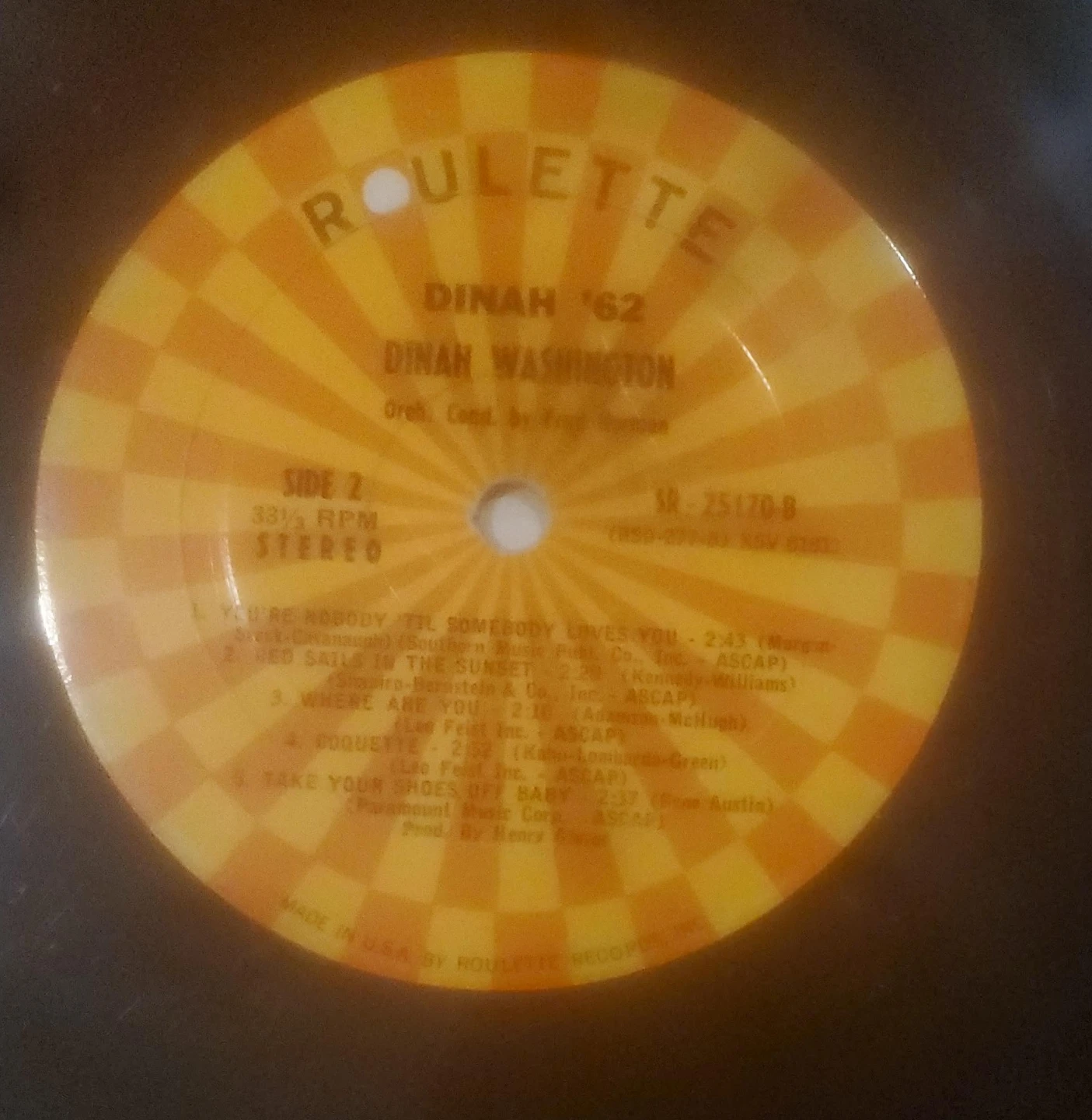 Selling a Dinah Washington vinyl record, titled 'Dinah '62' on the Roulette label. Side 2 includes classic tracks like 'You're Nobody Til Somebody Loves You' and 'Red Sails In The Sunset'. A great addition for any vinyl collector!