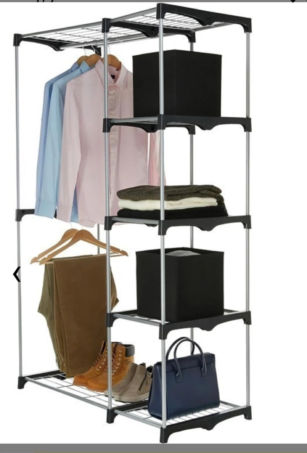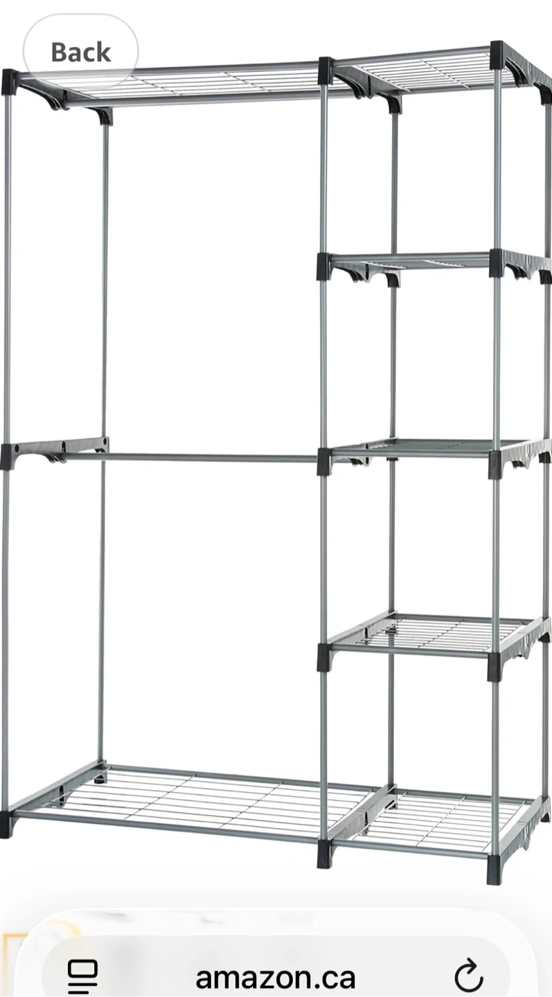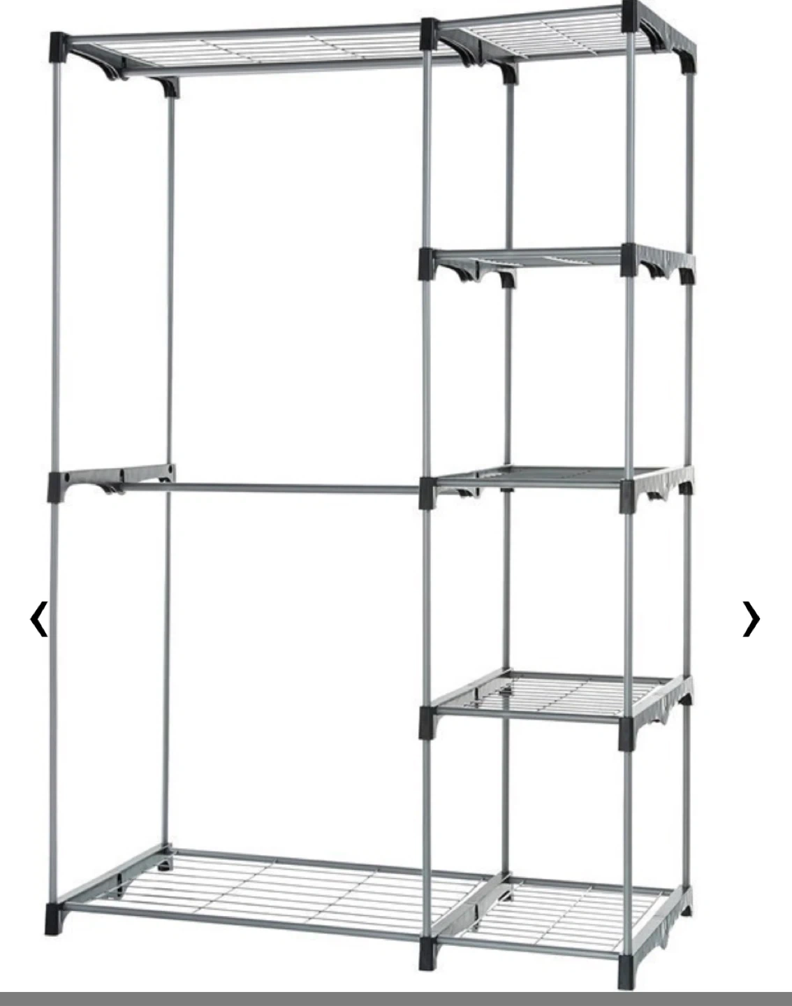This is an Amazon Basics Double Rod Freestanding Closet in silver. It's a great way to organize your clothes and accessories. It has shelves and a rod for hanging clothes. Perfect for adding extra storage to any room! Brand new in box. 10 remaining