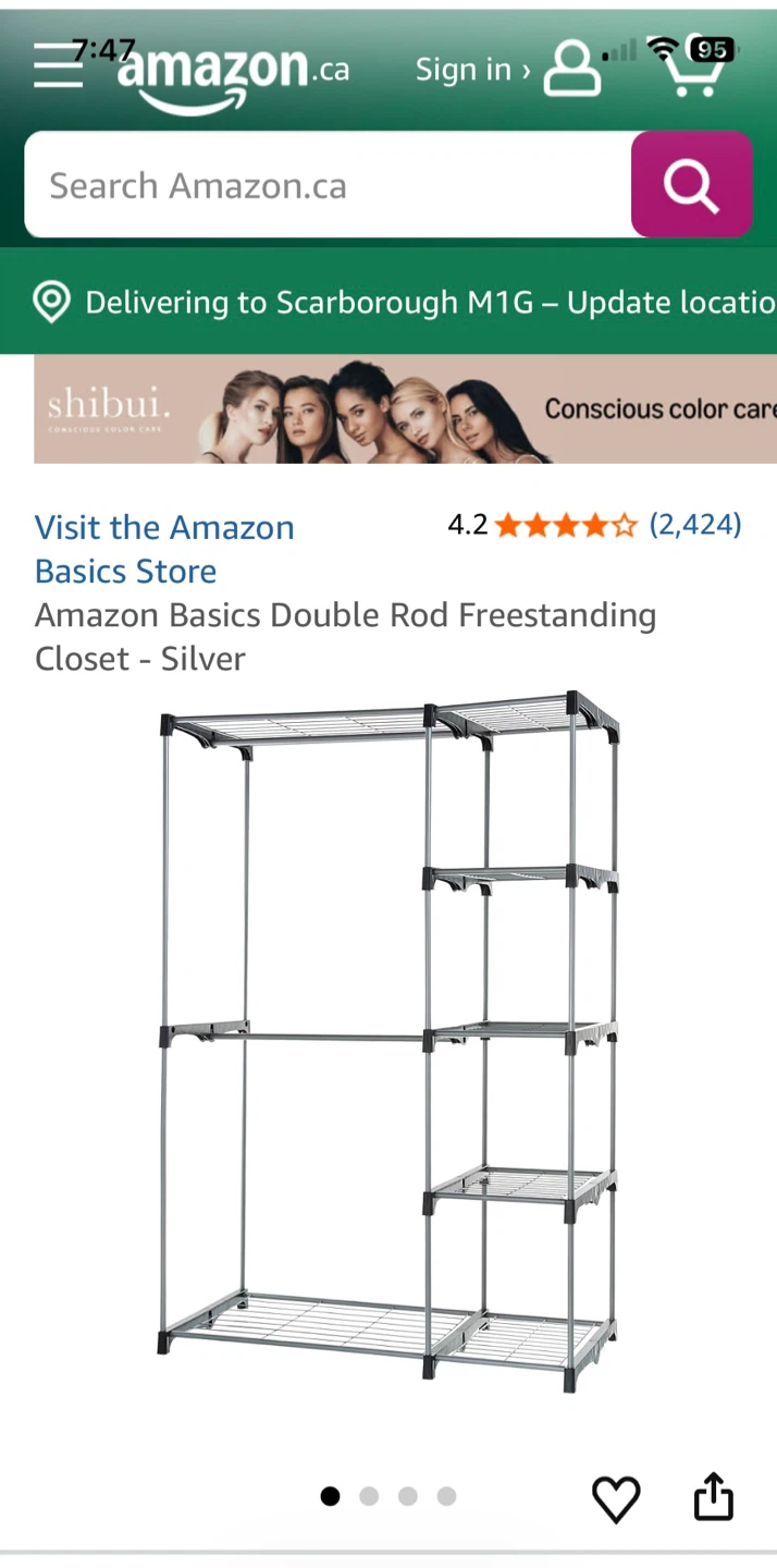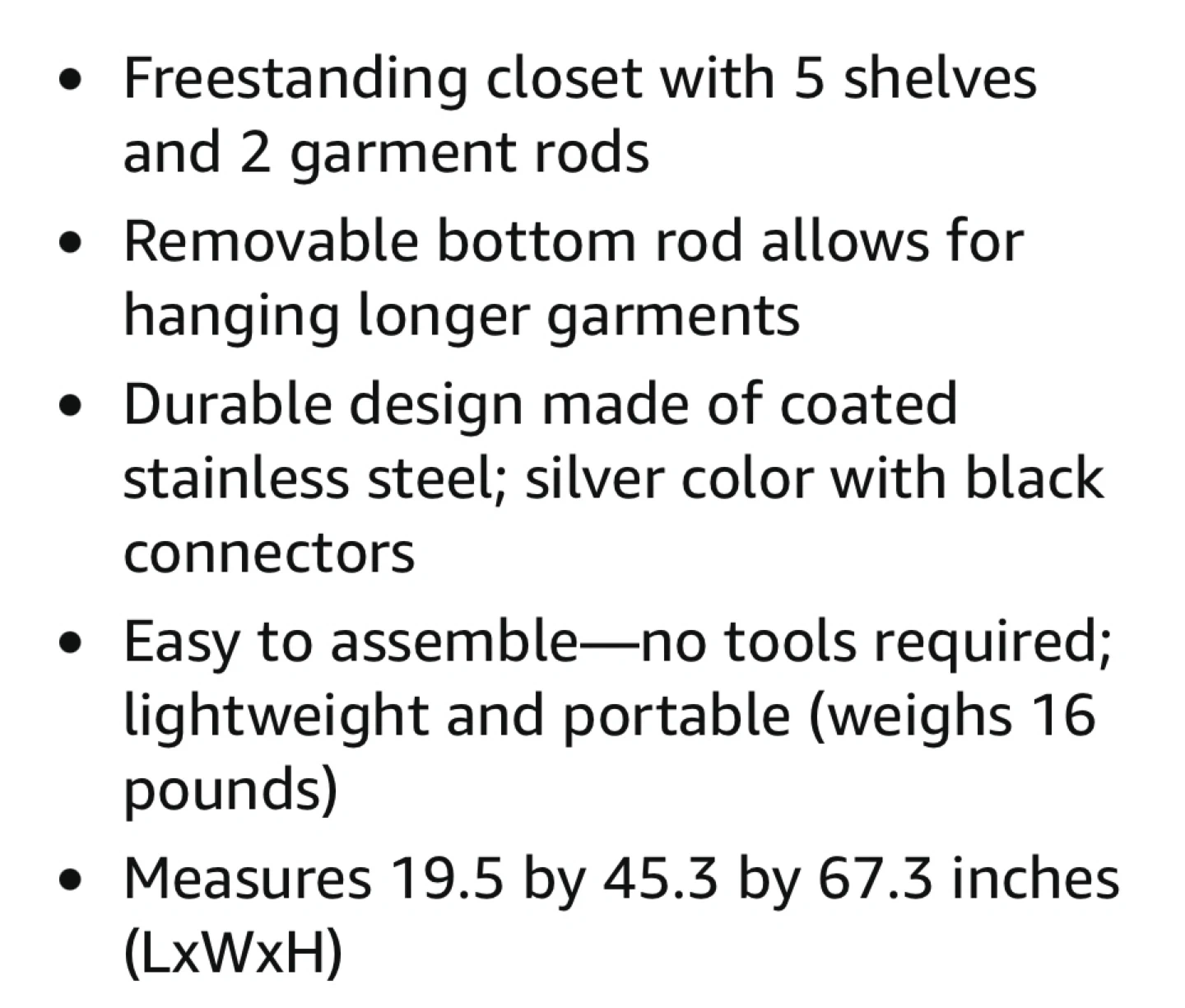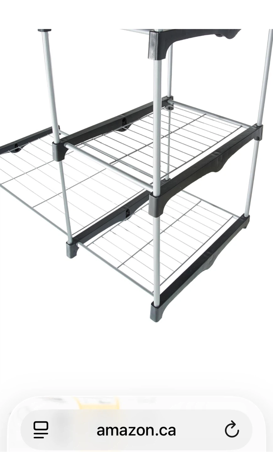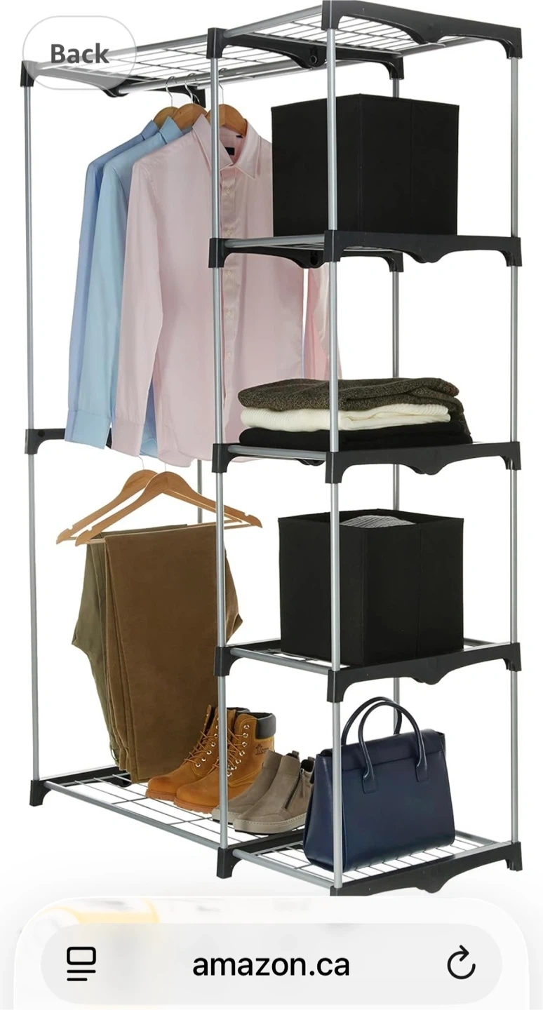 This is an Amazon Basics Double Rod Freestanding Closet in silver. It's a great way to organize your clothes and accessories. It has shelves and a rod for hanging clothes. Perfect for adding extra storage to any room! Brand new in box. 10 remaining