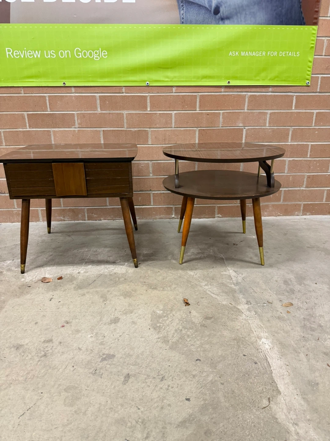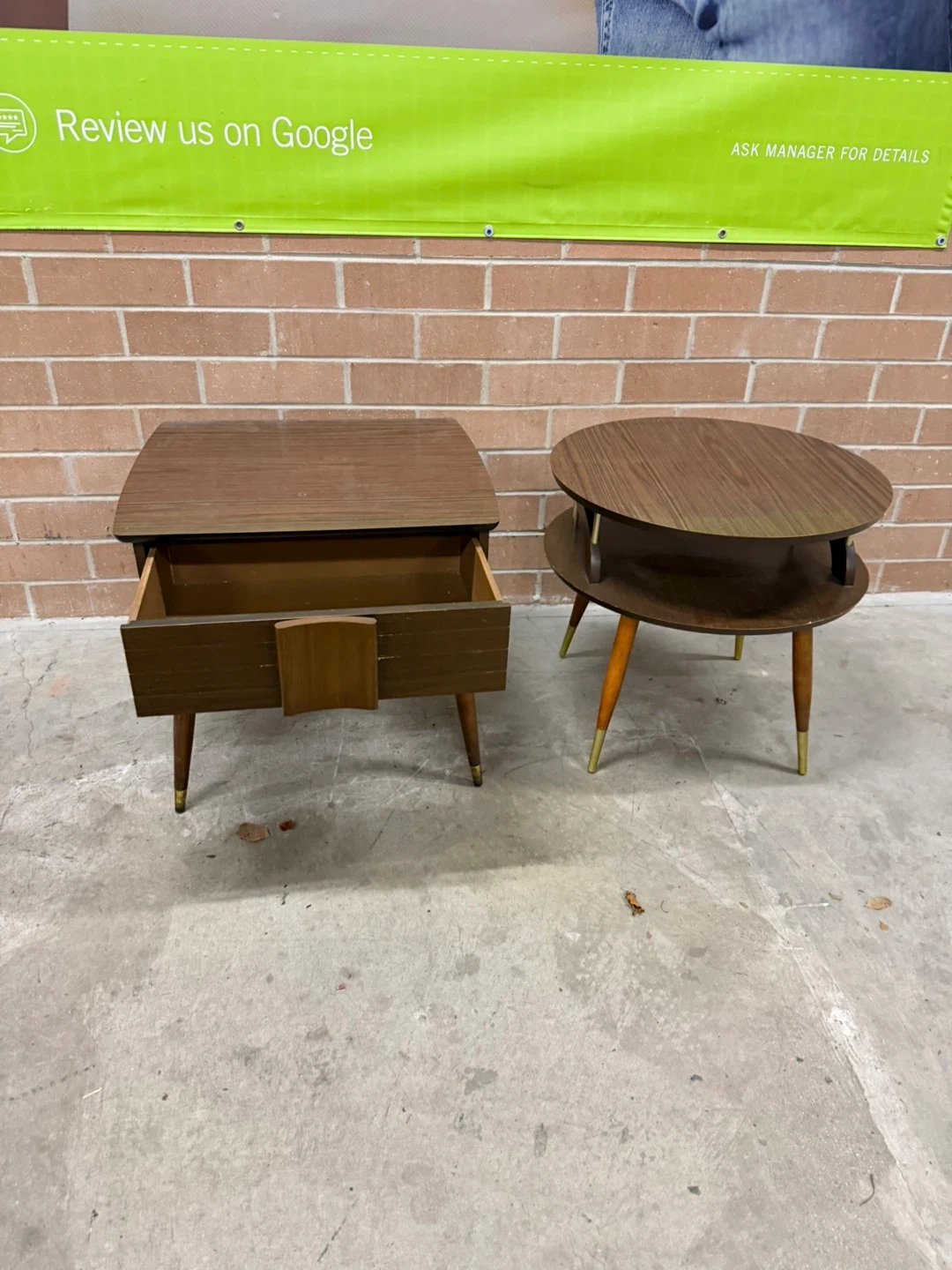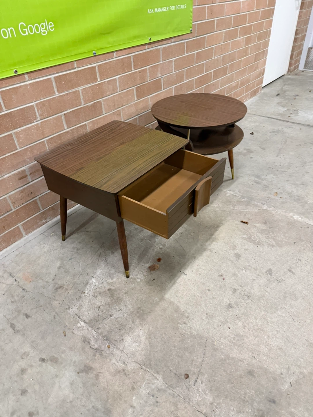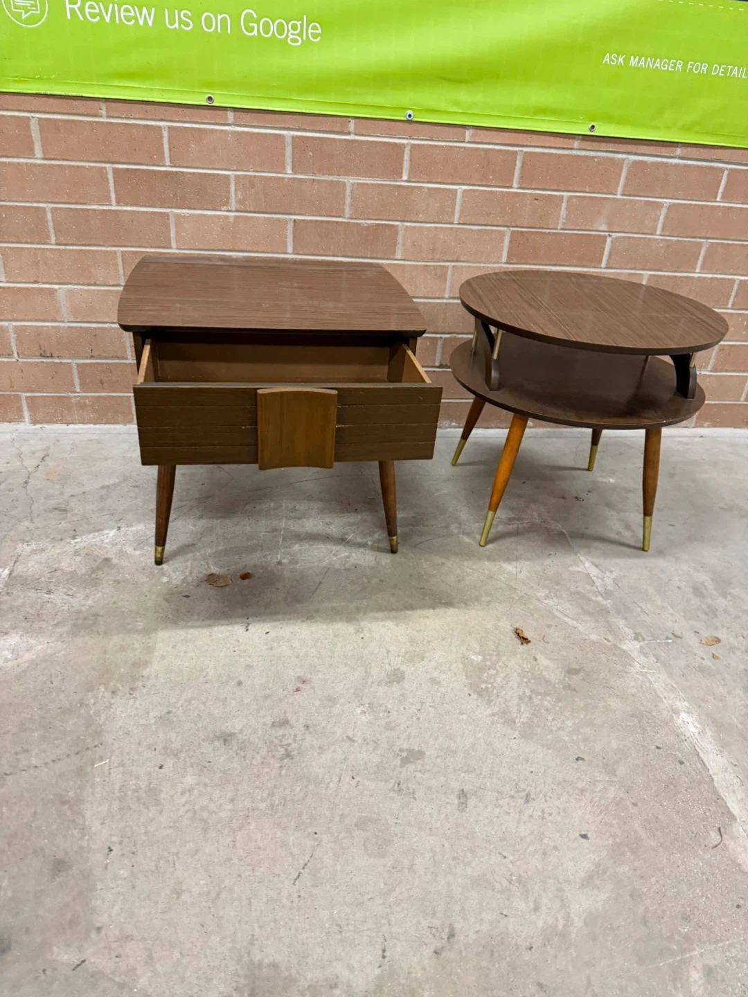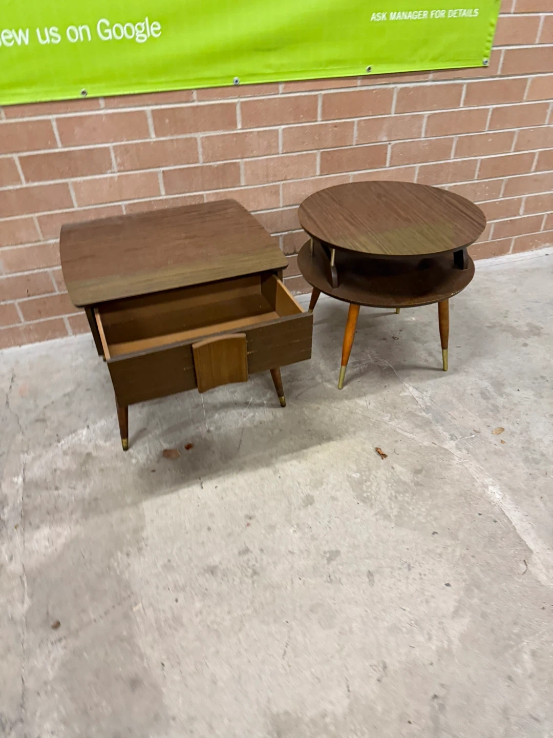 Selling a set of two MCM side tables. One is square with a drawer, and the other is round with two tiers.