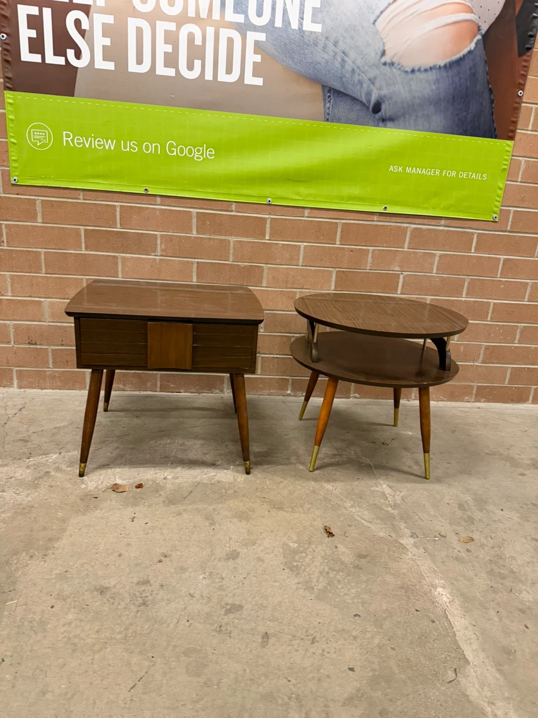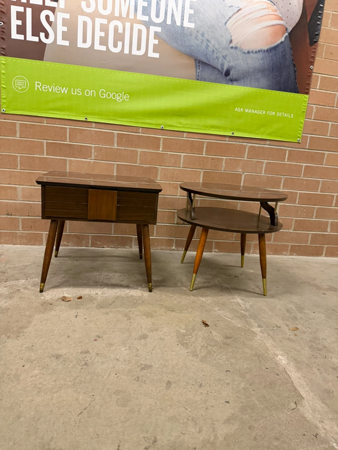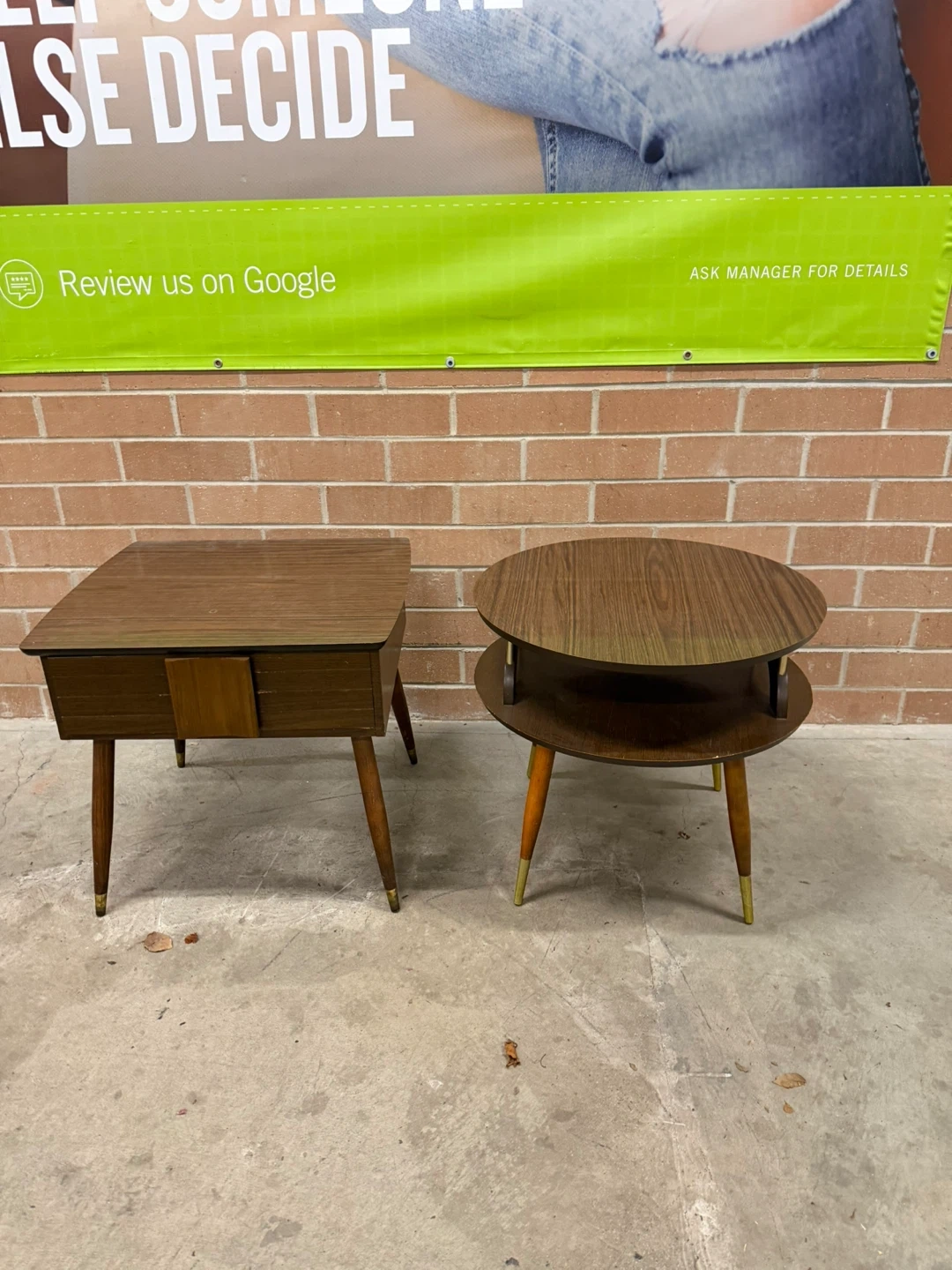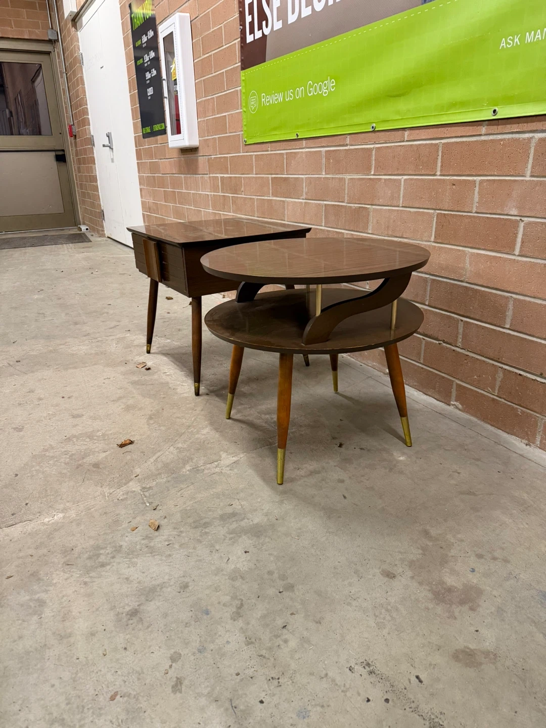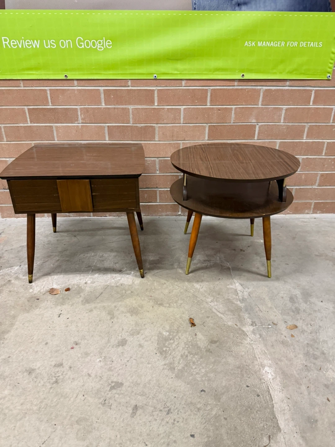 Selling a set of two MCM side tables. One is square with a drawer, and the other is round with two tiers.