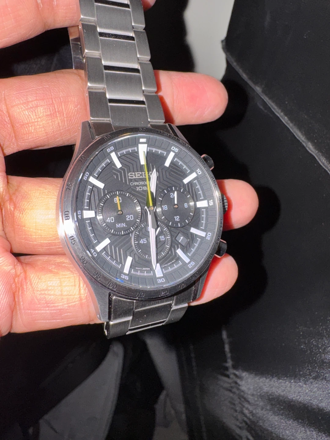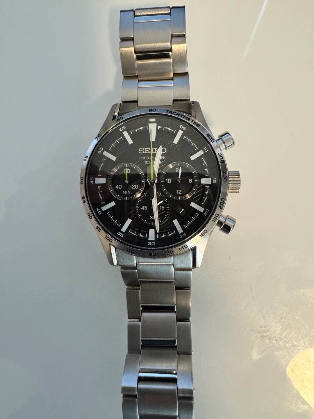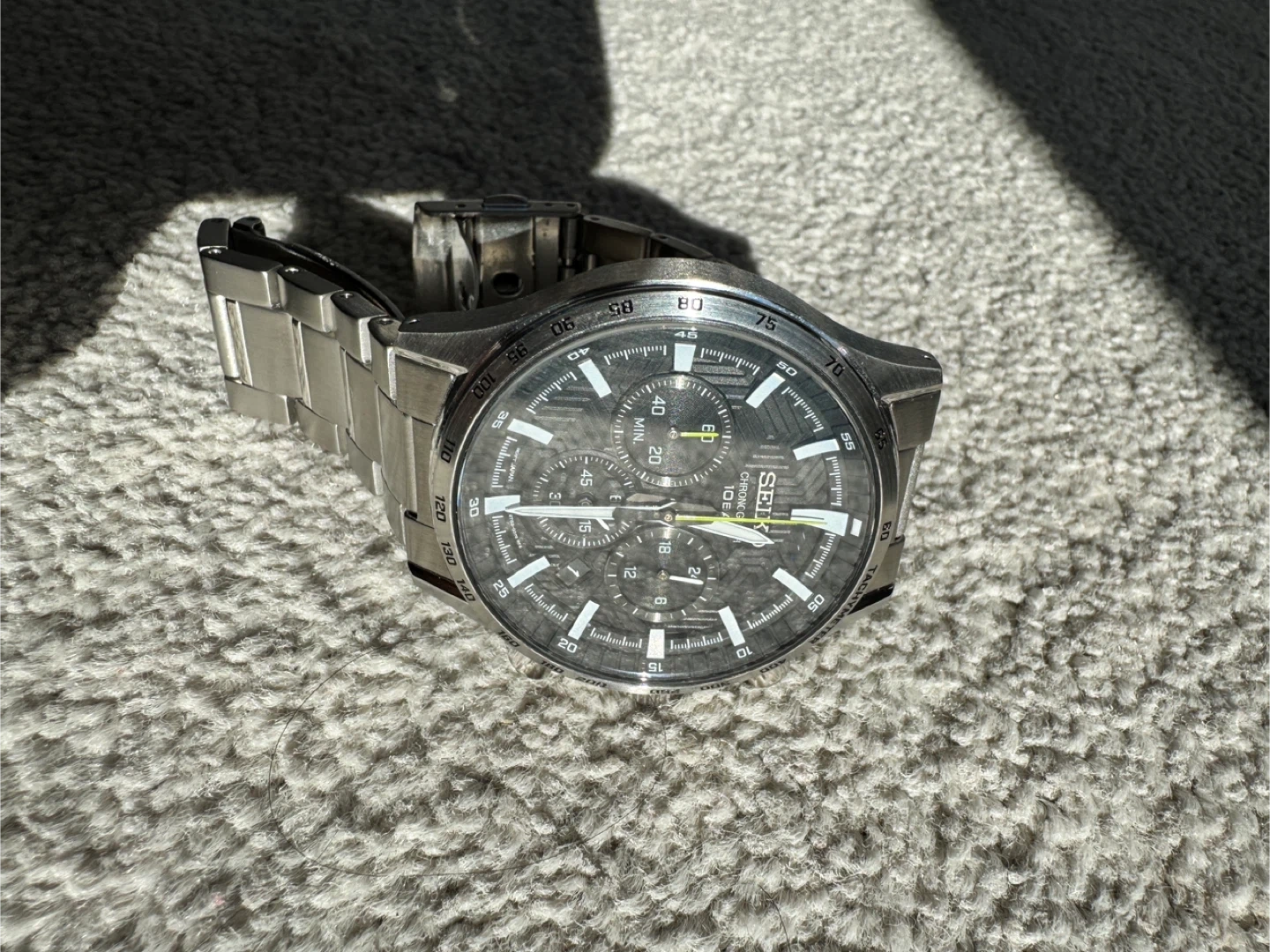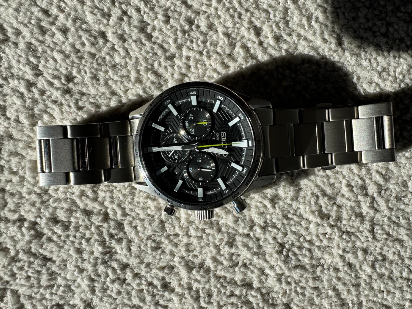 Selling a Seiko Chronograph watch! It's in great condition and features a stainless steel band. The watch is water resistant to 10 bar. A stylish and reliable timepiece!