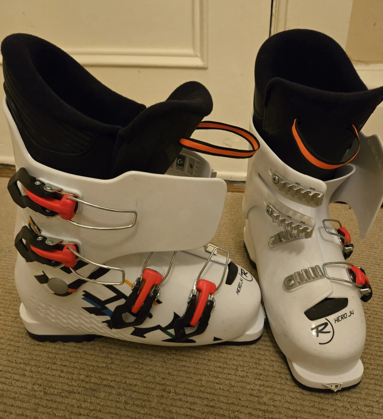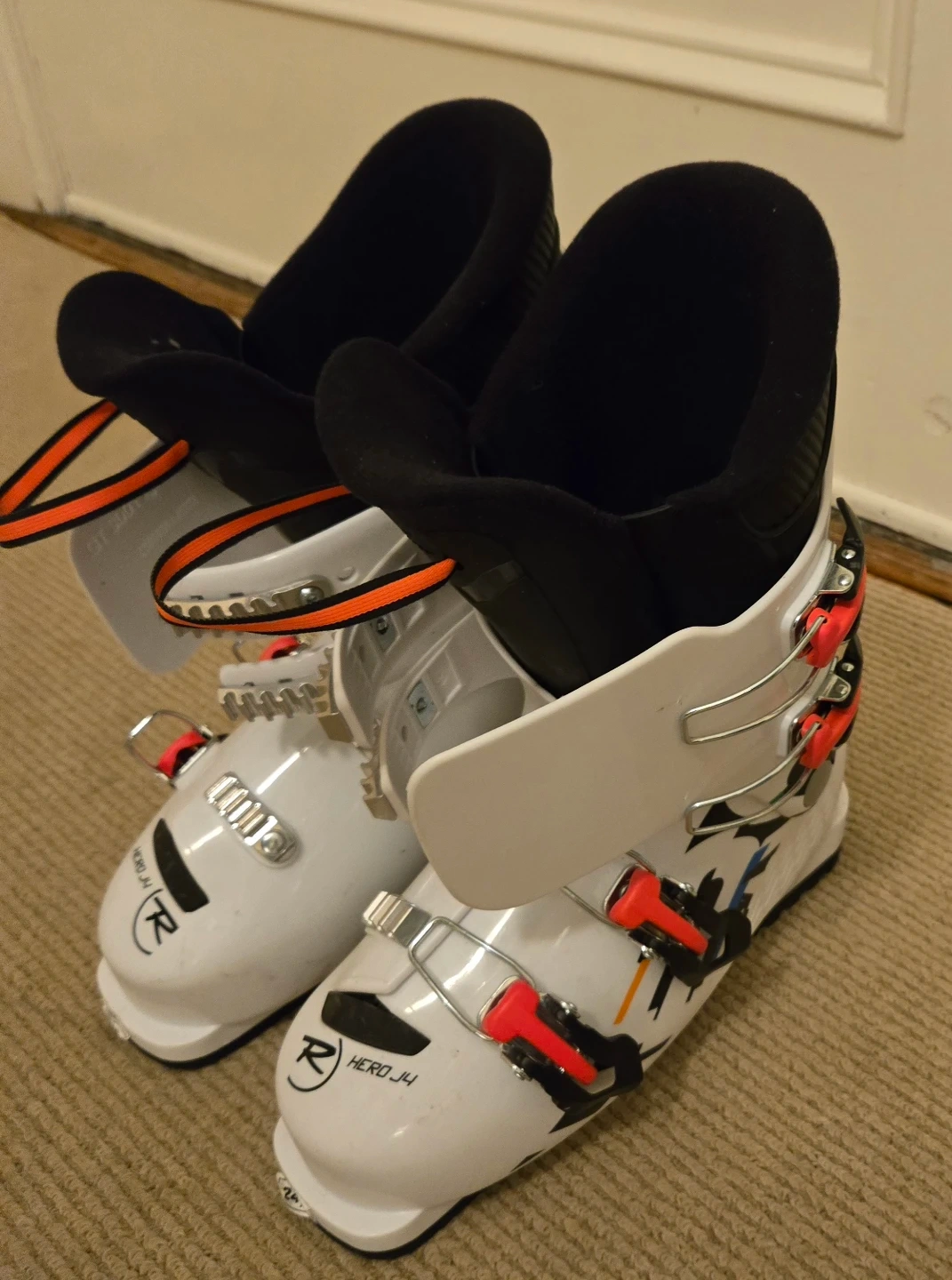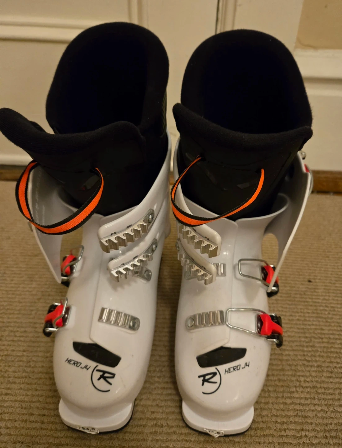 Selling a pair of Rossignol Hero J4 downhill ski boots, white, 24.5 MP. They're in great condition (they've only been worn once!) and are ready for the slopes!