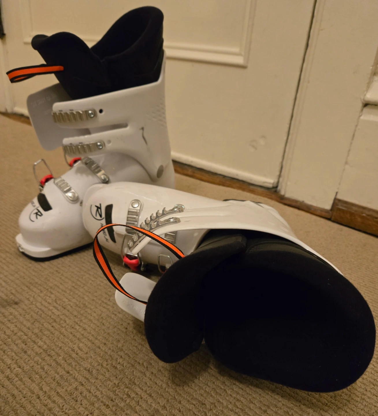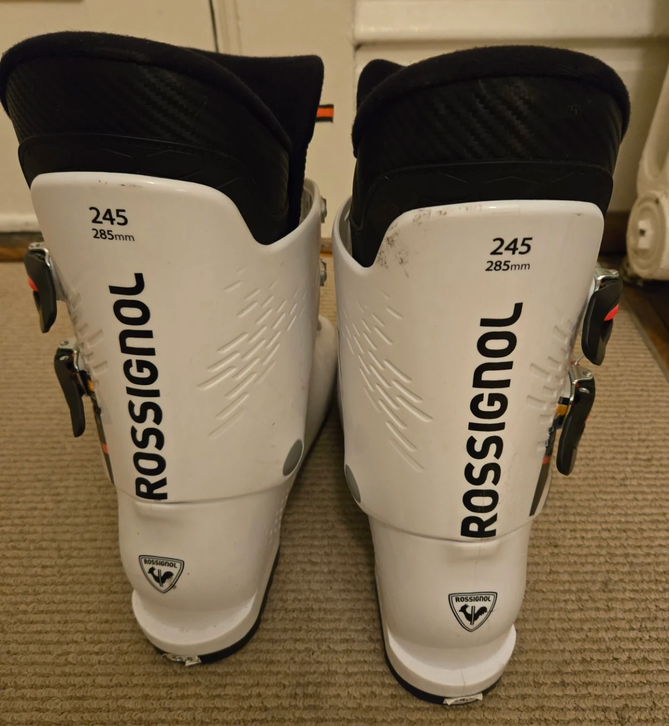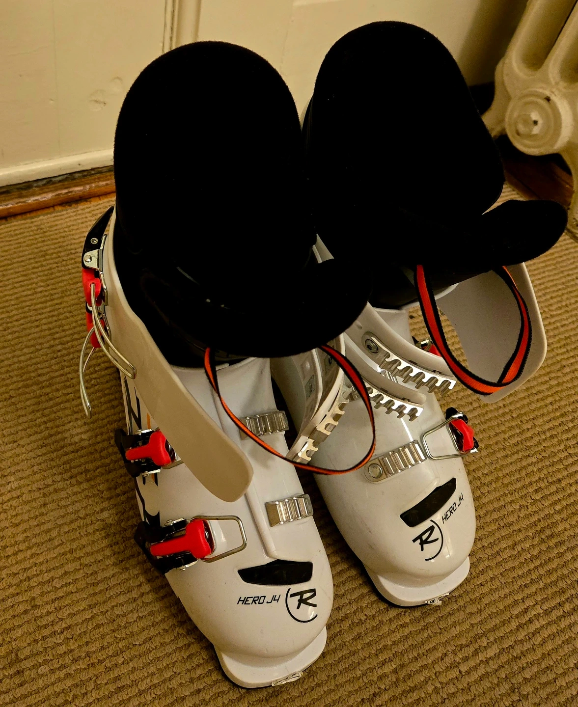 Selling a pair of Rossignol Hero J4 downhill ski boots, white, 24.5 MP. They're in great condition (they've only been worn once!) and are ready for the slopes!