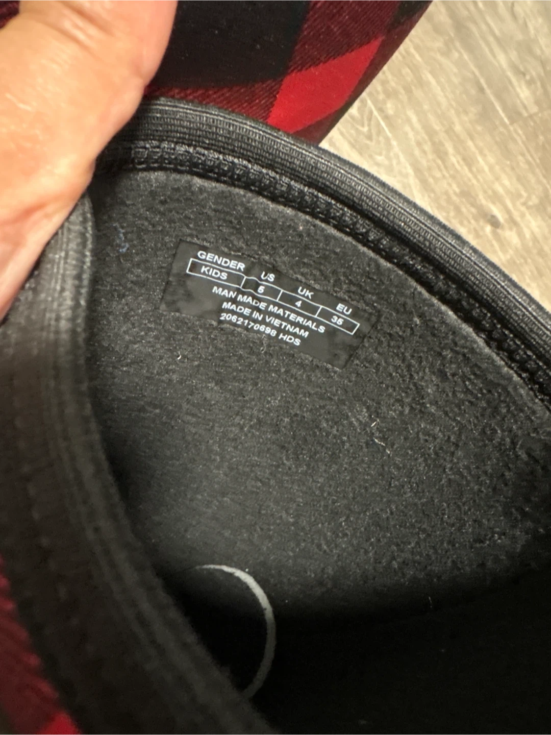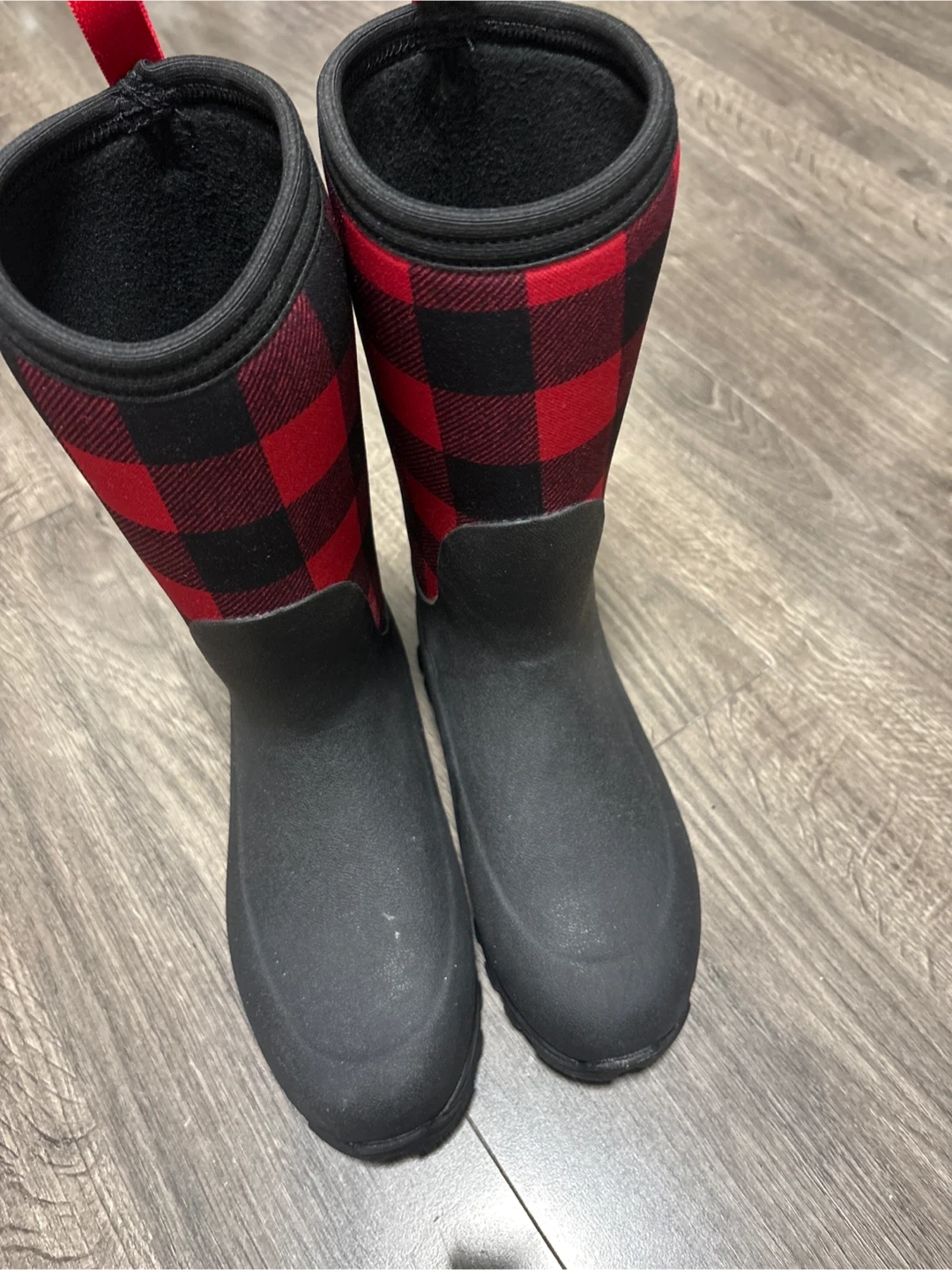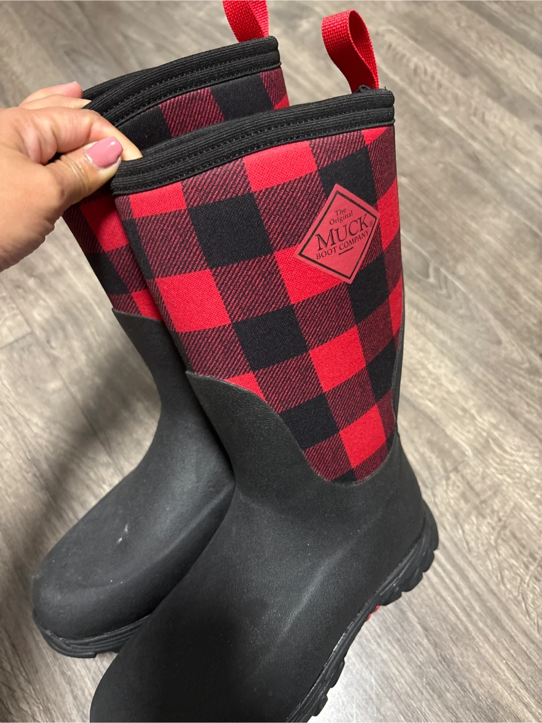 Selling a pair of Muck Boot Company kids boots in size US 6. They have a red and black plaid pattern on the upper part of the boot. These boots are made with man-made materials and are perfect for keeping little feet warm and dry!