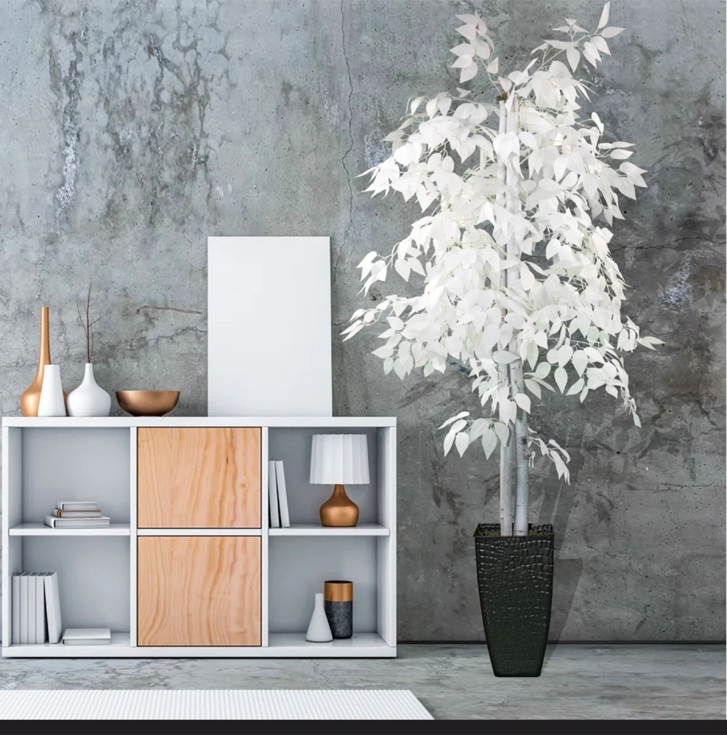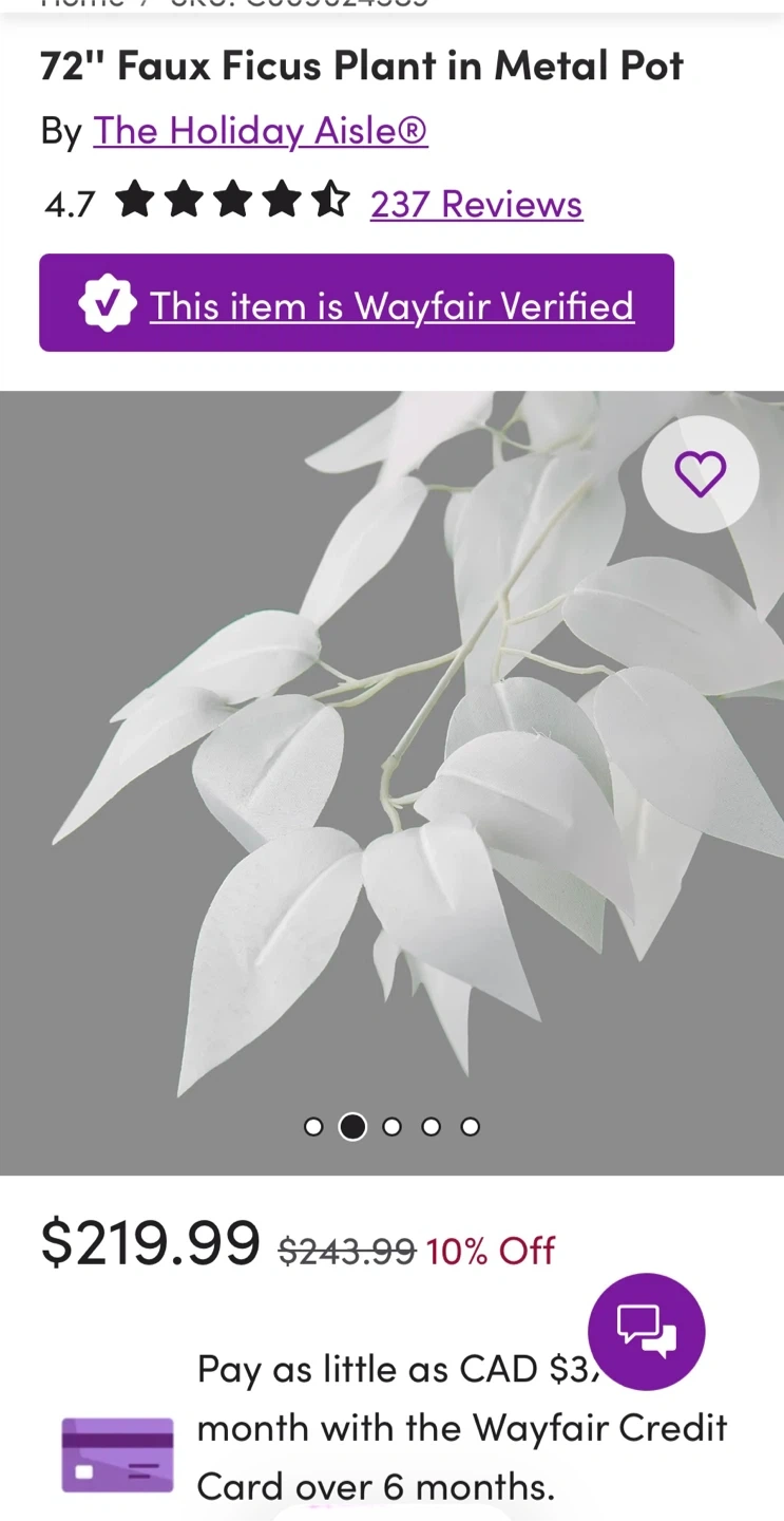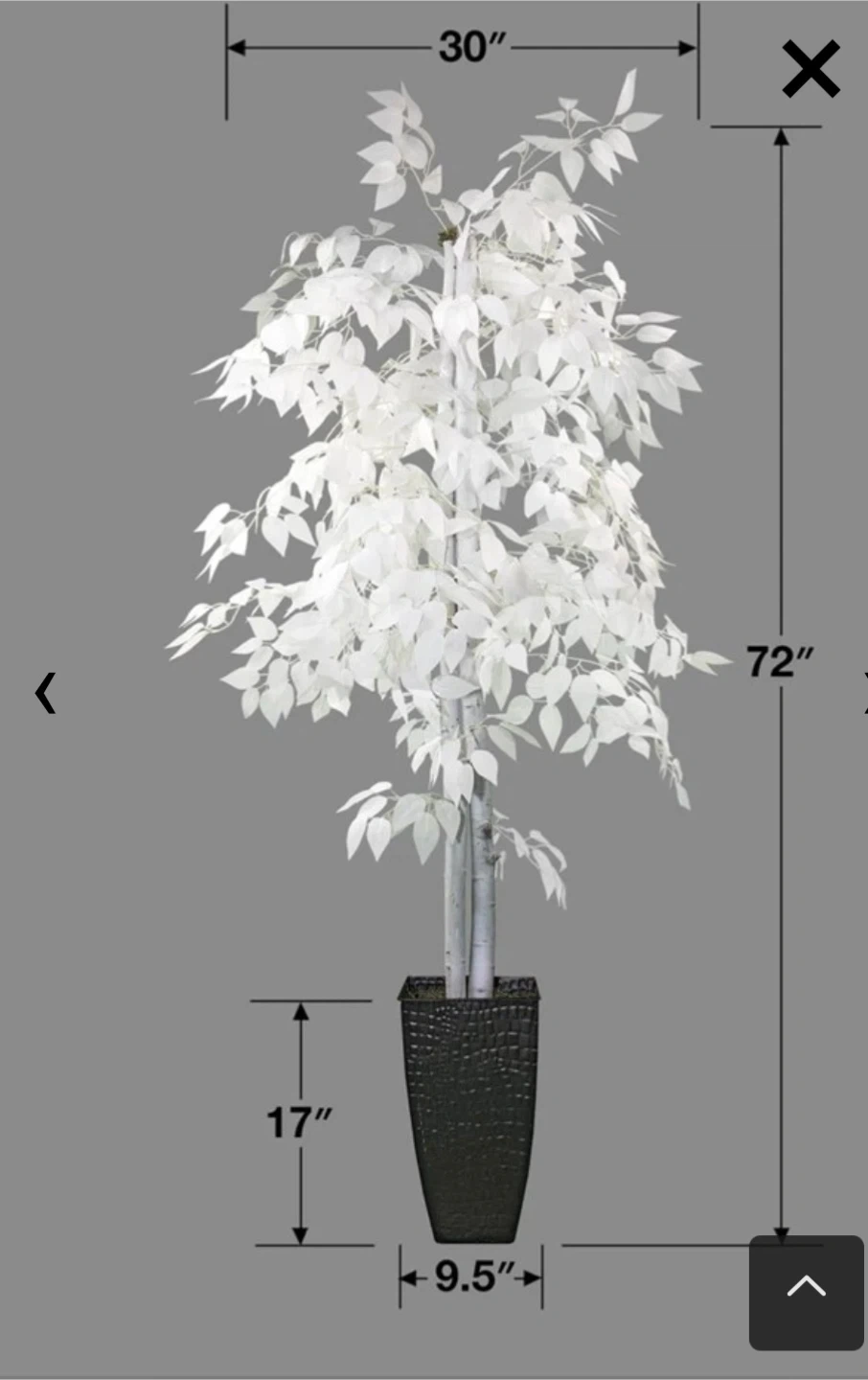Add a touch of elegance to your space with this beautiful Freeport Park 72” Faux White Ficus Plant in Metal Pot. It stands at 6 feet (72 inches) tall and 30 inches wide. The pot is 17 inches tall and 9.5 inches wide. Comes in its original box! Retails for $240