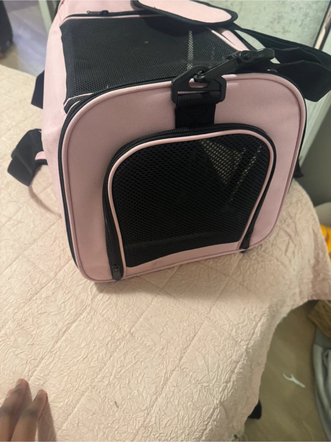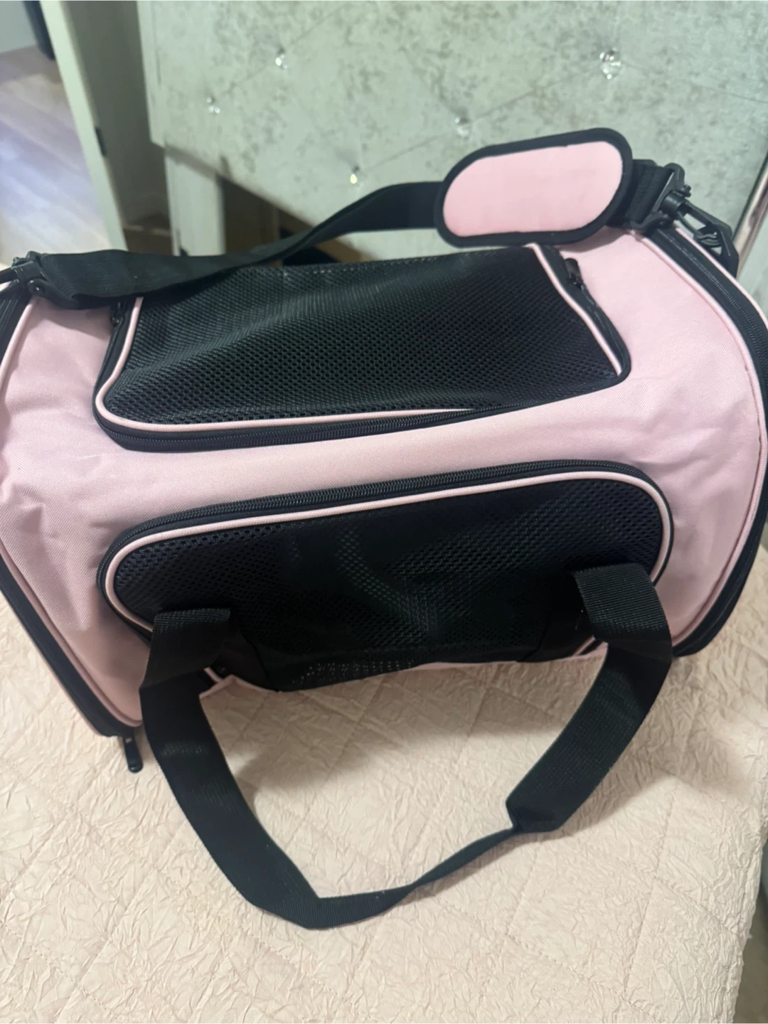 Selling a gently used pet carrier in pink and black! It's in great condition and perfect for small dogs or cats. It's lightweight and easy to carry, making trips to the vet or short travels a breeze