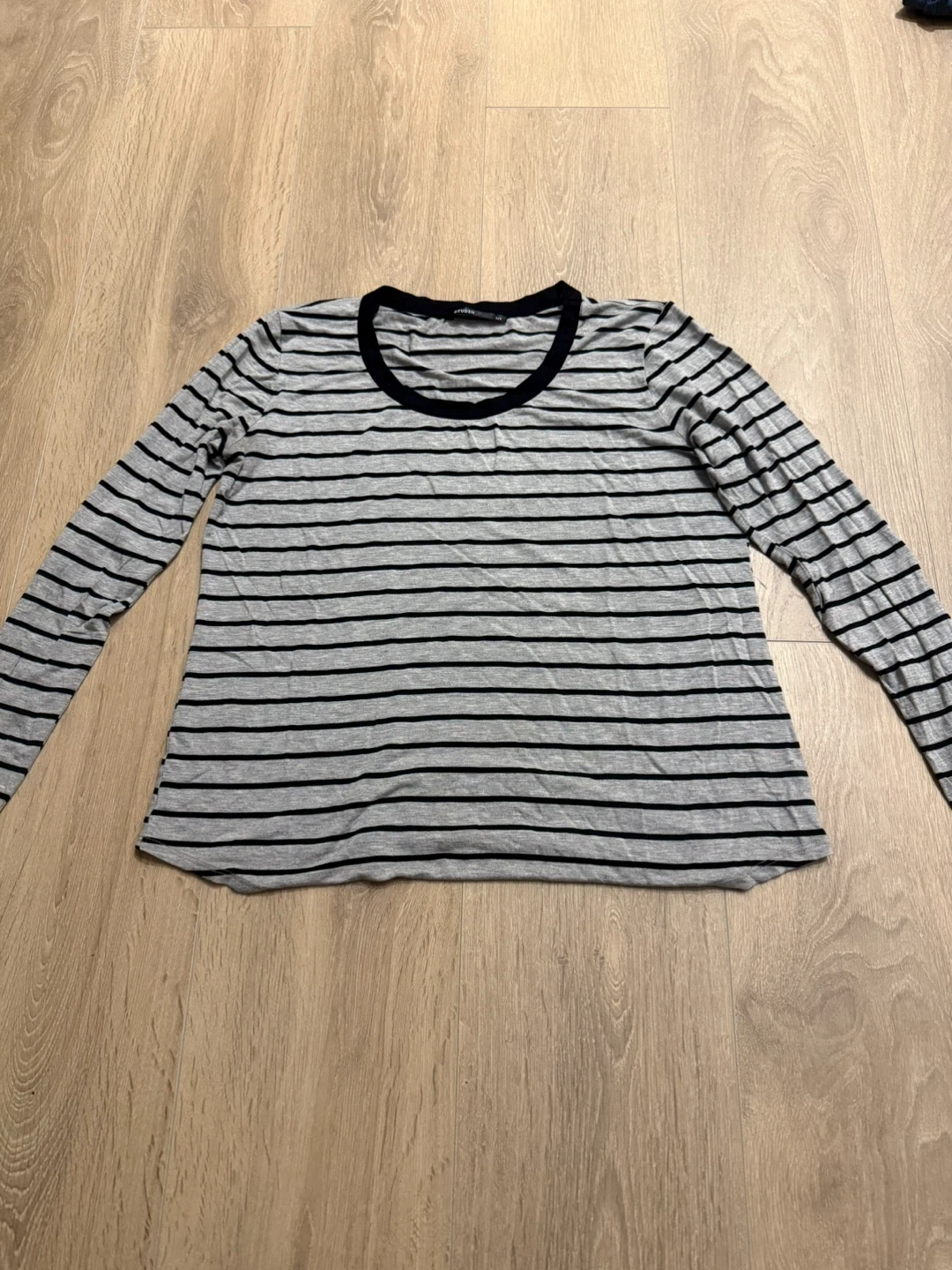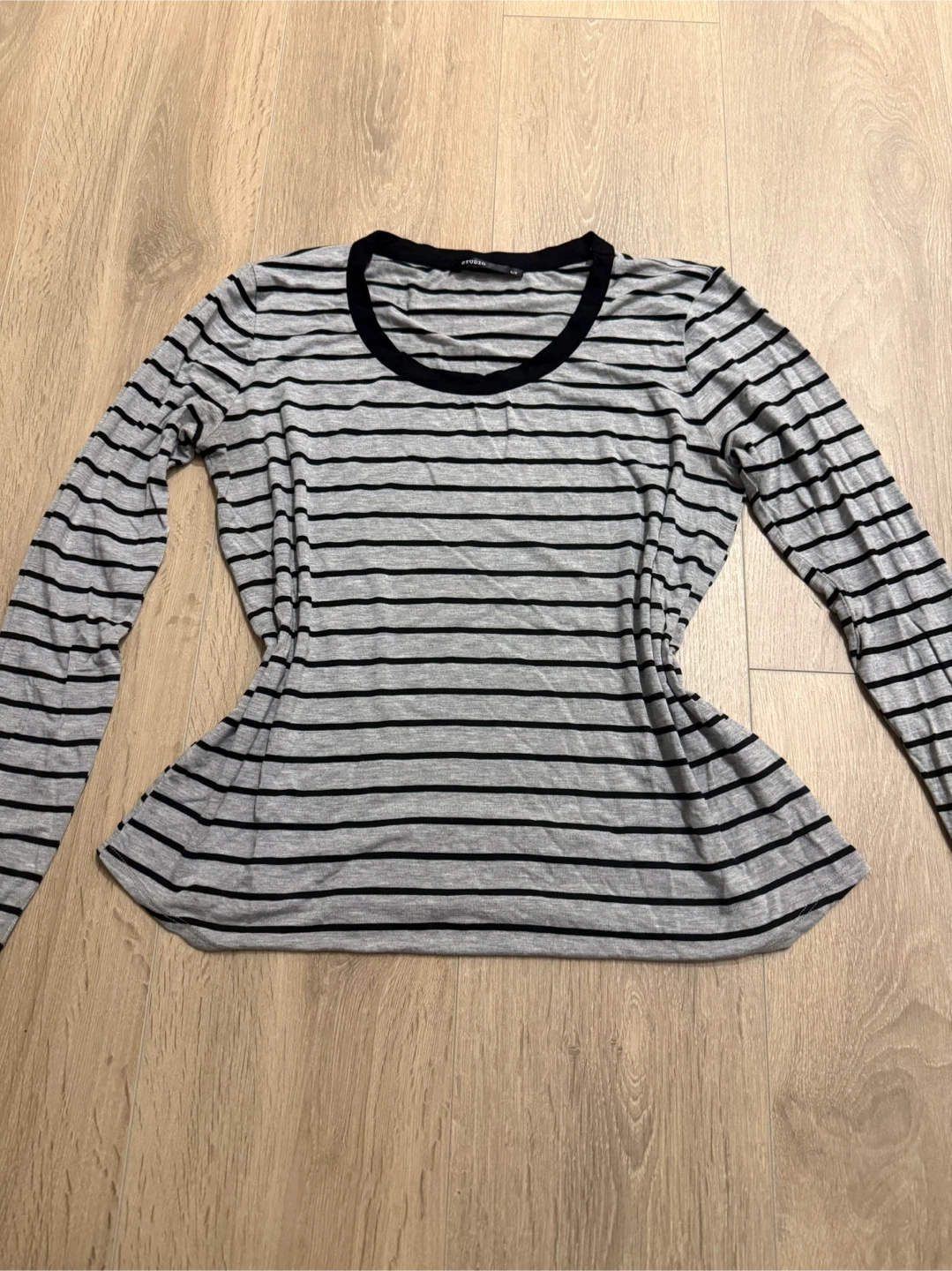 Here's a cute Studio brand long-sleeve top! It features a grey and black striped pattern and is a size small. Never worn selling since im a student.
