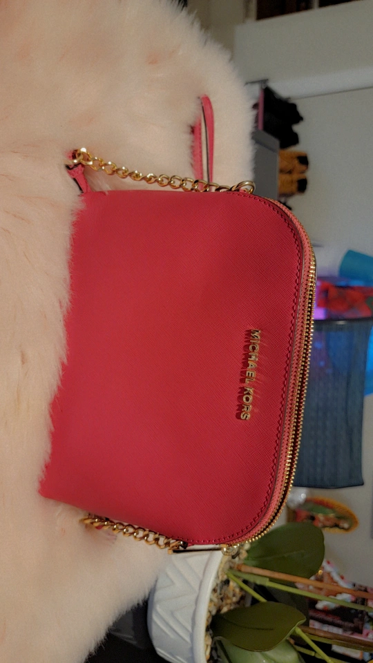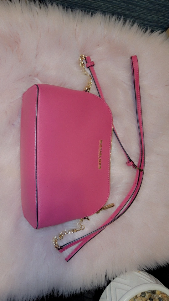 Selling a cute Michael Kors crossbody bag in a vibrant pink color! It's perfect for adding a pop of color to any outfit. The bag features a gold chain strap and a zip closure. It's in great condition and ready for a new owner!