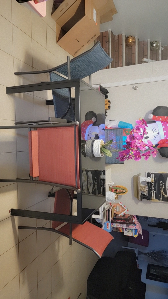 Selling a complete dining set! This set includes a sleek table with a glass top and four comfortable chairs. The chairs have a durable metal frame and weather-resistant fabric.