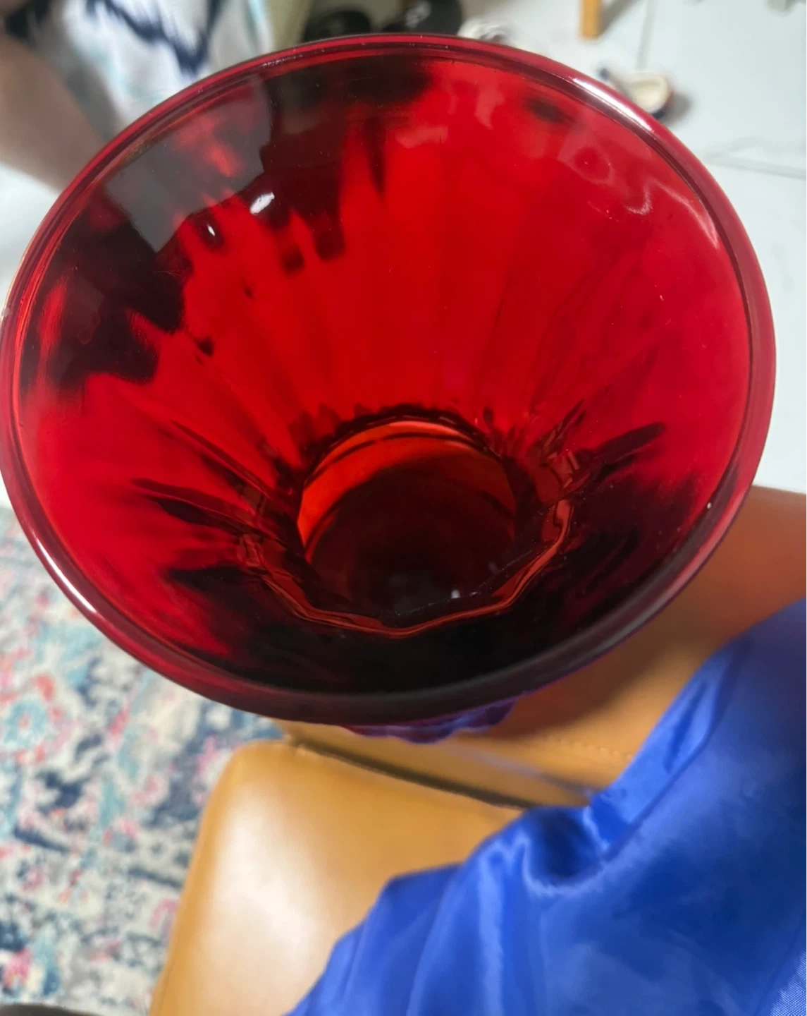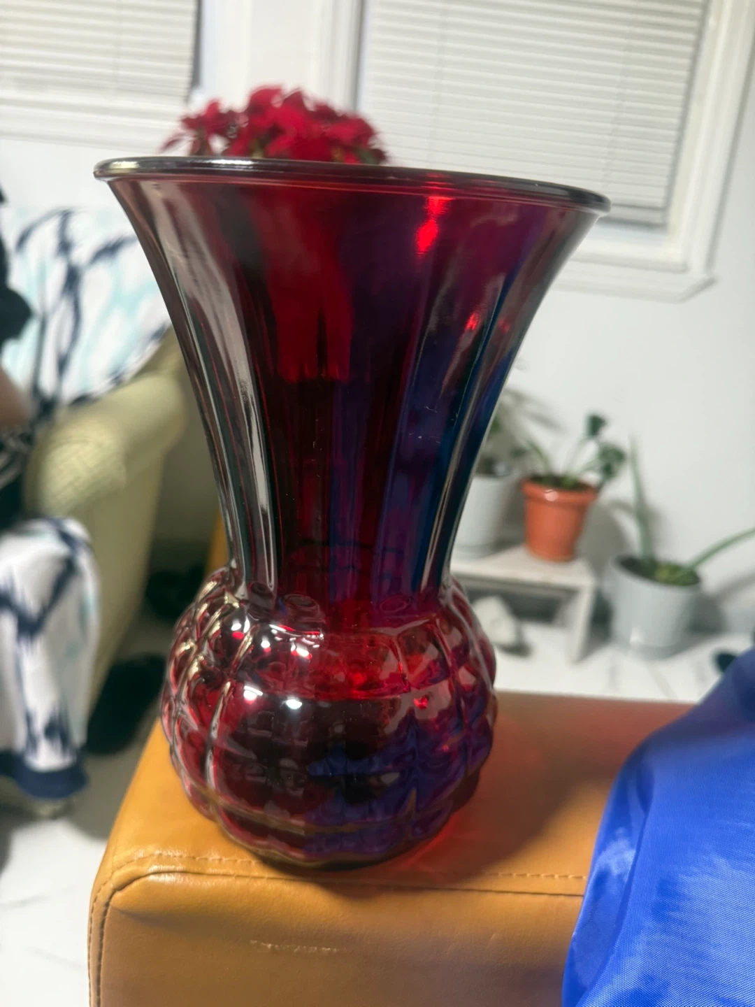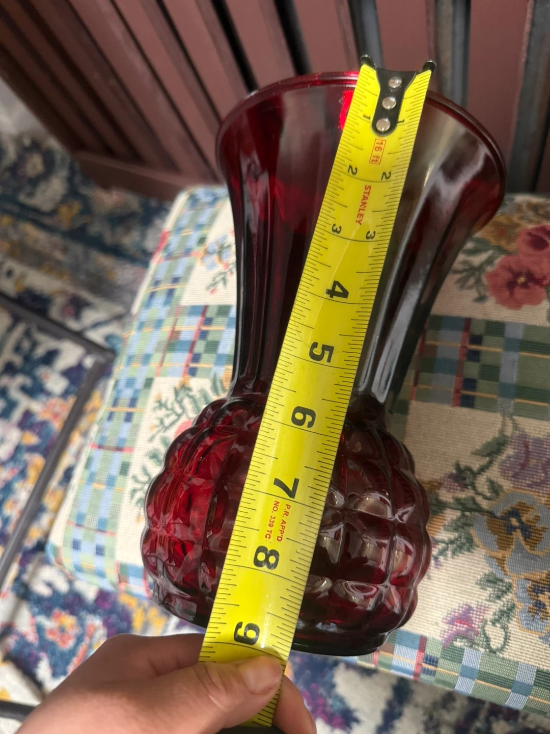 I'm selling a beautiful red glass vase! It's approximately 9 inches tall and would look great with any bouquet of flowers.