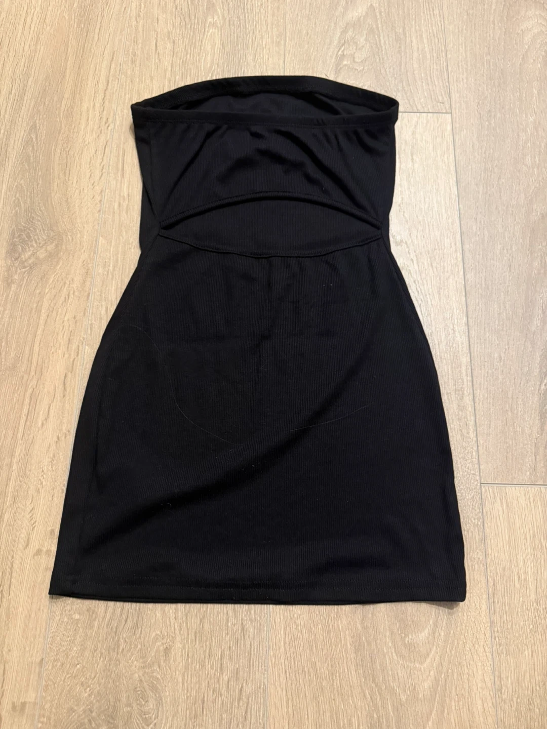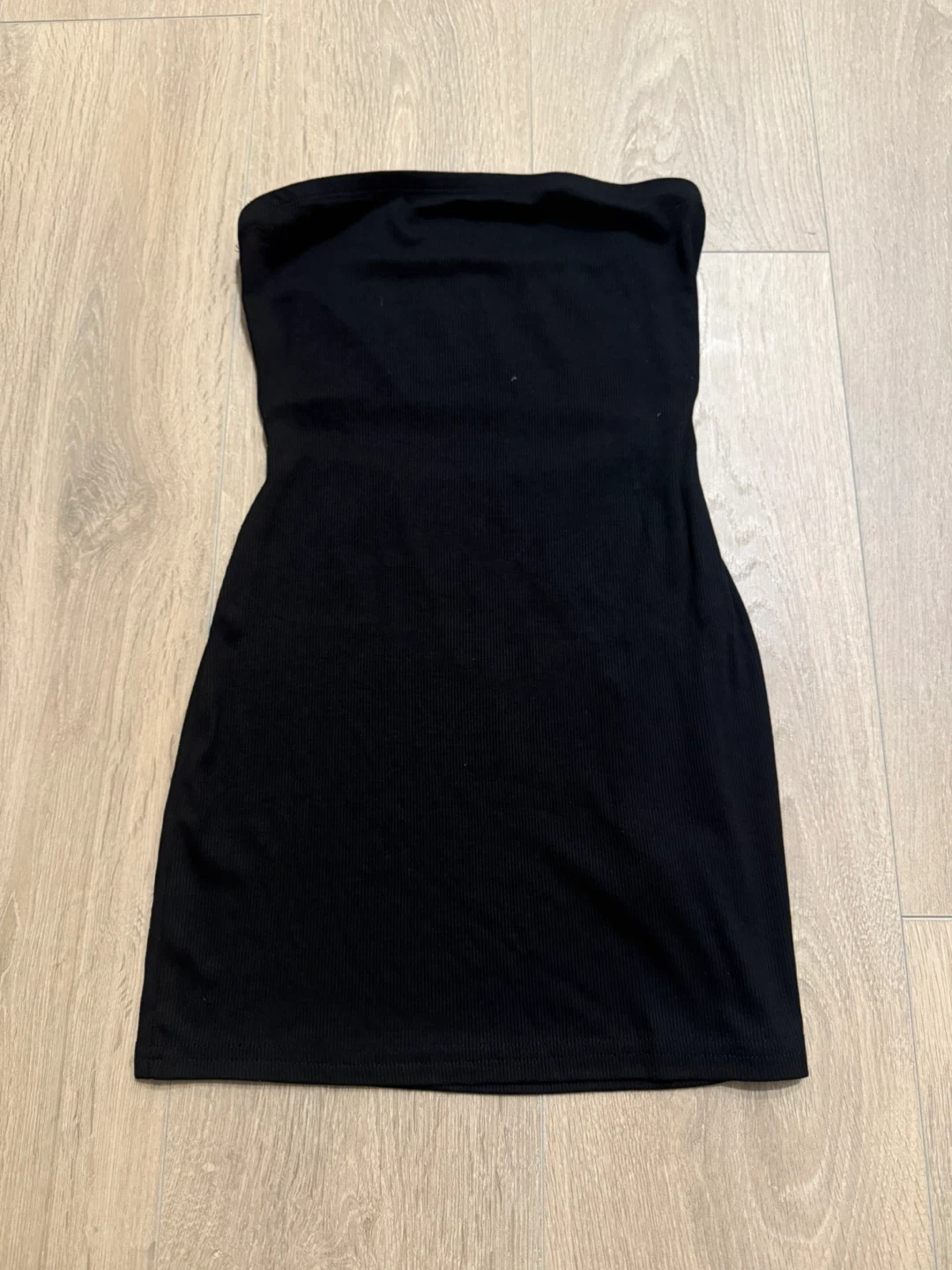 Here's a cute black strapless mini dress in size XS/S! It's in great condition and perfect for a night out or a casual day. The material is soft and comfortable, making it a great addition to your wardrobe. Kept the price low since i don’t remember the exact brand. Selling it since im a student.