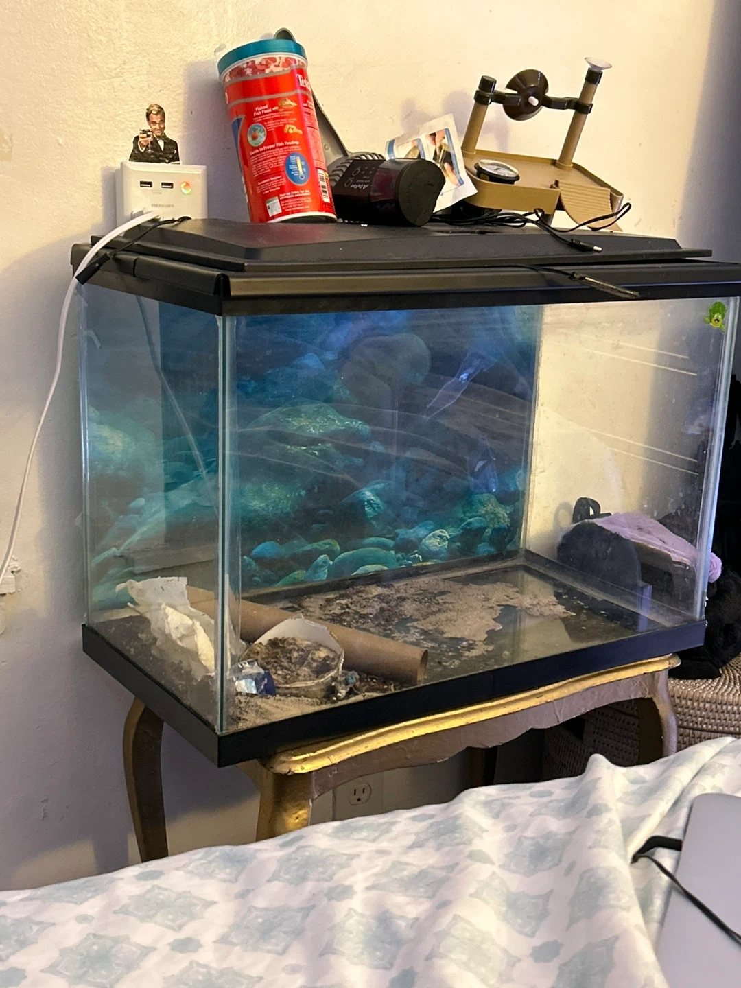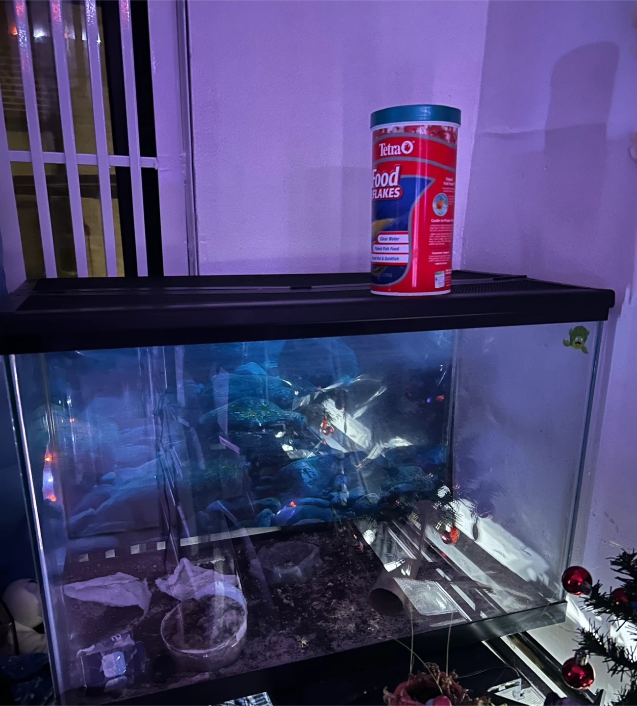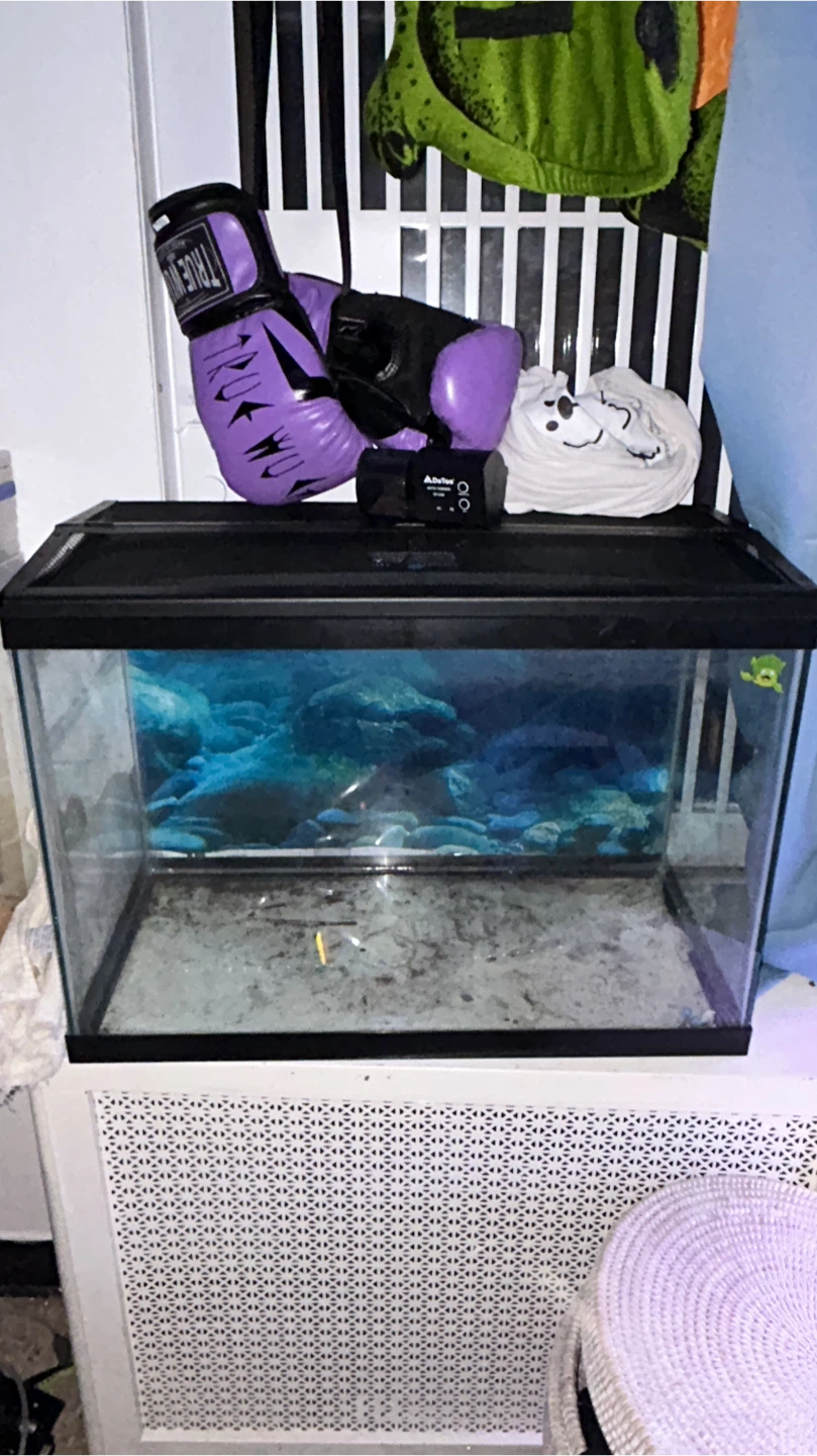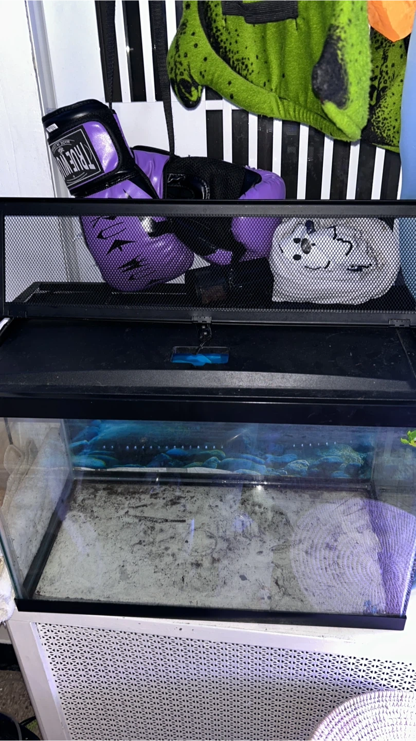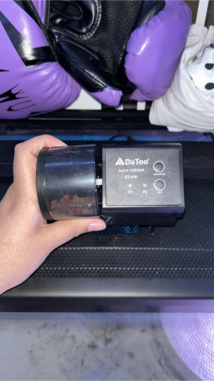 Selling 20 gallon fish tank with two lids one for reptile one for turtles or fish comes with food and other free items and a DaToo DT-638 auto fish feeder! It's in good condition and ready to keep your fish fed on a schedule. It features multiple settings for automatic feeding. With table