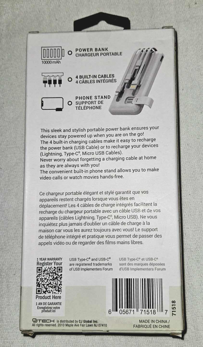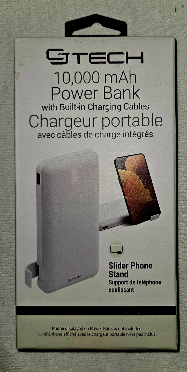 Selling a GTECH 10,000 mAh Power Bank. This sleek and stylish portable power bank ensures your devices stay powered up when you are on the go! It has 4 built-in charging cables (USB Cable) to recharge the power bank or your devices (Lightning, Type-C, Micro USB Cables). The convenient built-in phone stand allows you to make video calls or watch movies hands-free. Box included
