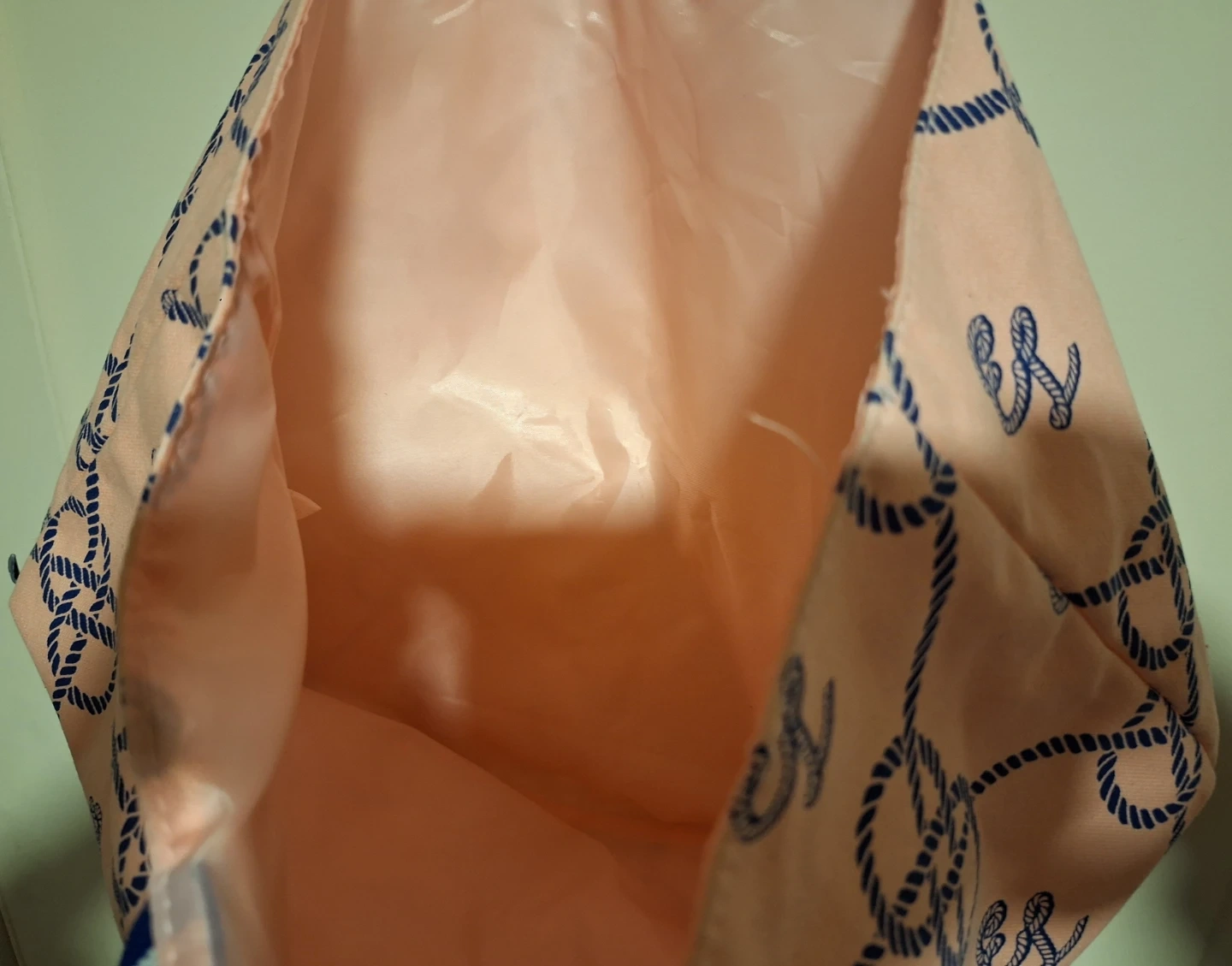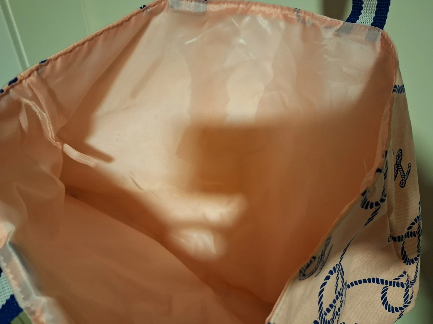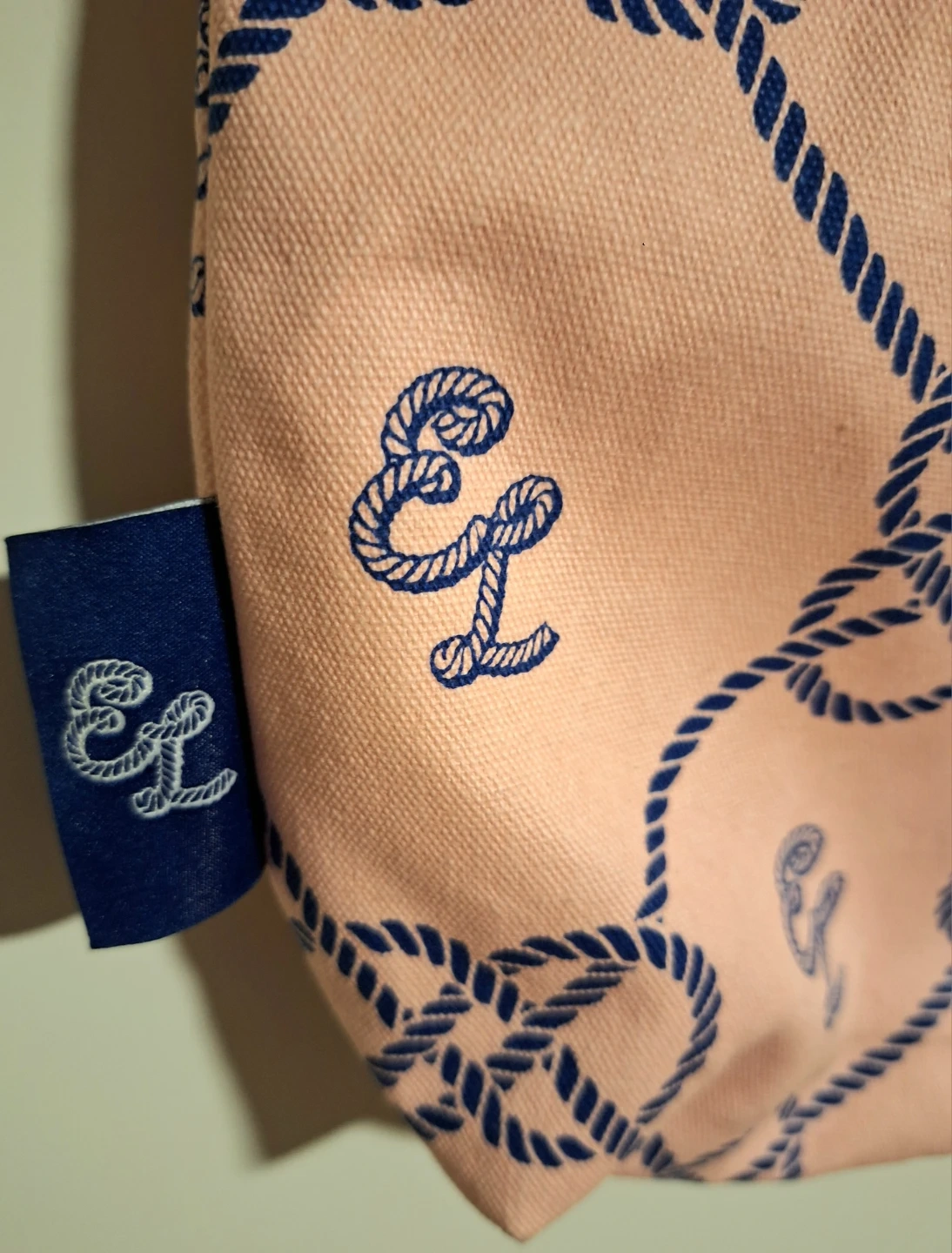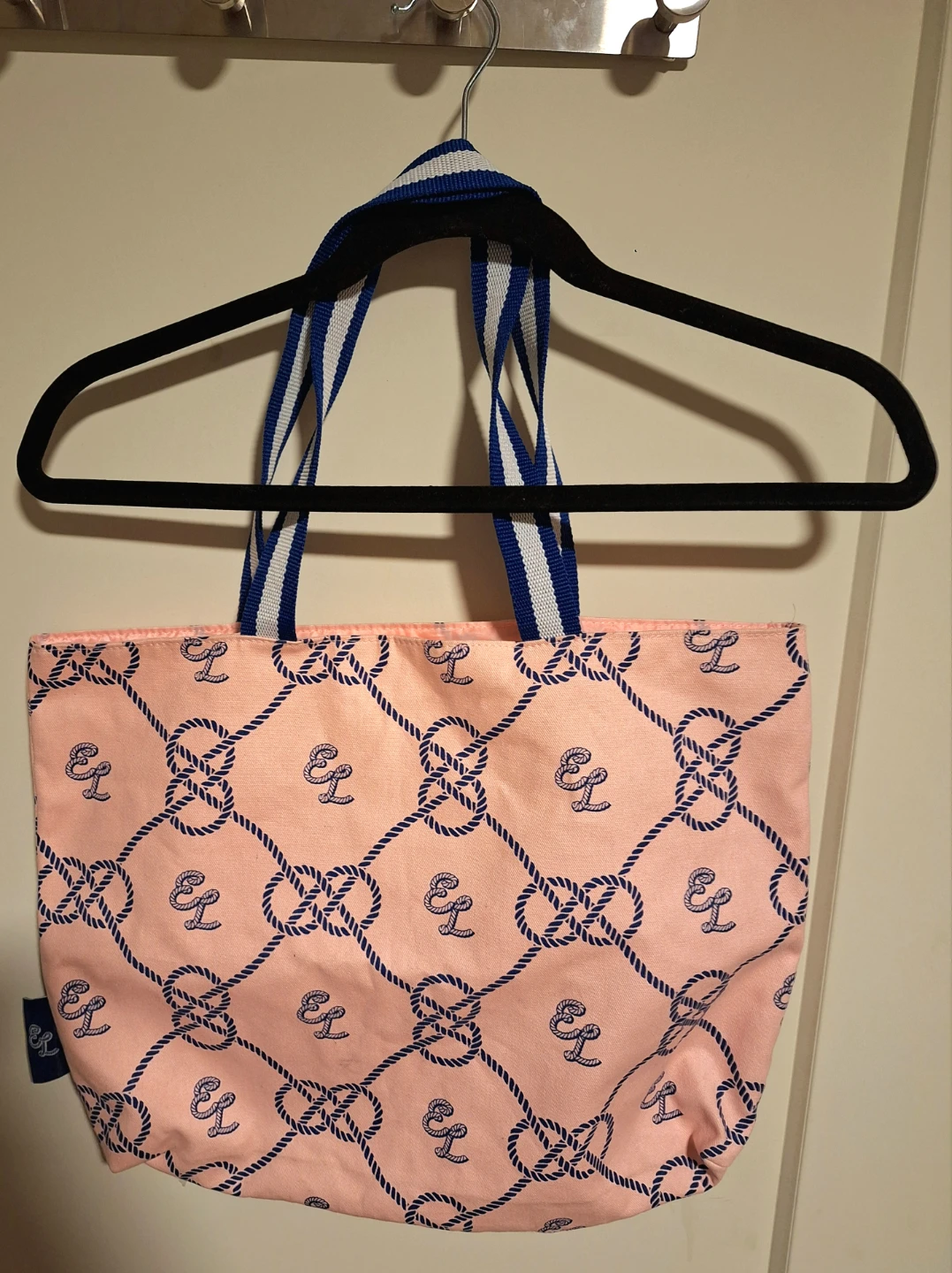 This is a cute EL tote bag featuring a pink exterior with a navy rope design and blue and white striped handles. It's in great condition and perfect for carrying your everyday essentials.