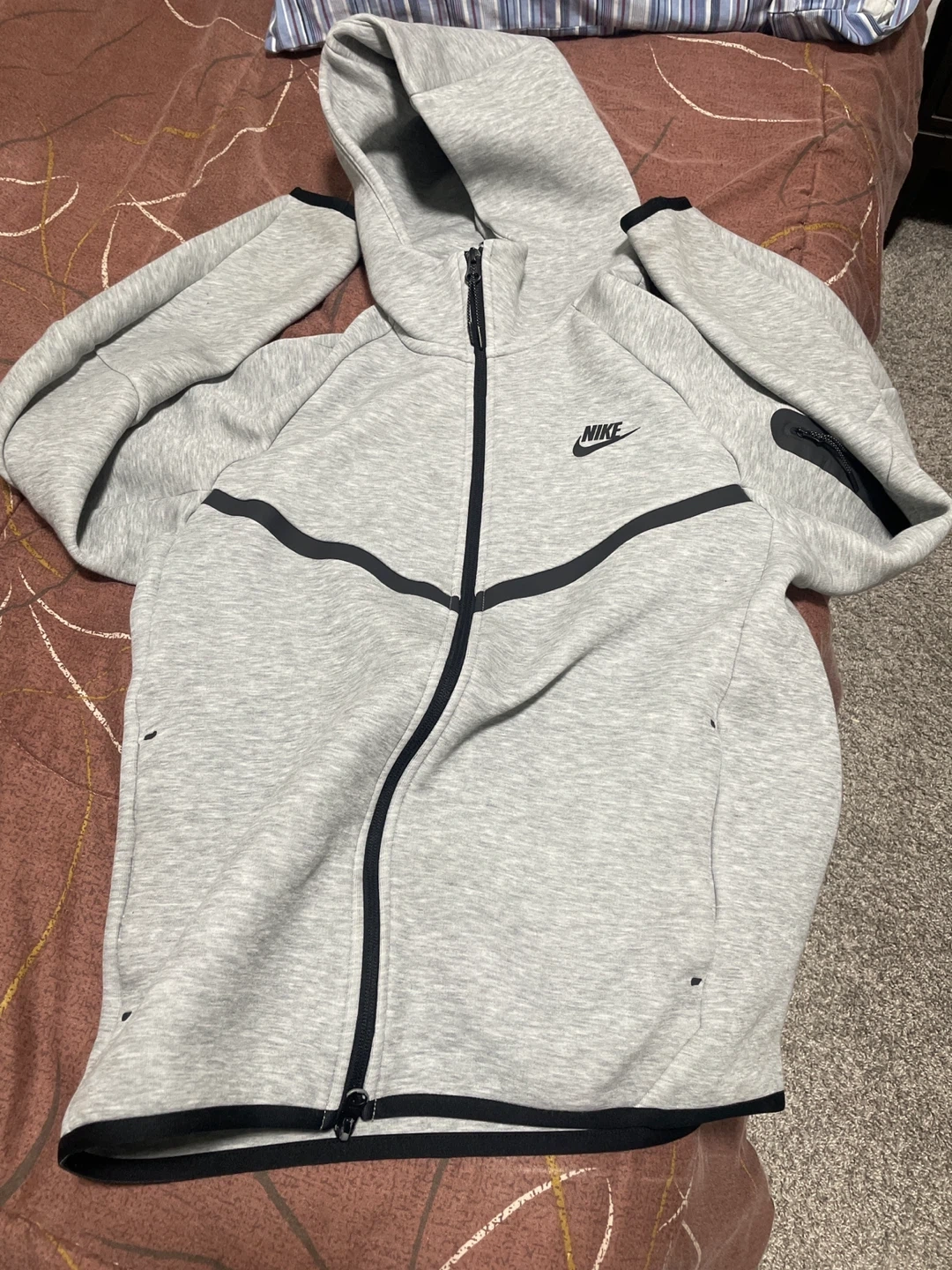 Selling a Nike Tech Fleece hoodie in grey. It's in great condition and super comfy for everyday wear!