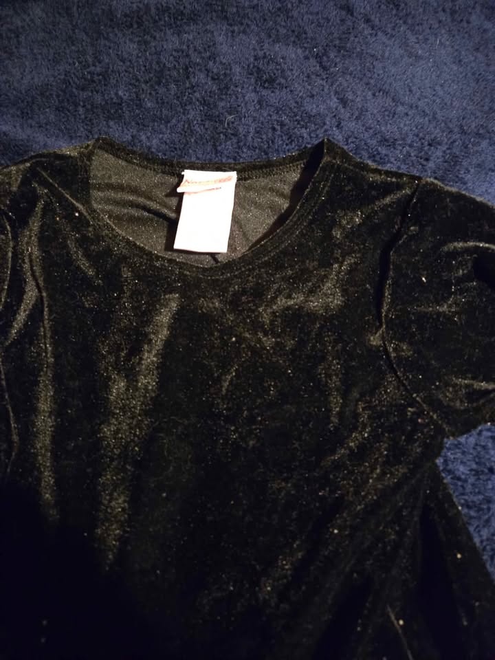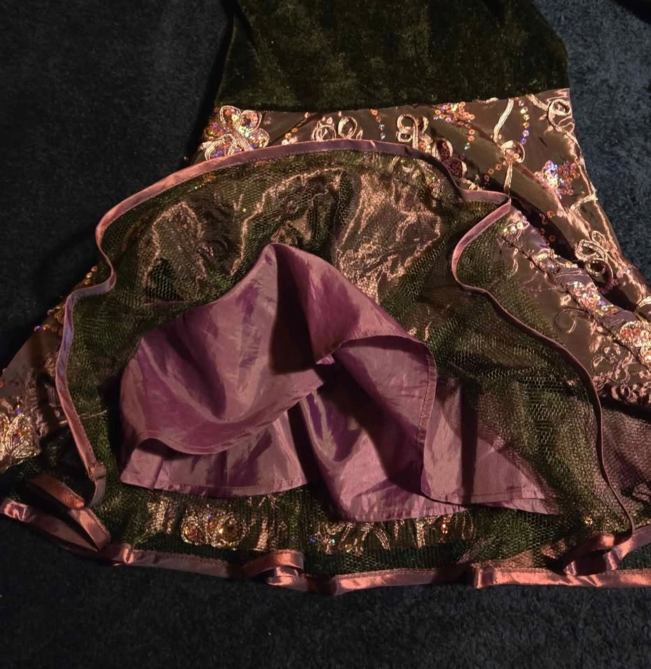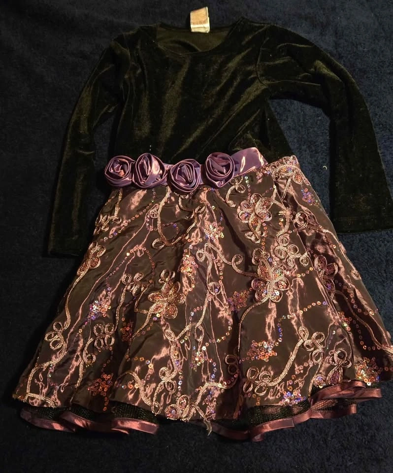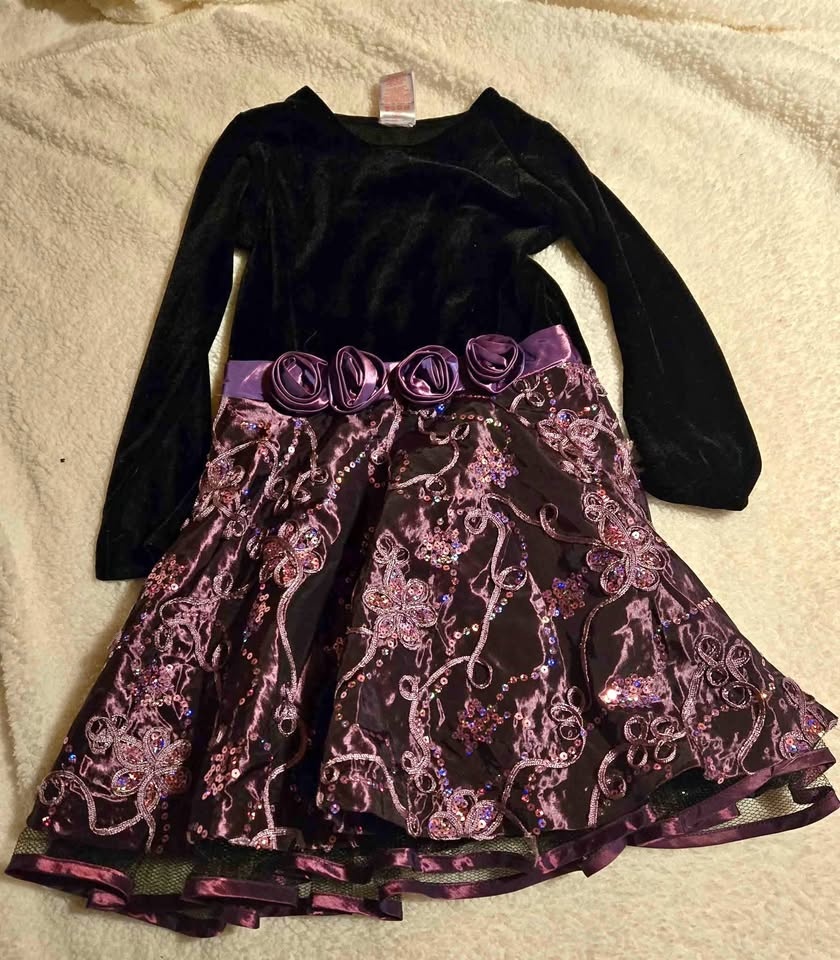 Nannette Girl party dress with black velour top and layered purple skirt. Sequin and cord pattern on the outer layer and floral details at the waist. Extra tulle on bottom of skirt for more fullness.