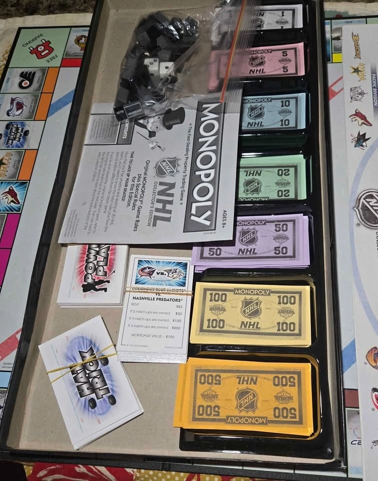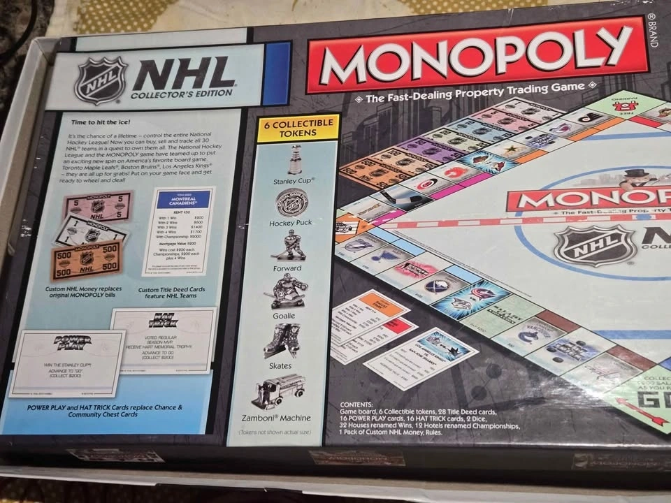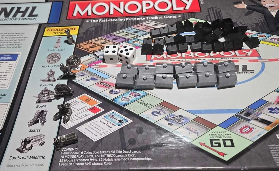 Includes game board, 6 collectible tokens, 28 Title Deed Cards, 16 POWER PLAY cards, 15 HAT TRICK cards 32 Houses, 12 Hotels, pack of custom NHL money and rules