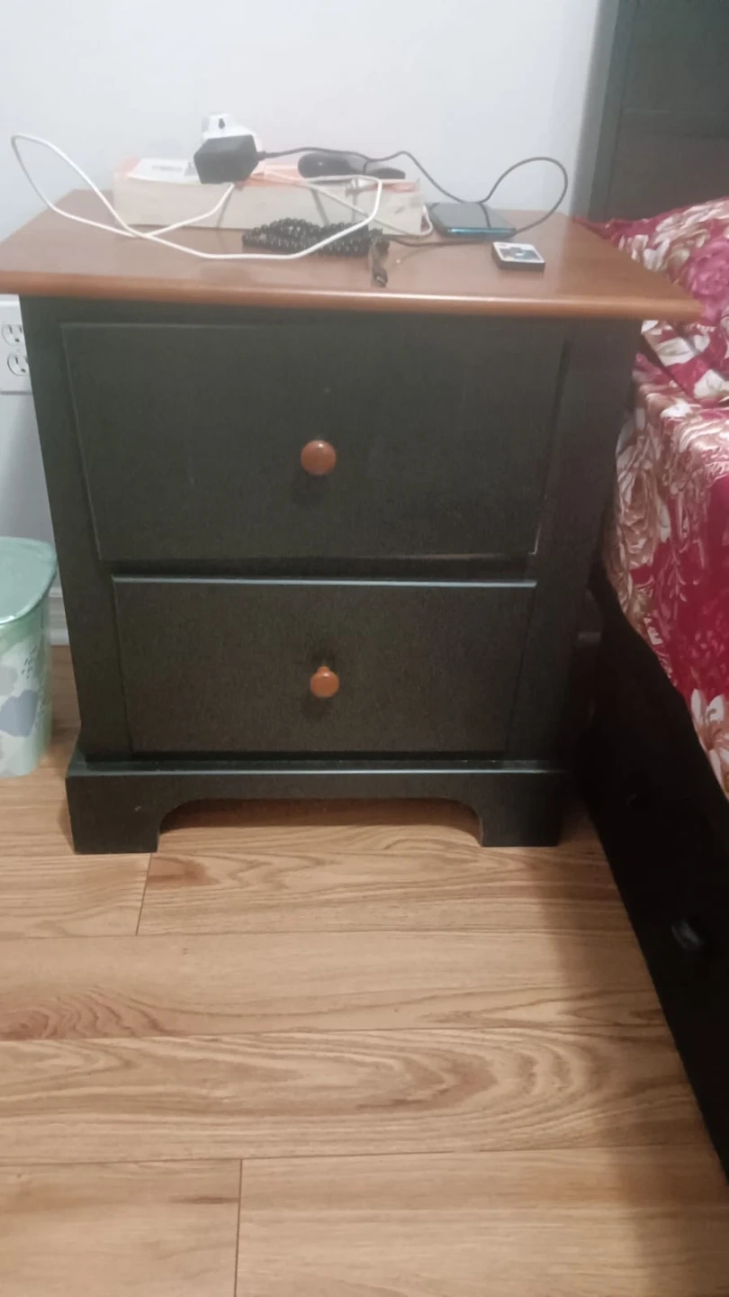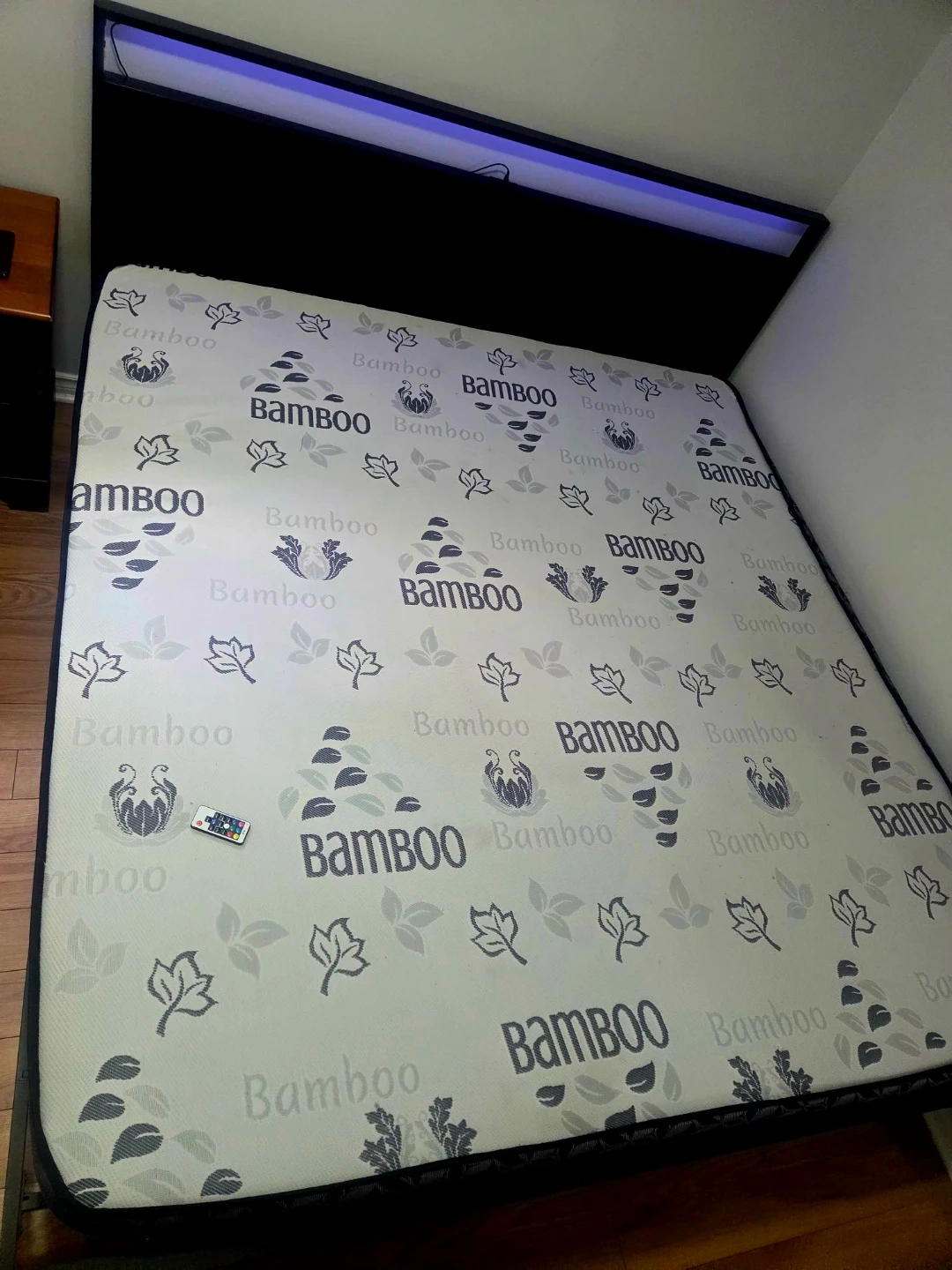 Selling a king-sized Bamboo mattress and a black bed frame. The mattress has a distinctive bamboo leaf pattern. It's in good condition and ready for a new home. Also included is a black nightstand with two drawers