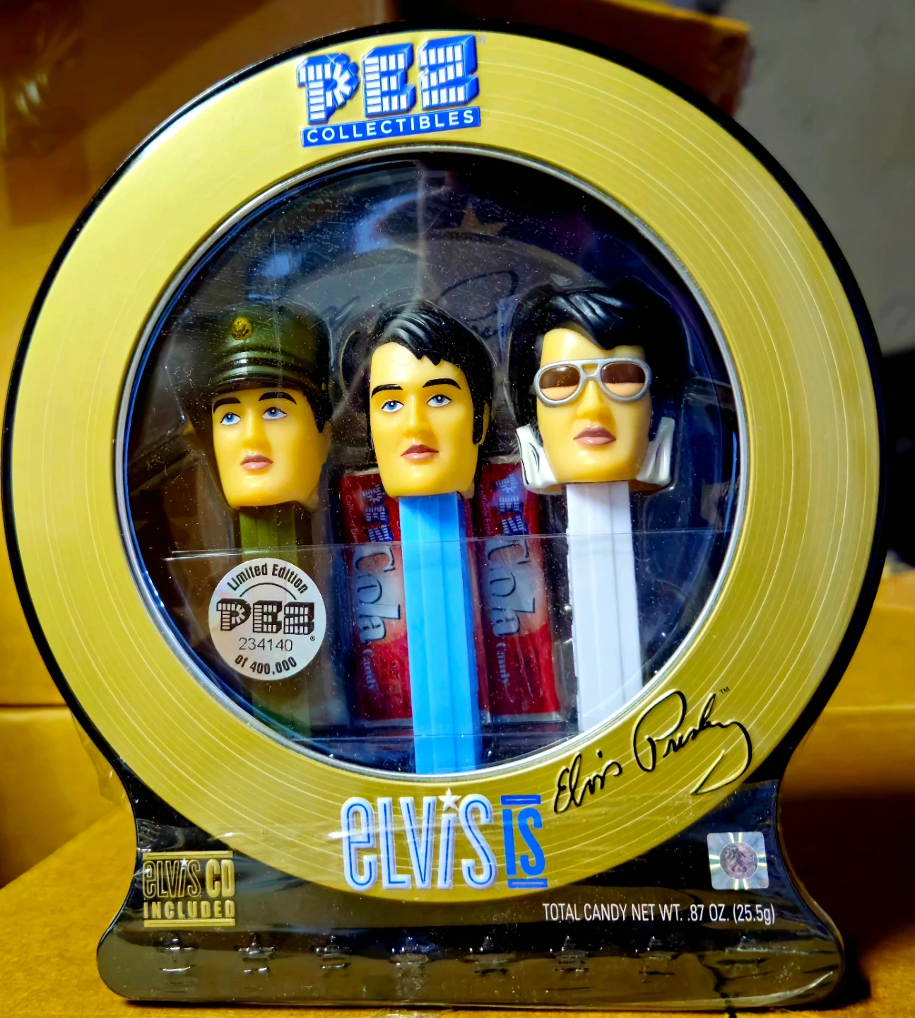 Selling a limited edition Elvis Presley Pez collectibles set! This set features three different Elvis characters. The box includes an Elvis CD and the total candy net weight is .87 oz (25.5g). It's a great addition to any Pez or Elvis collection